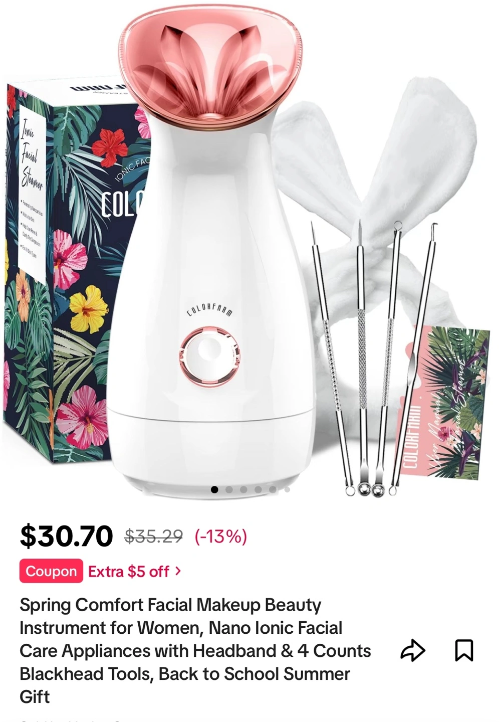 Facial steamer, headband, and four blackhead removal tools. Perfect for at home skincare.