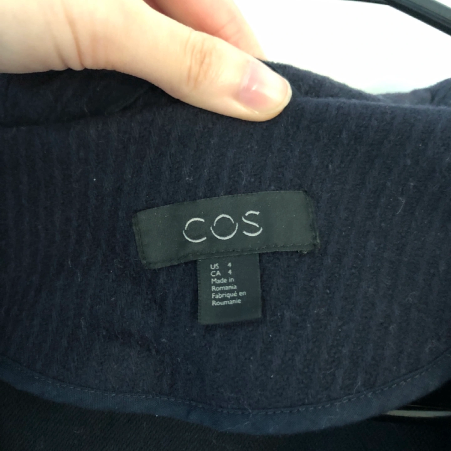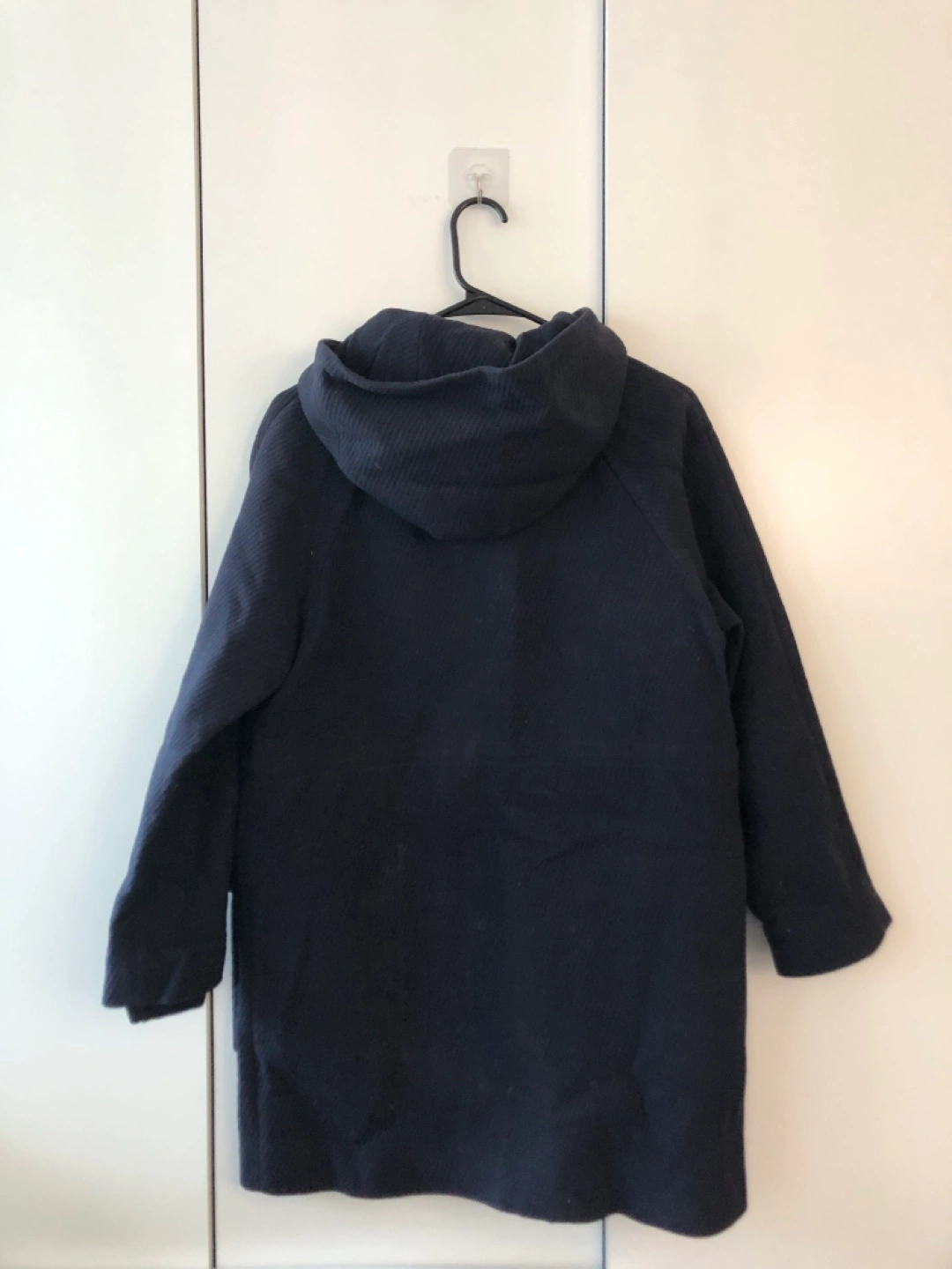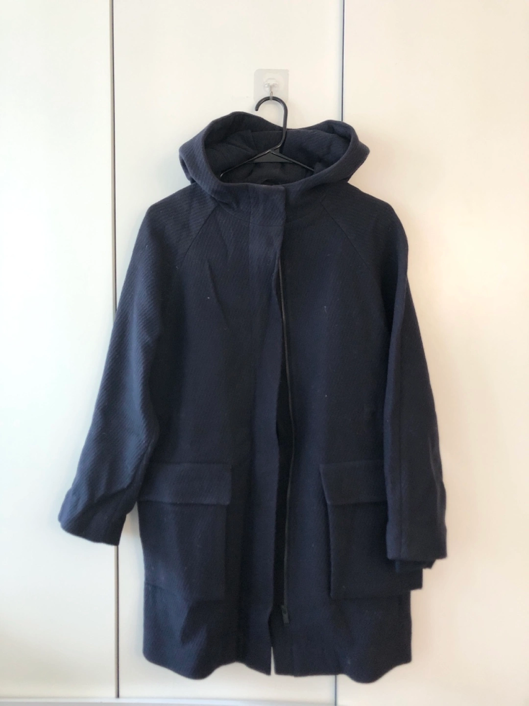 Navy blue hooded coat. Zip front closure. Two pockets.
