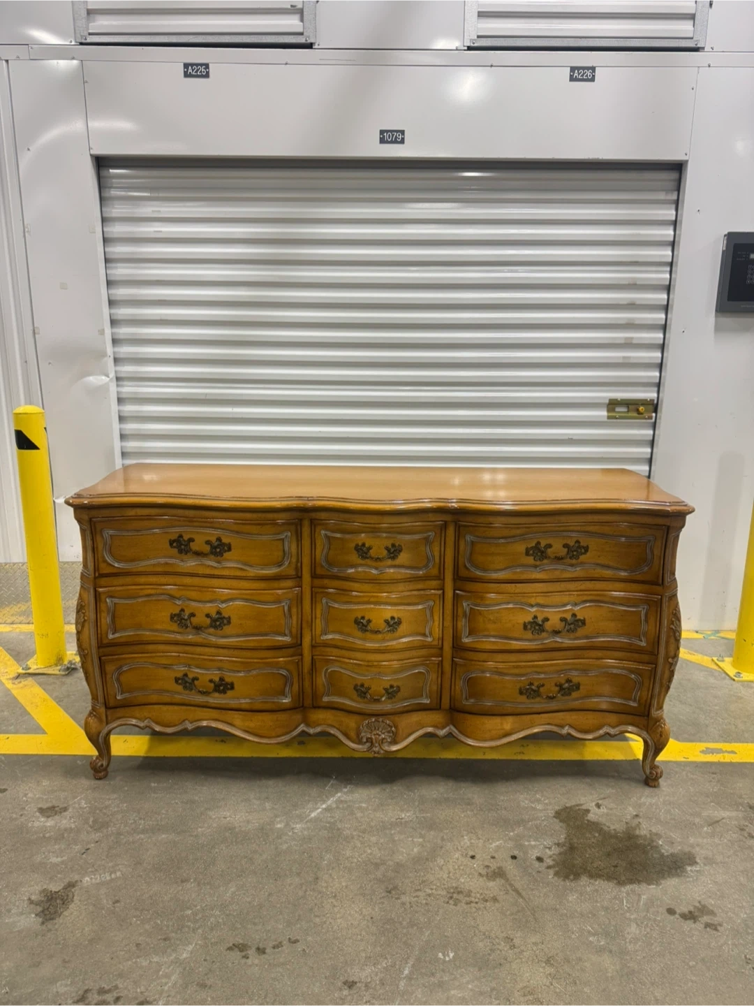 This dresser has a warm wood finish with ornate brass-tone hardware. It features nine drawers for ample storage. Its classic French Provincial design adds elegance to any bedroom.
