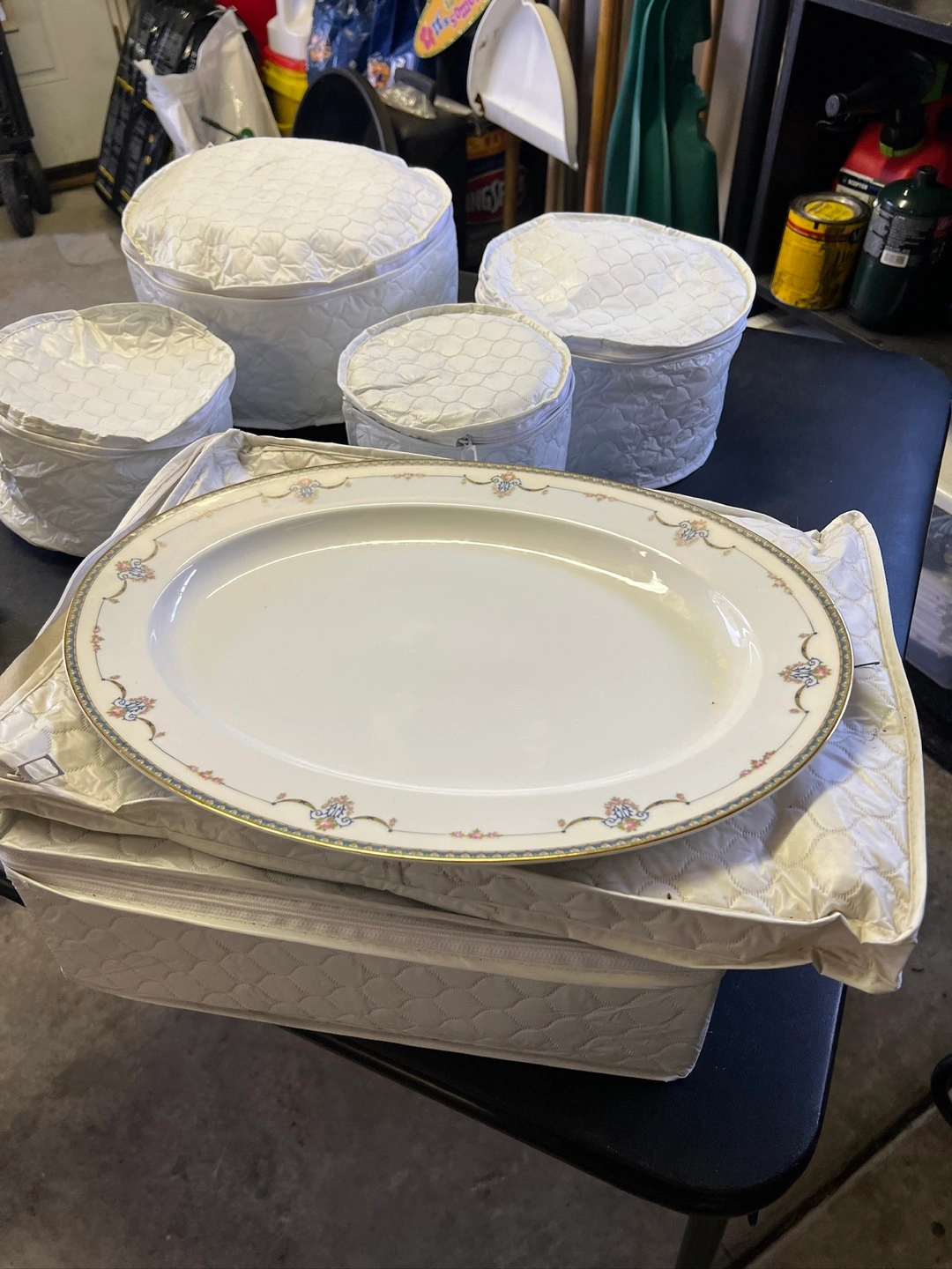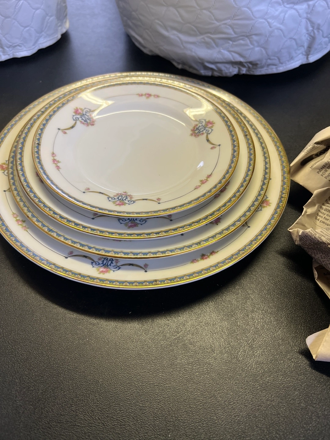 Set of vintage chinaware. Features delicate floral design. Gold trim. Made in Japan. With protective storing covers.