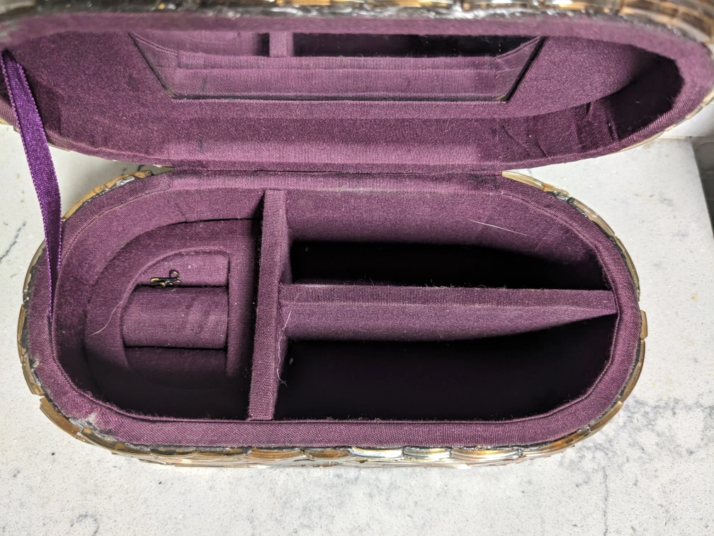 Oval-shaped jewellery box. Features a gold and brown mosaic design. Eggplant velvet-lined interior with compartments and a mirror. Perfect for storing jewellery or other small items.