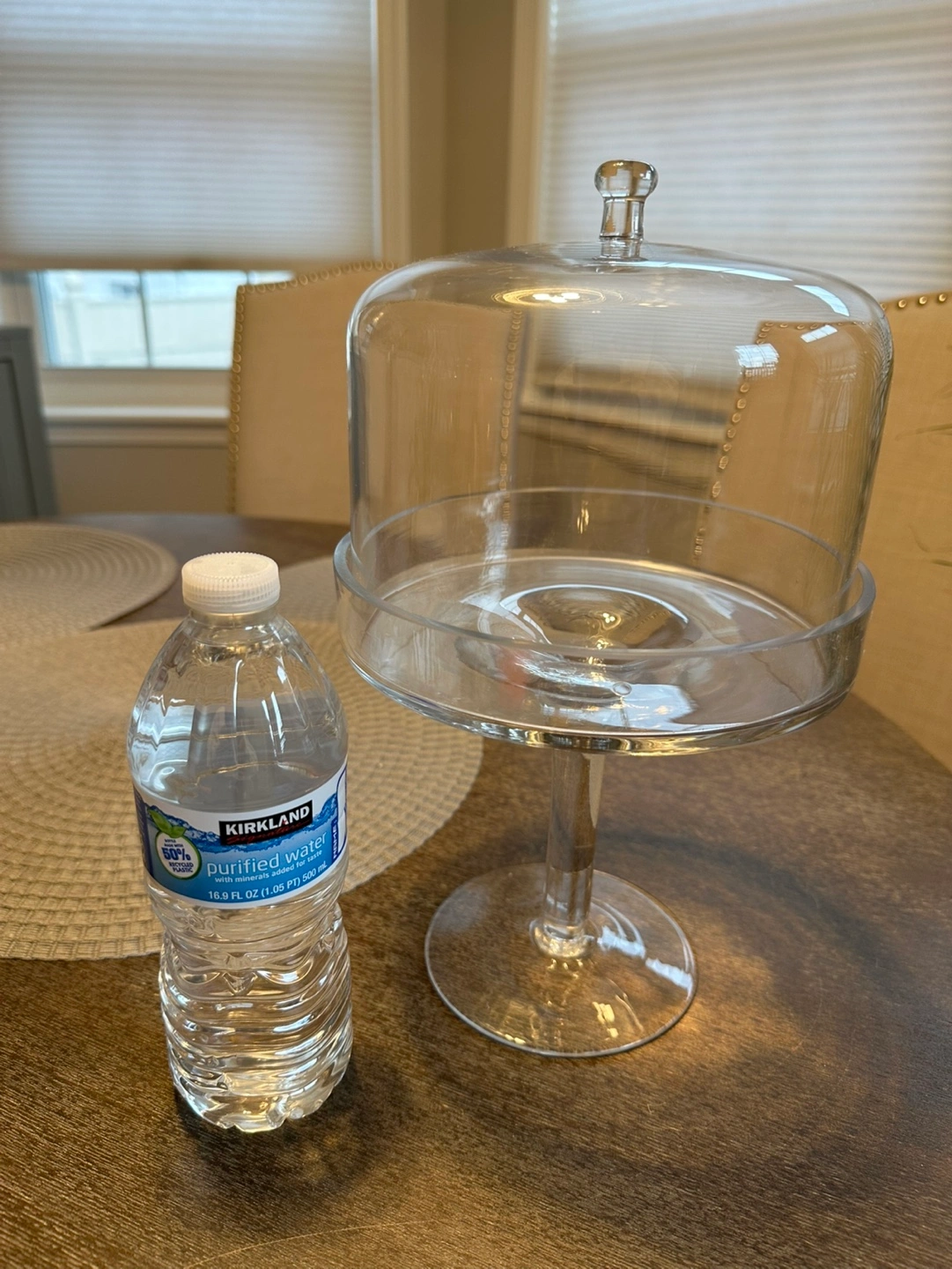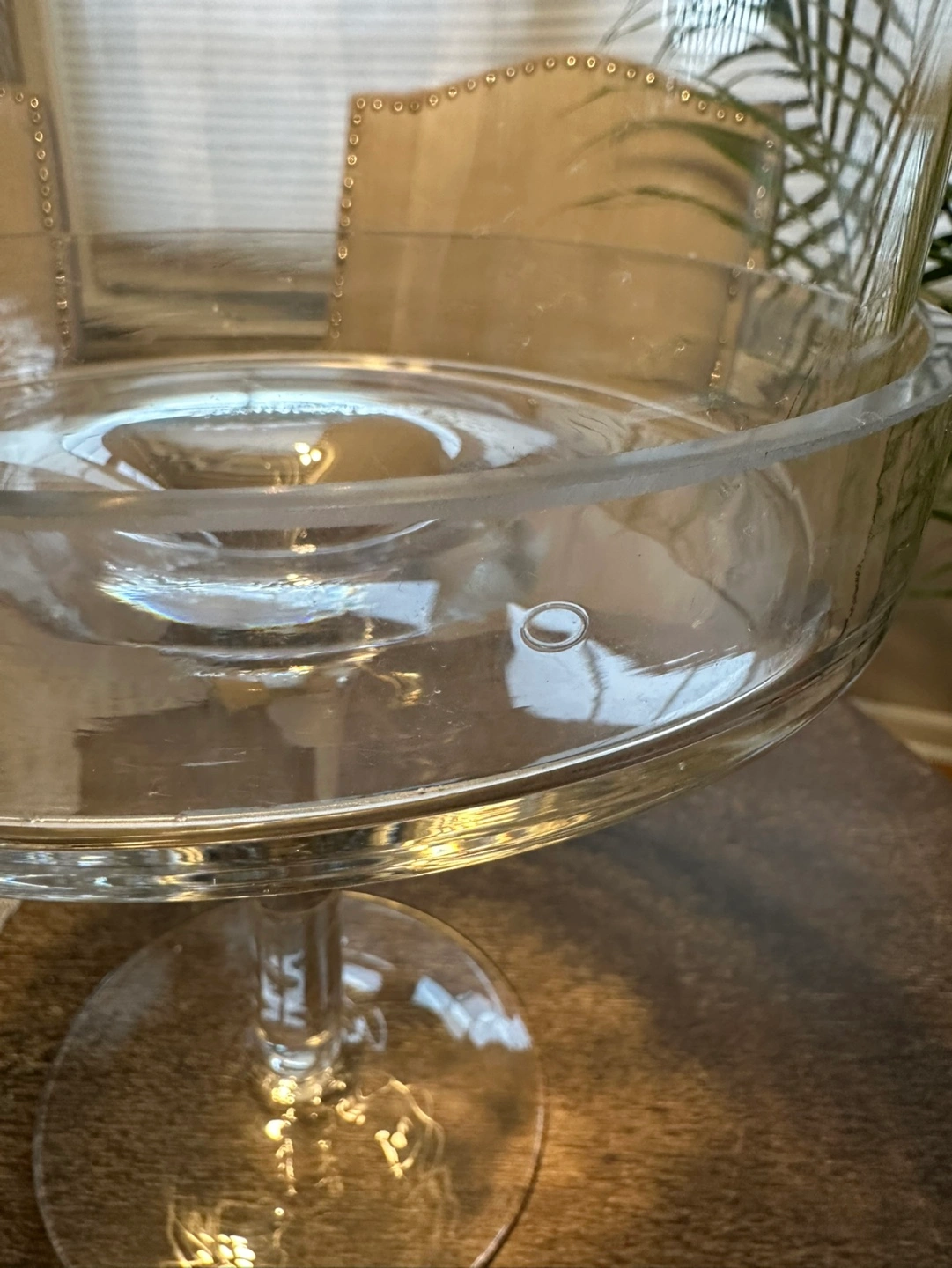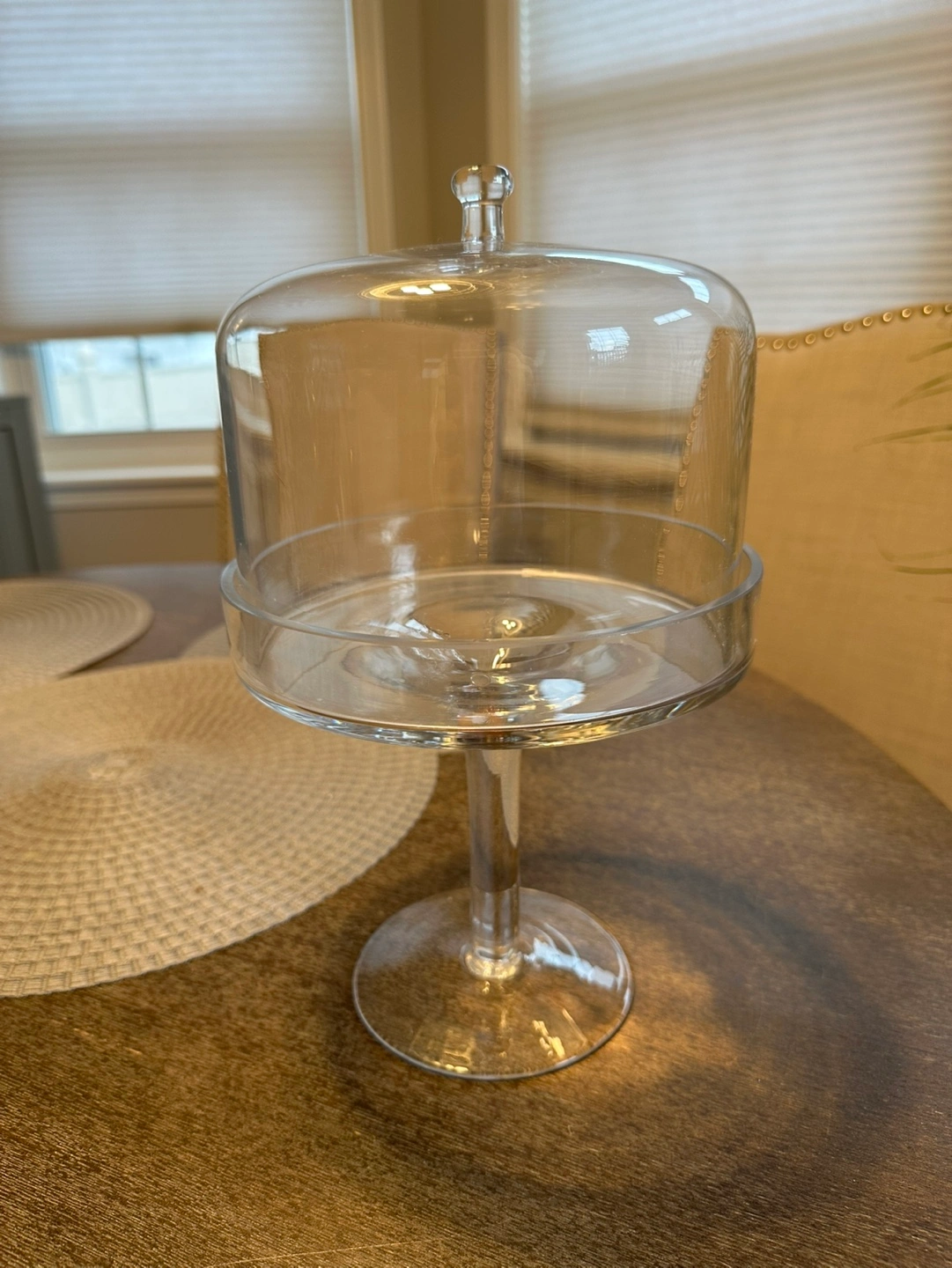 Clear glass cake stand. Features a dome cover and pedestal base. Perfect for displaying desserts or other treats. Small circle glass imperfection
