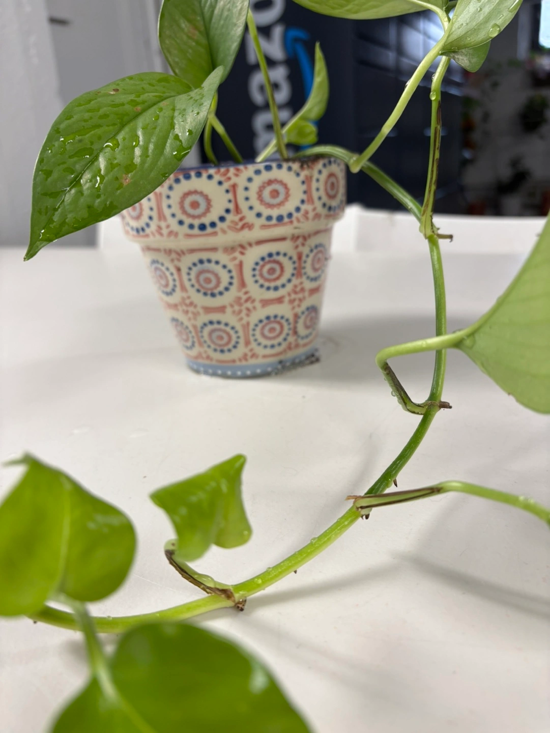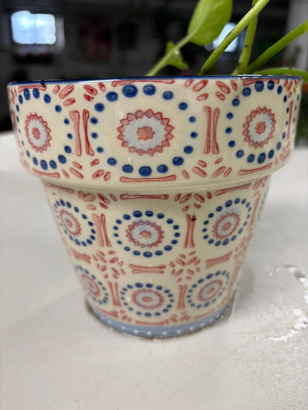91Beautiful pothos plant, growing nicely. Planted in a patterned ceramic pot. Perfect addition to your home.