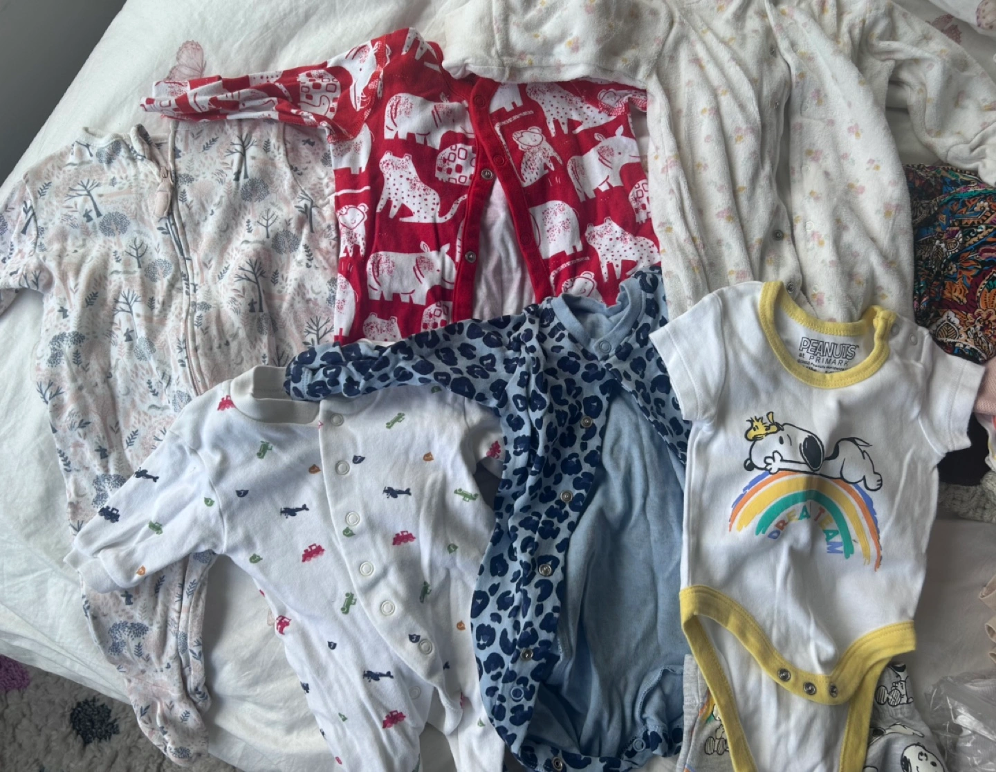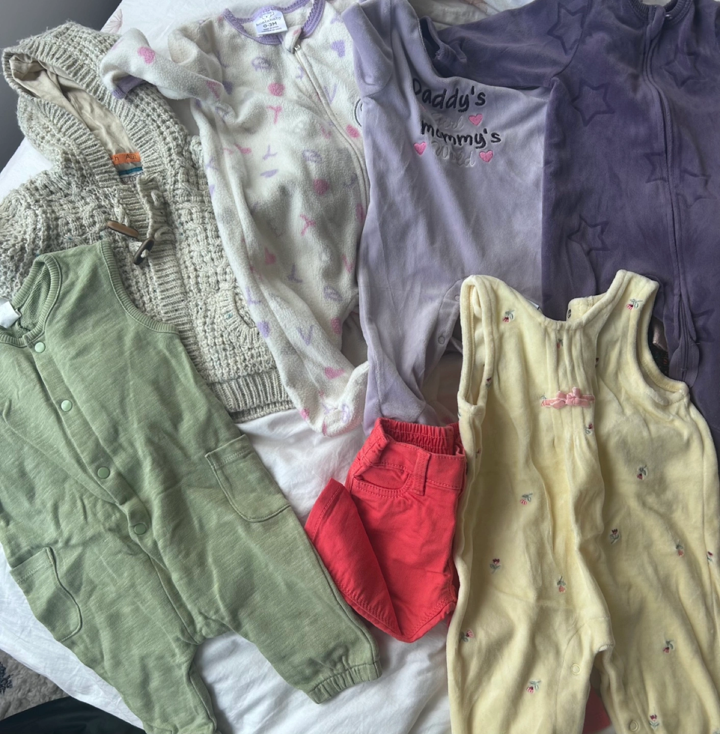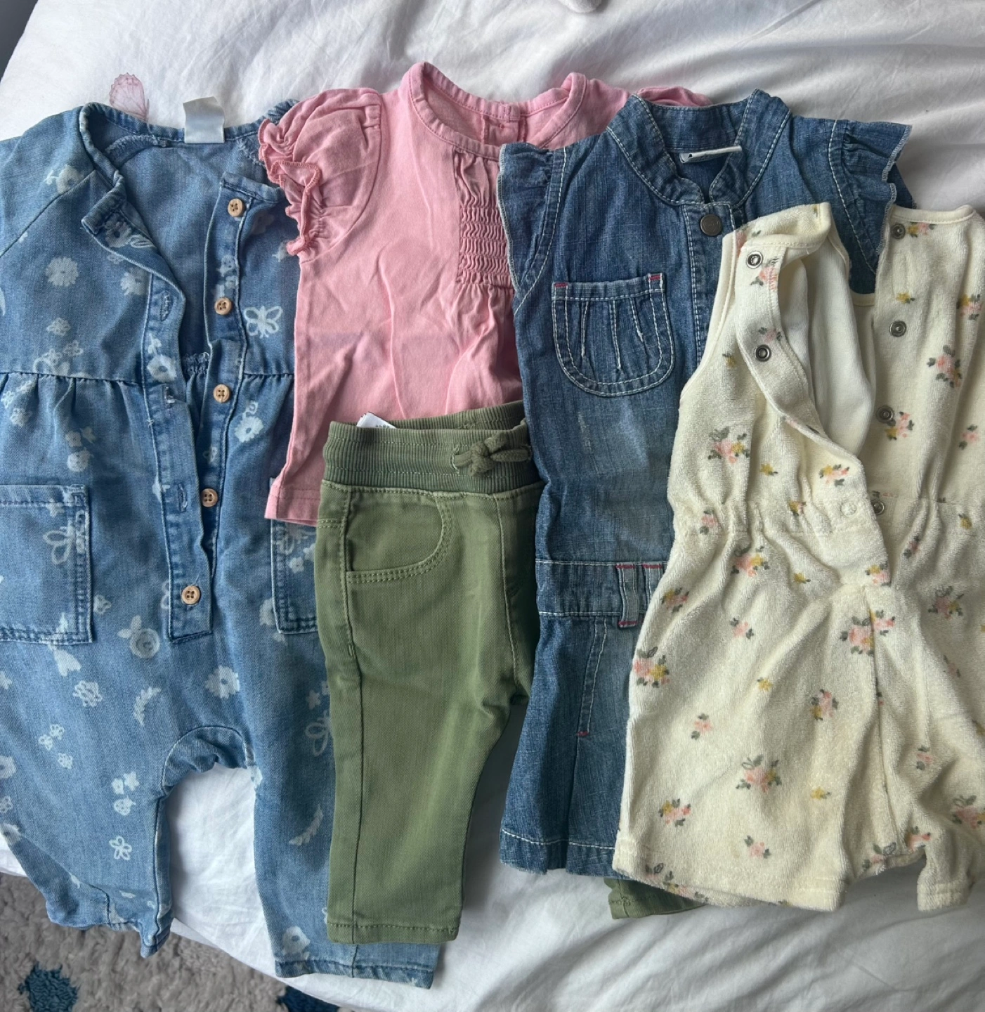 707Bundle of baby girl clothes. Includes rompers, dresses, pants, and tops. Various colors and patterns. Good used condition. Sizes range from newborn to 4 months. Pictures are examples, they r many