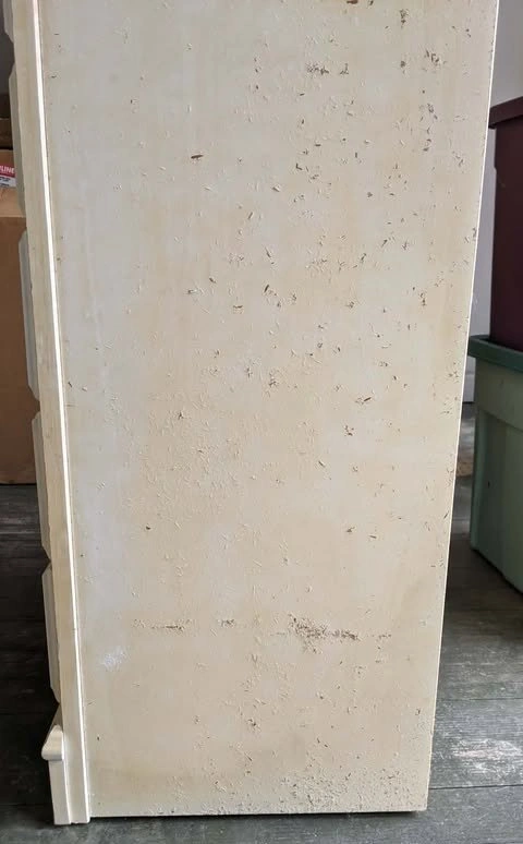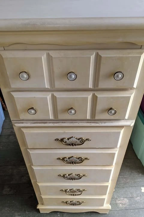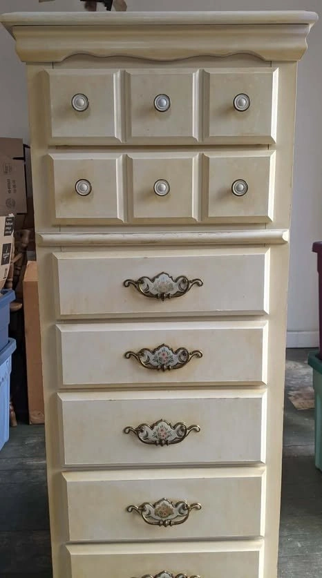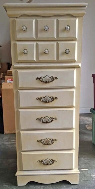 Seven-drawer dresser with a tan stain. It has some wear and marks. The drawers are all the same size and can be switched around. This dresser has some weight to it and will require two people to move. I can help you get it into your car.