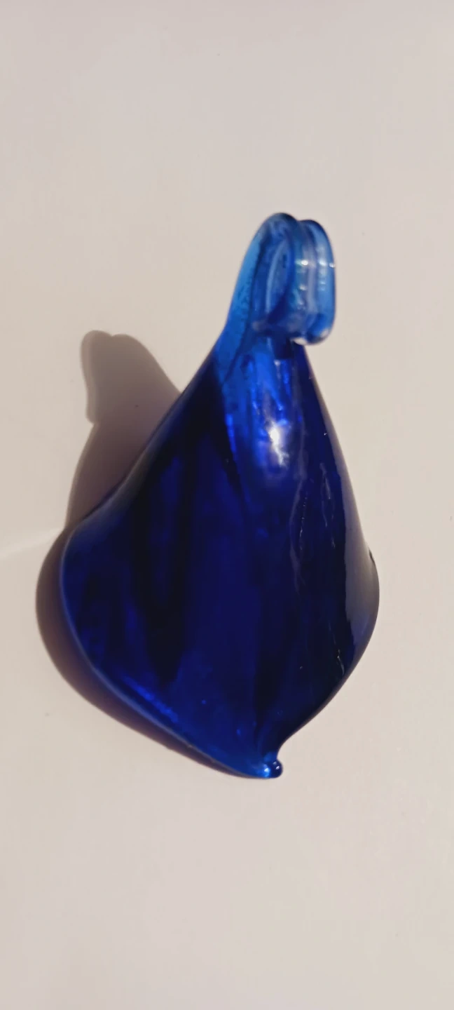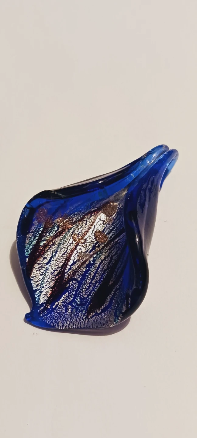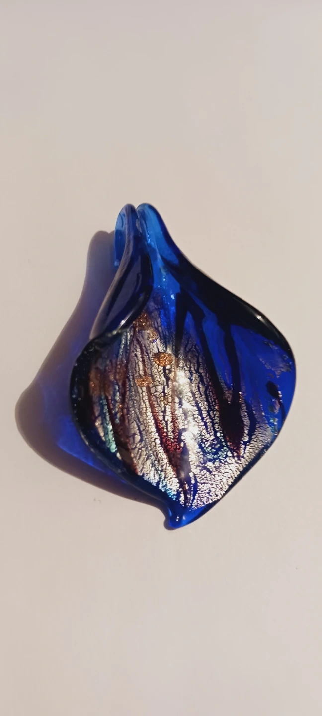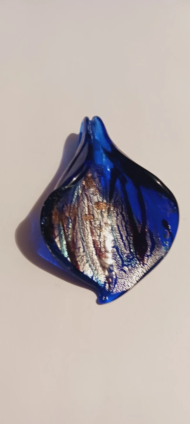 This is a beautiful blue glass pendant with embedded gold flecks. It has a unique, fluid shape. The glass material offers a vibrant blue color. !! 2"×1.5". Excellent condition.