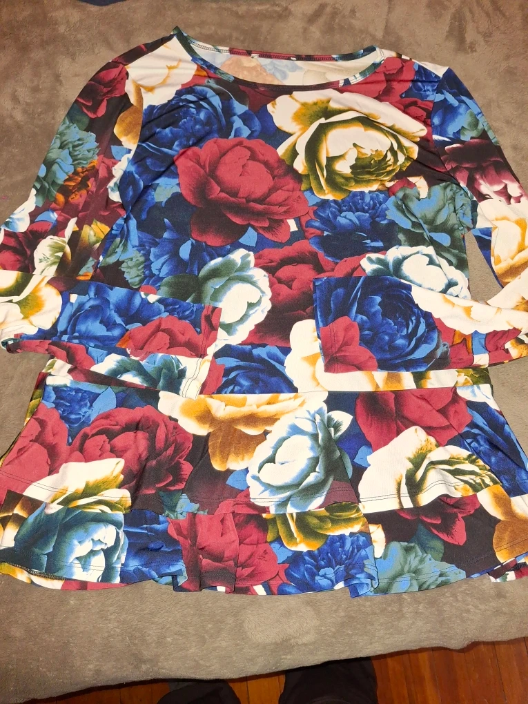 Here's a cute floral print long sleeve top! It features a colorful rose pattern in red, blue, and yellow tones. Perfect for adding a pop of color to your wardrobe.