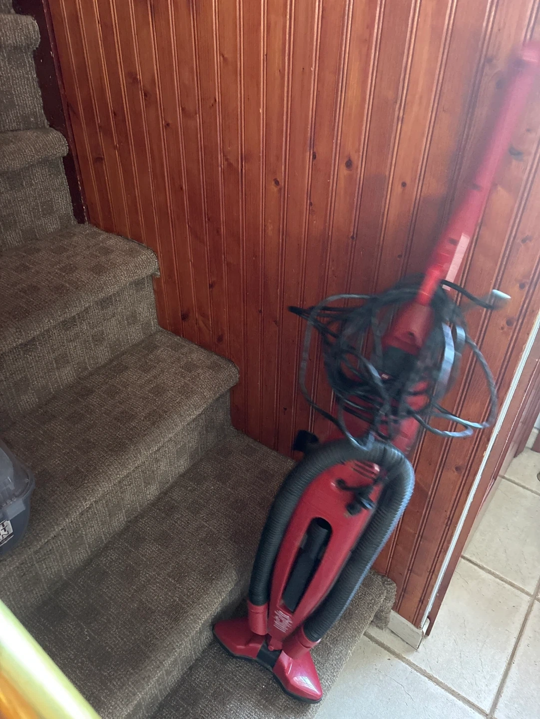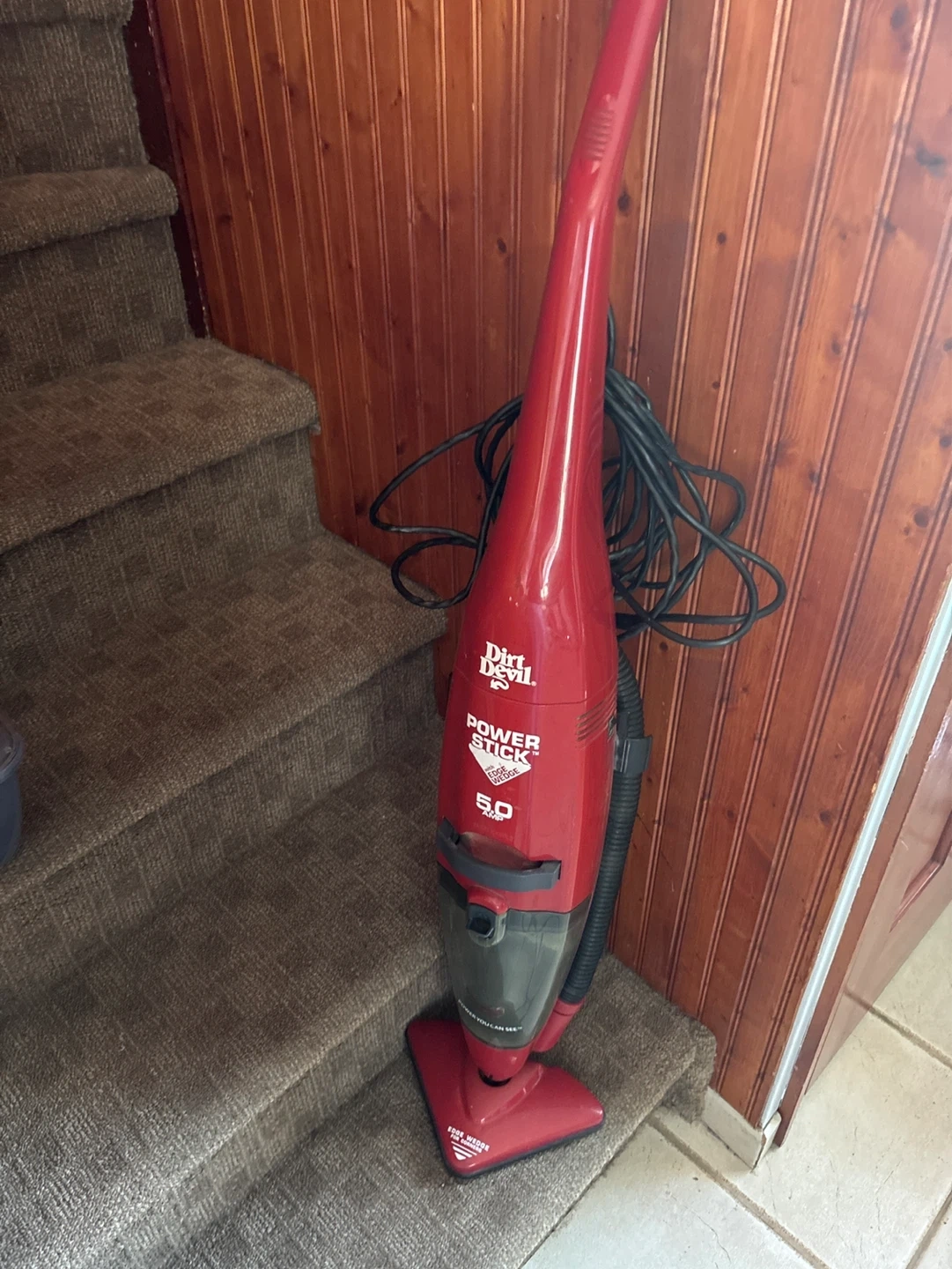 This red Dirt Devil Power Stick vacuum offers 5.0 amps of power. It features an edge wedge for cleaning corners. This is a great stick vacuum for quick cleanups! It still works very good