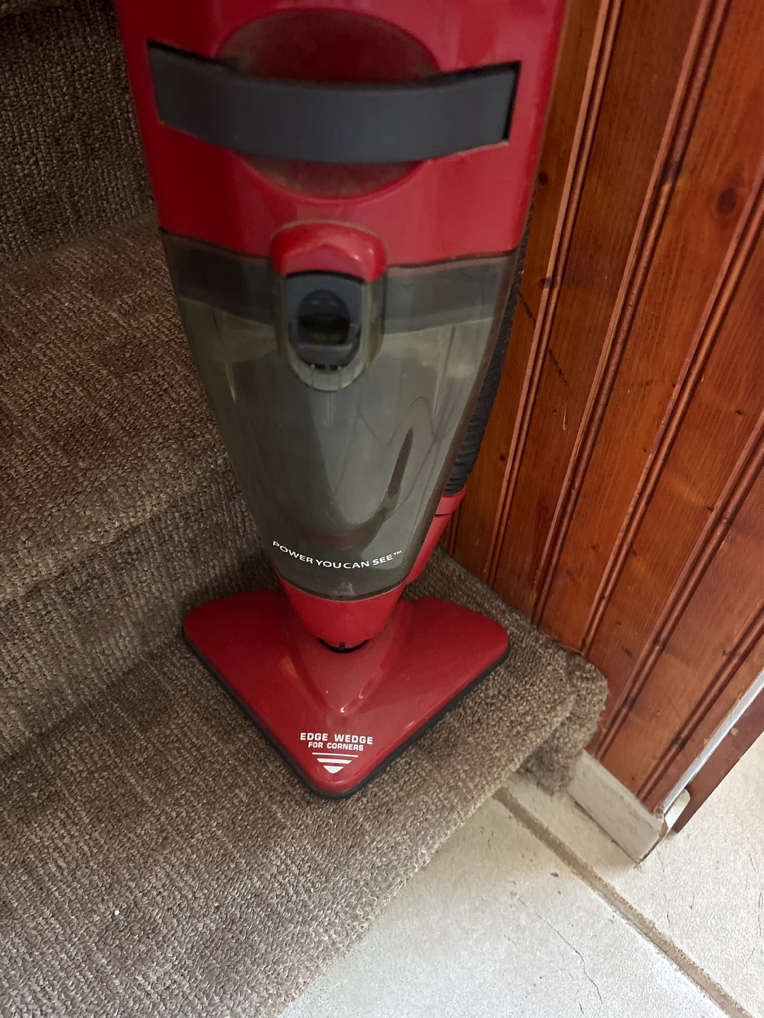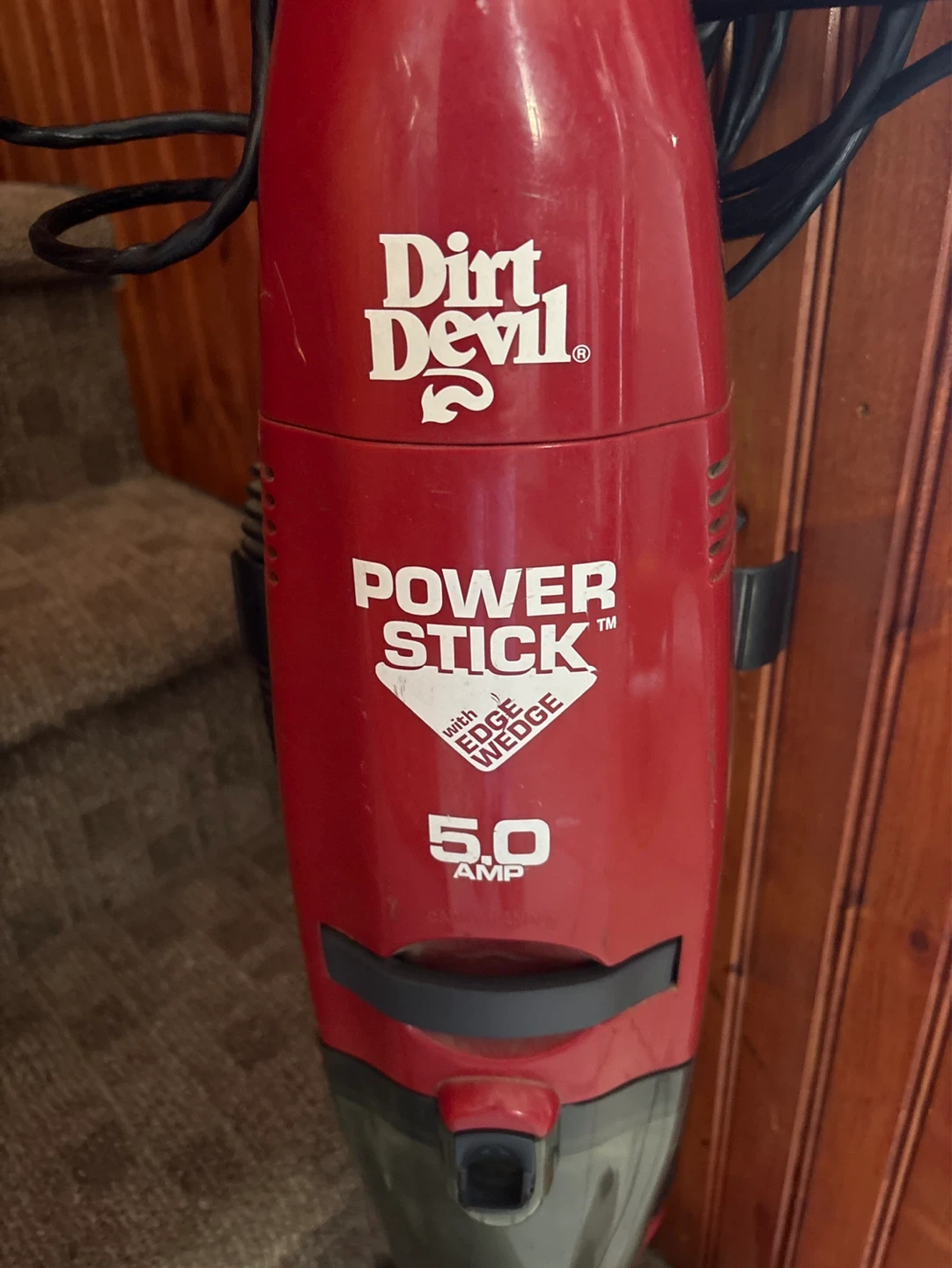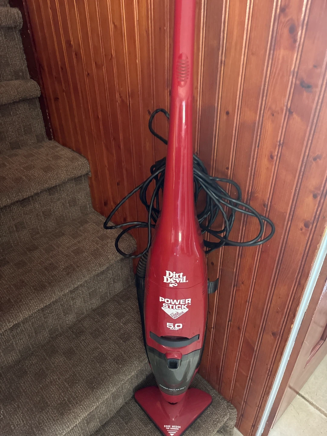 This red Dirt Devil Power Stick vacuum offers 5.0 amps of power. It features an edge wedge for cleaning corners. This is a great stick vacuum for quick cleanups! It still works very good