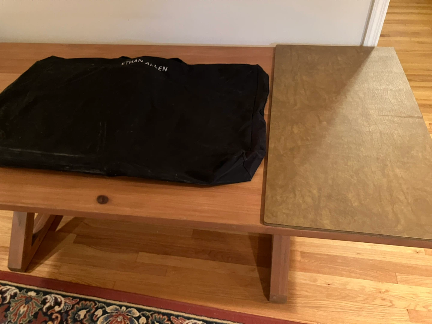 This is a sturdy wooden dining table from Ethan Allen. It features a warm wood tone and a unique X-leg design. Made in America. Perfect for your dining room! Originally purchased for $3500. Also includes a padded table cover in a carrying case.