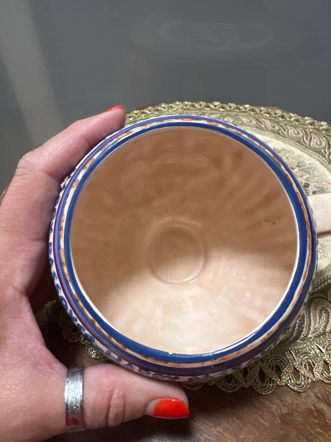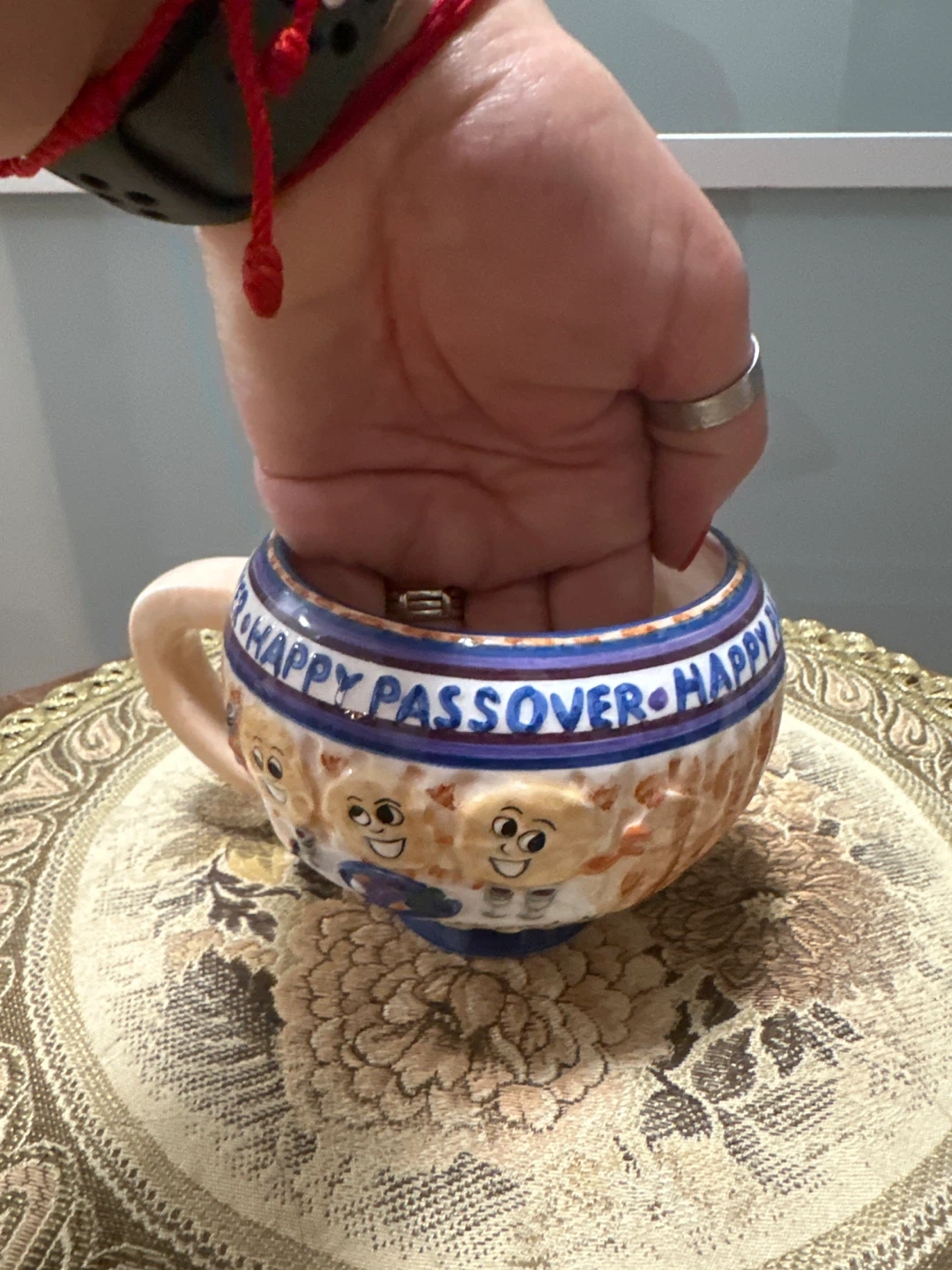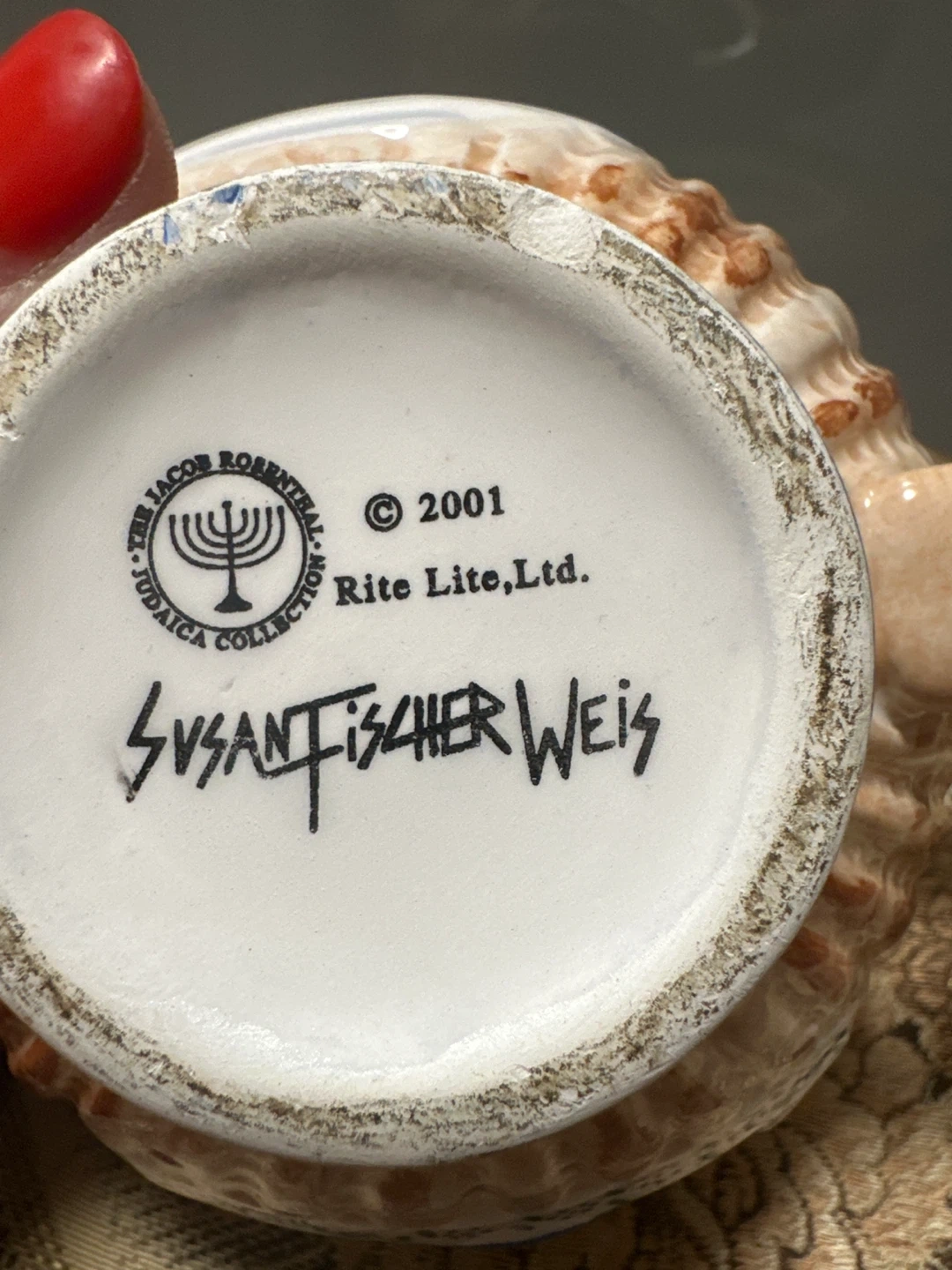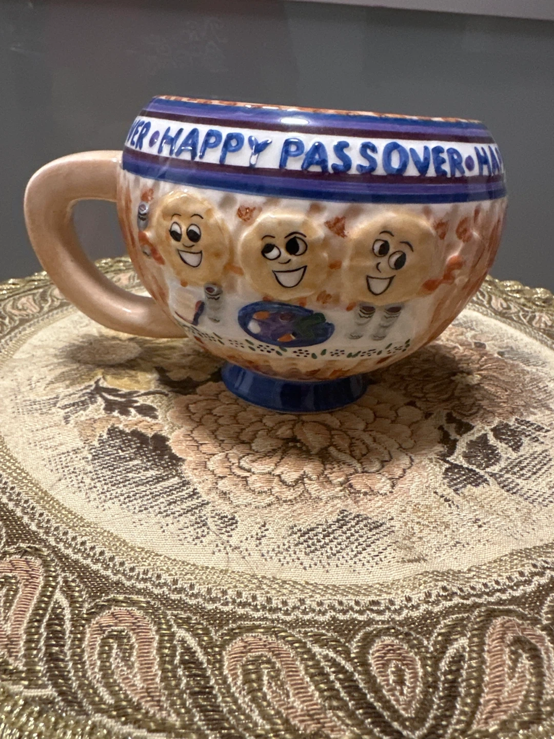 Susan Fischer Weis "Happy Passover" mug. Features "Happy Passover" text around the rim and playful matzah characters. This mug is from the 2001 Judaica Collection by Rite Lite, Ltd. It's a fun way to celebrate the holiday!