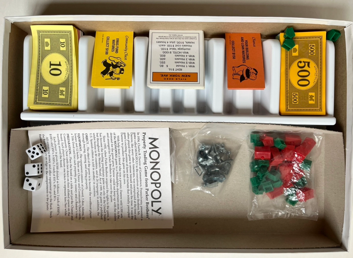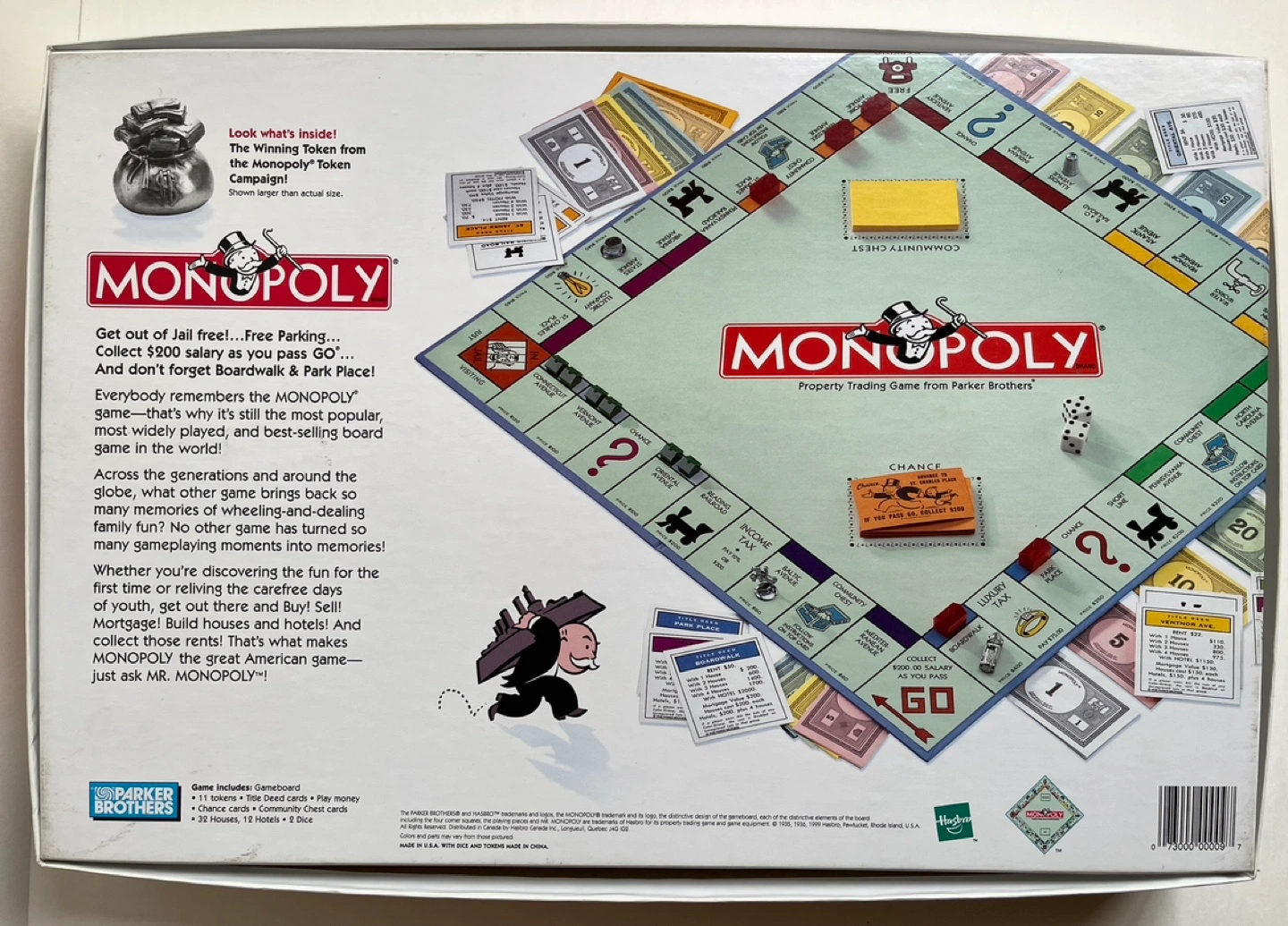 Classic Monopoly game by Parker Brothers. Includes game board, money, houses, hotels, tokens, and dice. Great for family game night. Ages 8 to Adult. 2 to 8 players. Includes instructions and short game rules. By Hasbro.