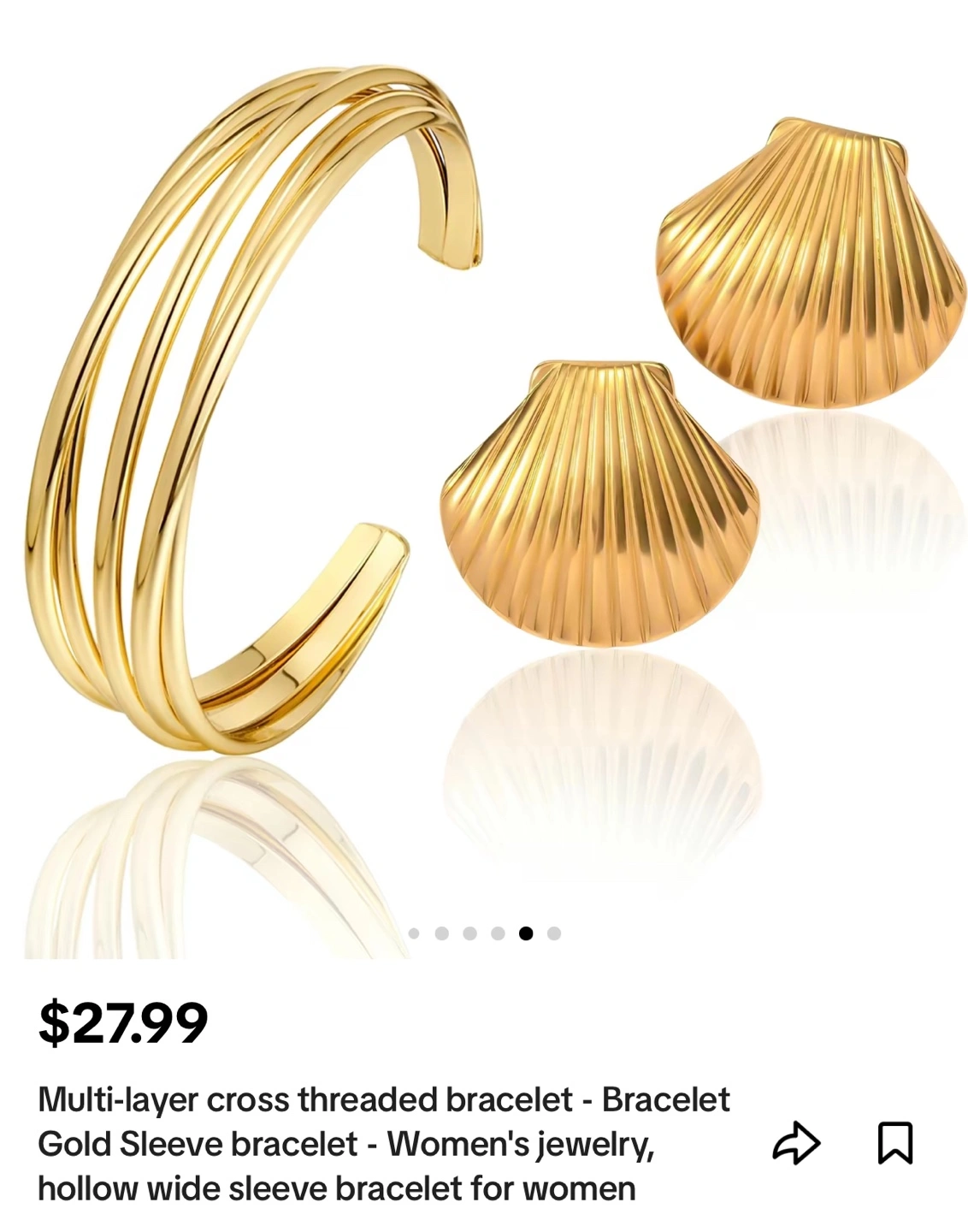 Multi-layer gold bracelet. Matching shell-shaped earrings. Women's jewelry.