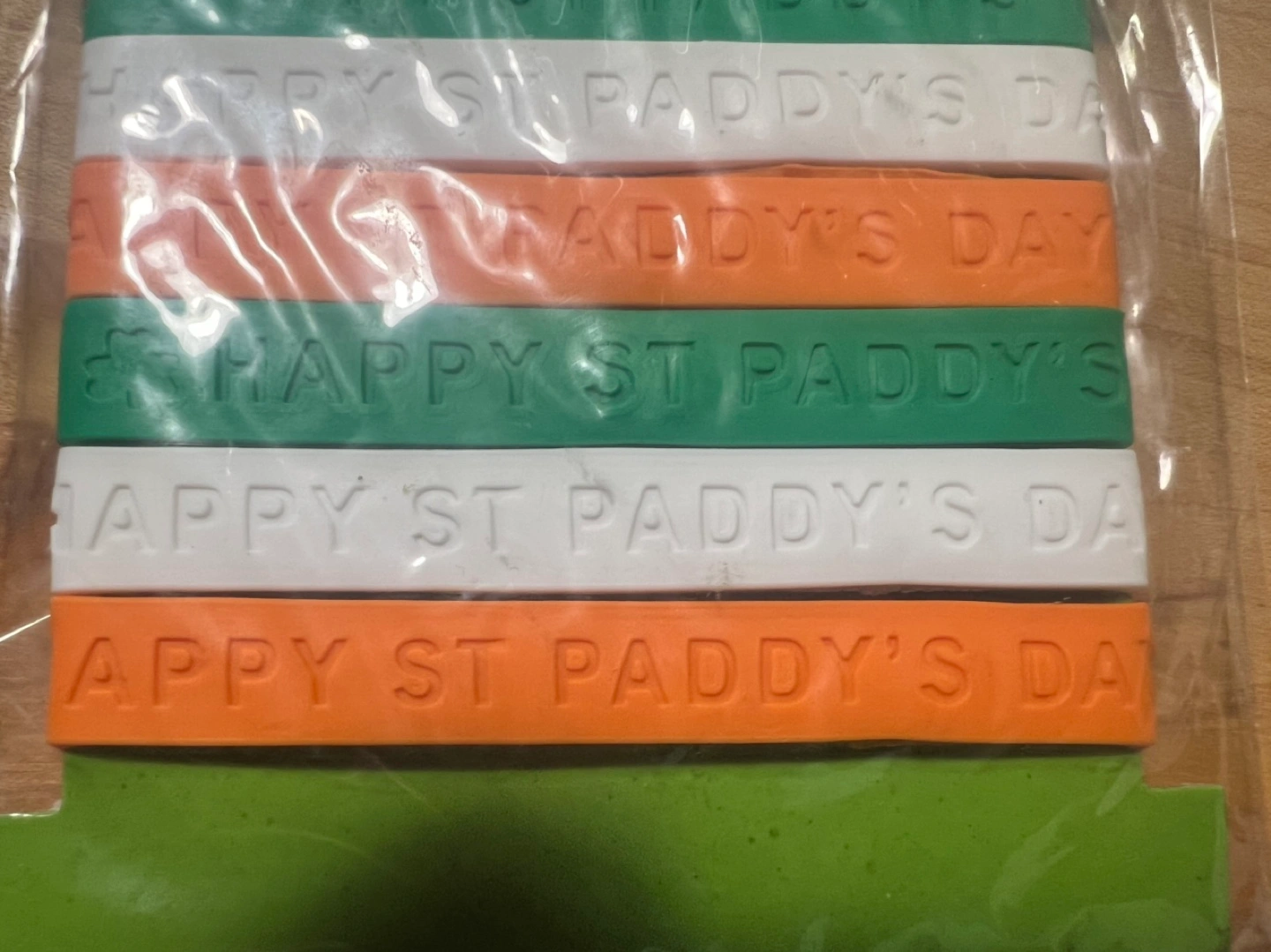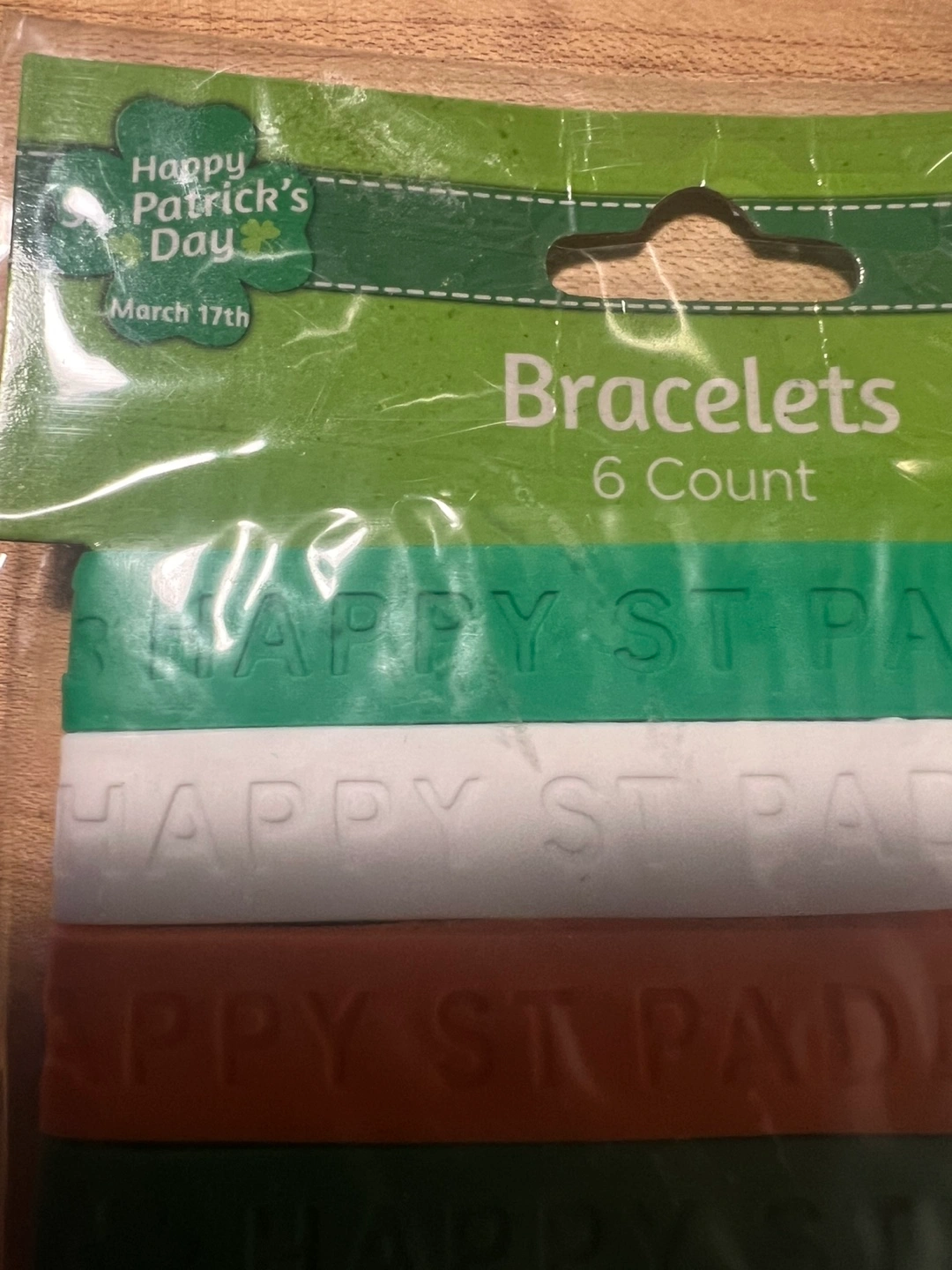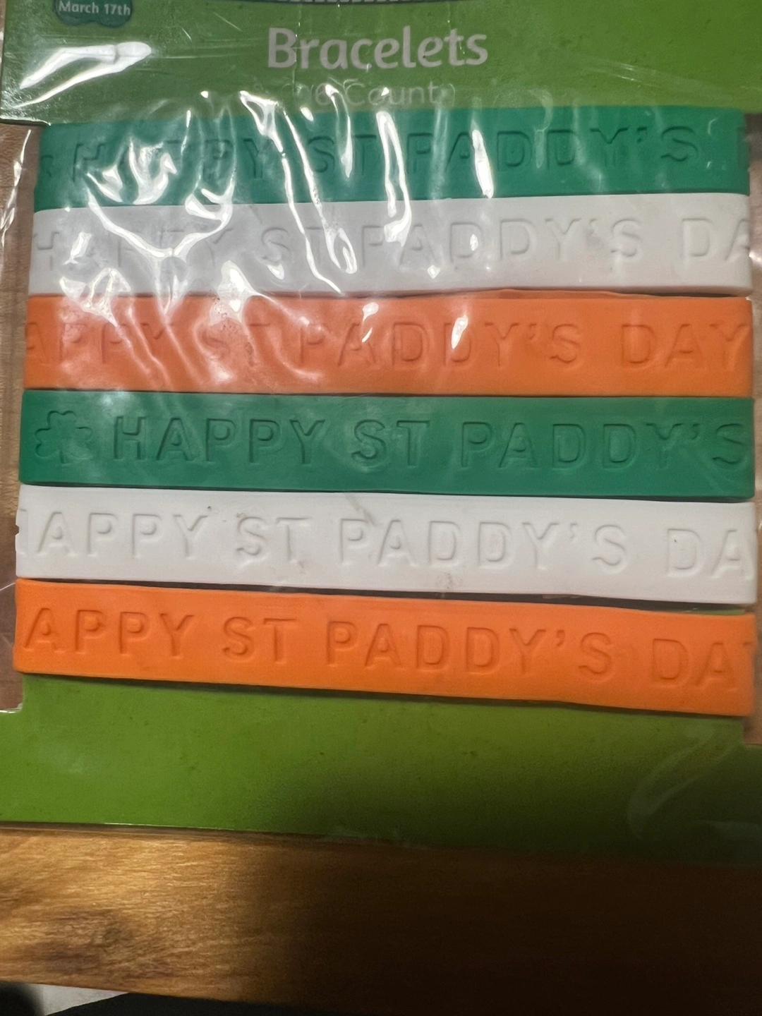 Six St. Patrick's Day themed bracelets. Irish flag colors. Embossed with 'Happy St. Paddy's Day'. Perfect for parties, in original package.