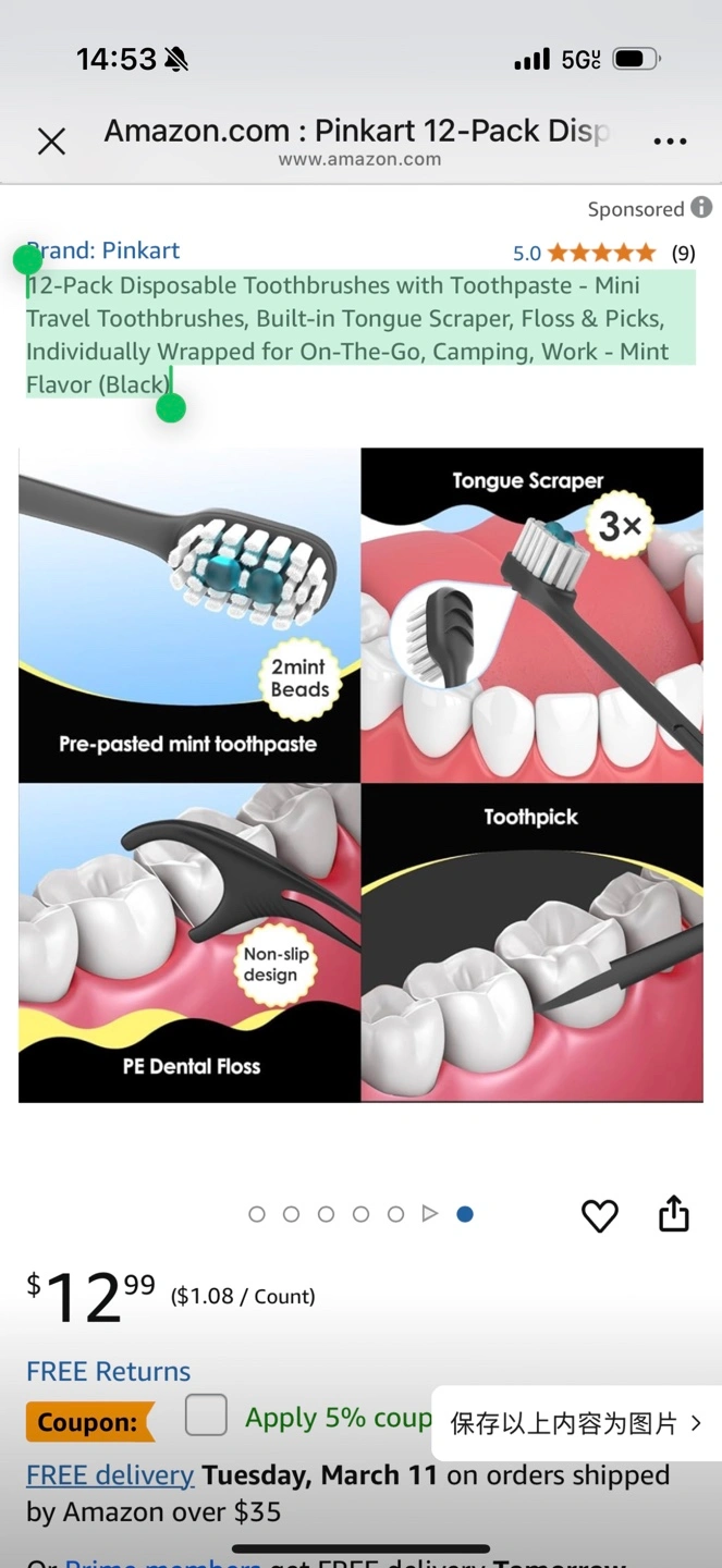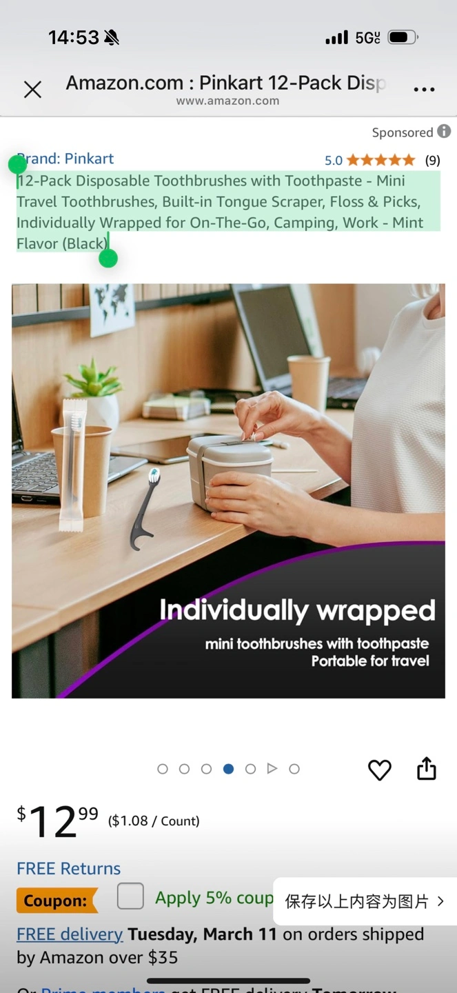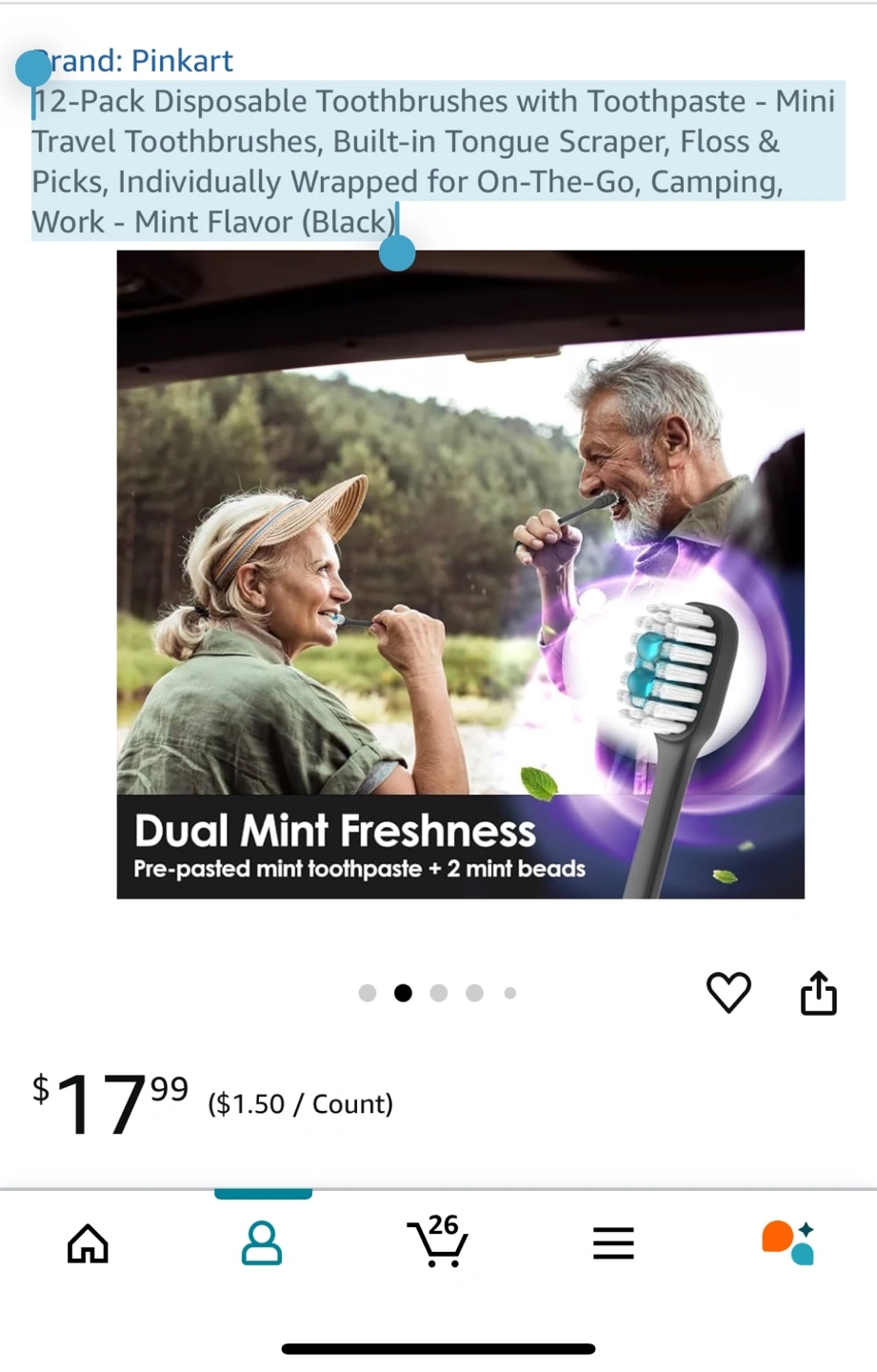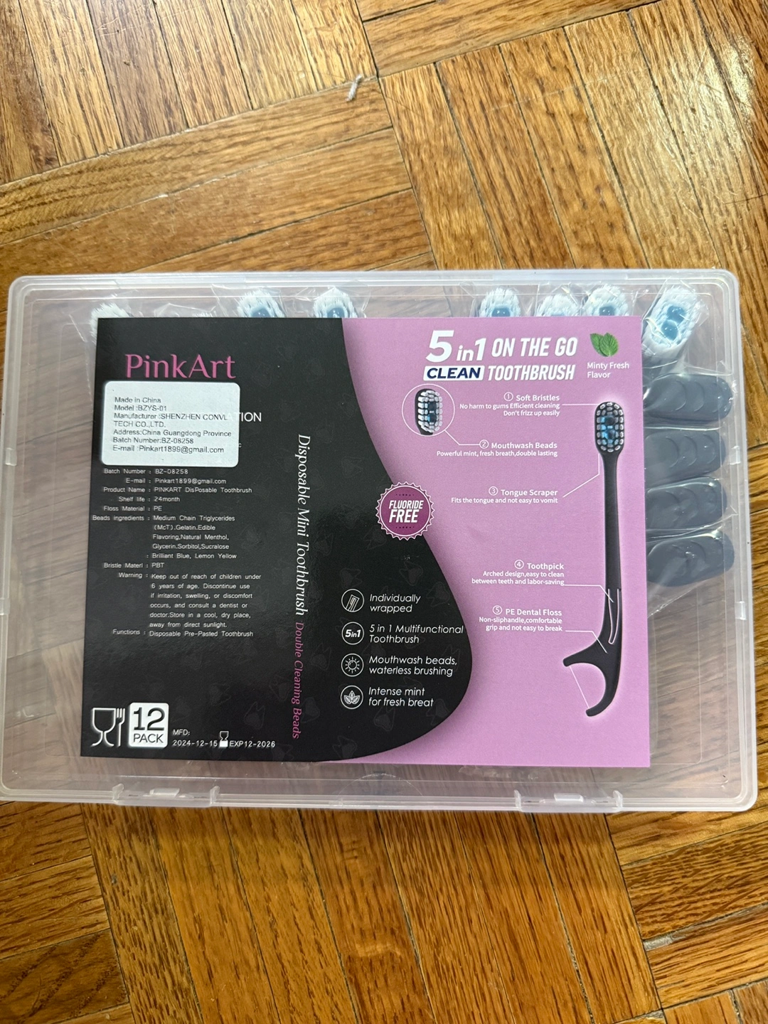 12-Pack Disposable Toothbrushes with Toothpaste - Mini Travel Toothbrushes, Built-in Tongue Scraper, Floss & Picks, Individually Wrapped for On-The-Go, Camping, Work - Mint Flavor (Black)(new)
