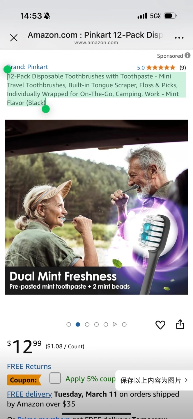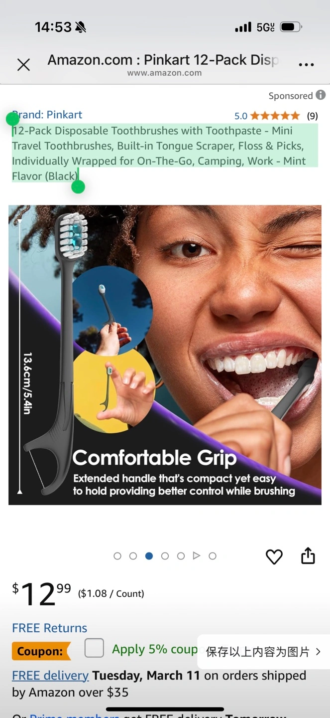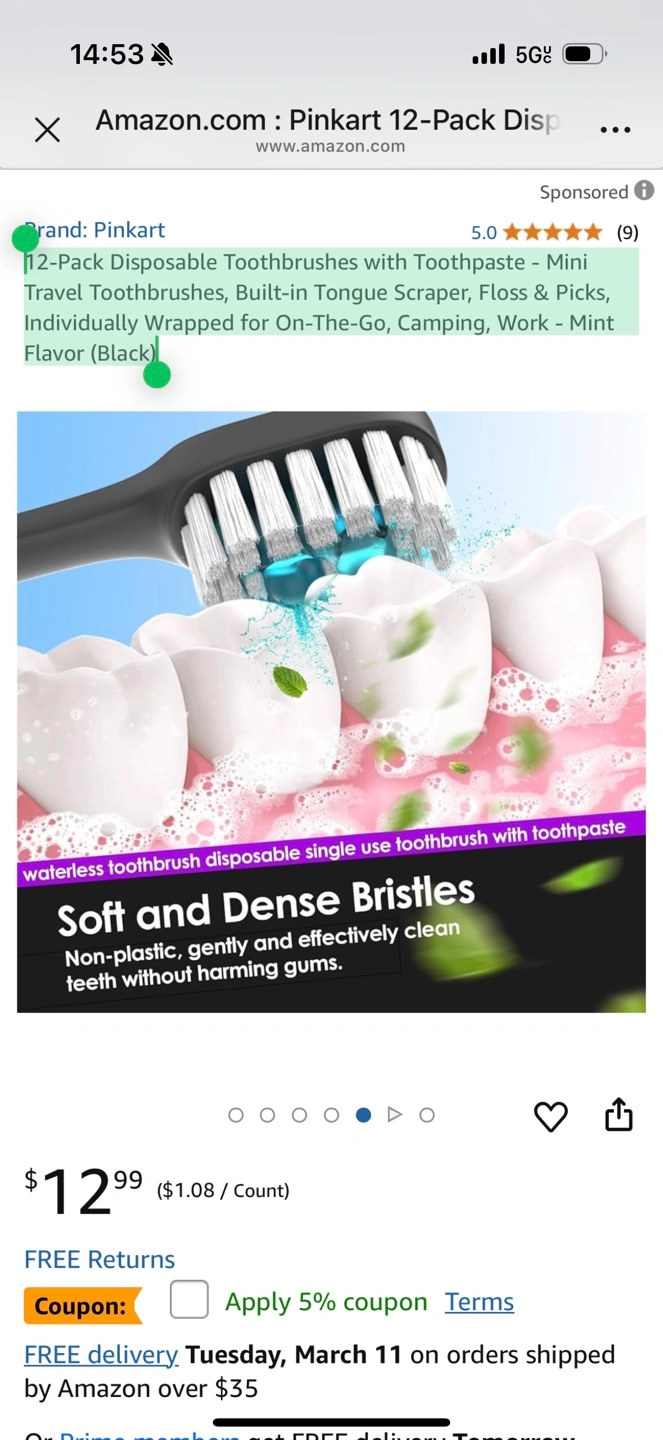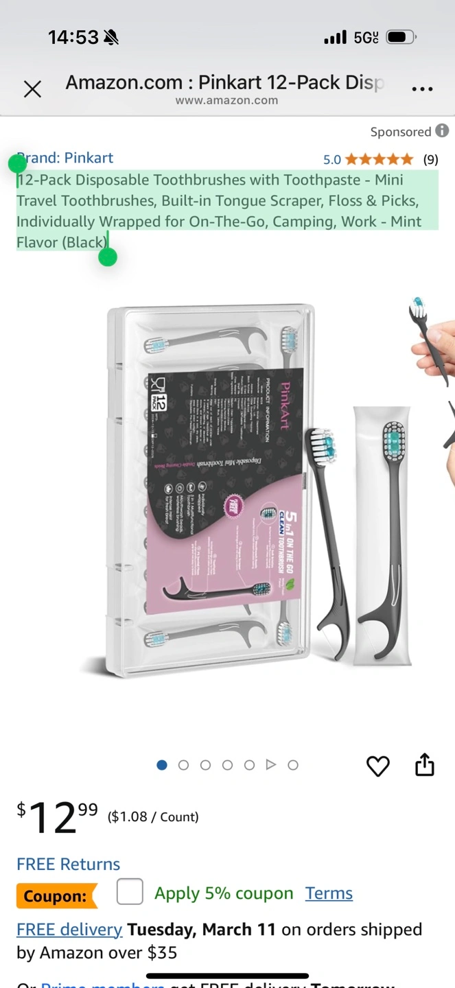 12-Pack Disposable Toothbrushes with Toothpaste - Mini Travel Toothbrushes, Built-in Tongue Scraper, Floss & Picks, Individually Wrapped for On-The-Go, Camping, Work - Mint Flavor (Black)(new)