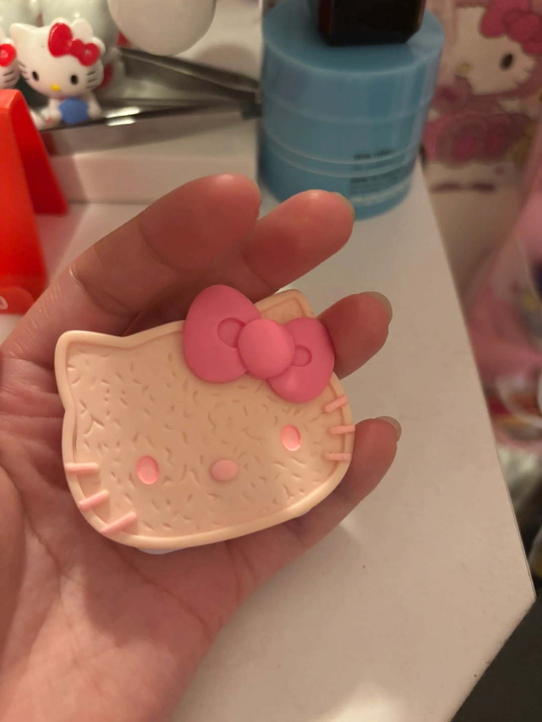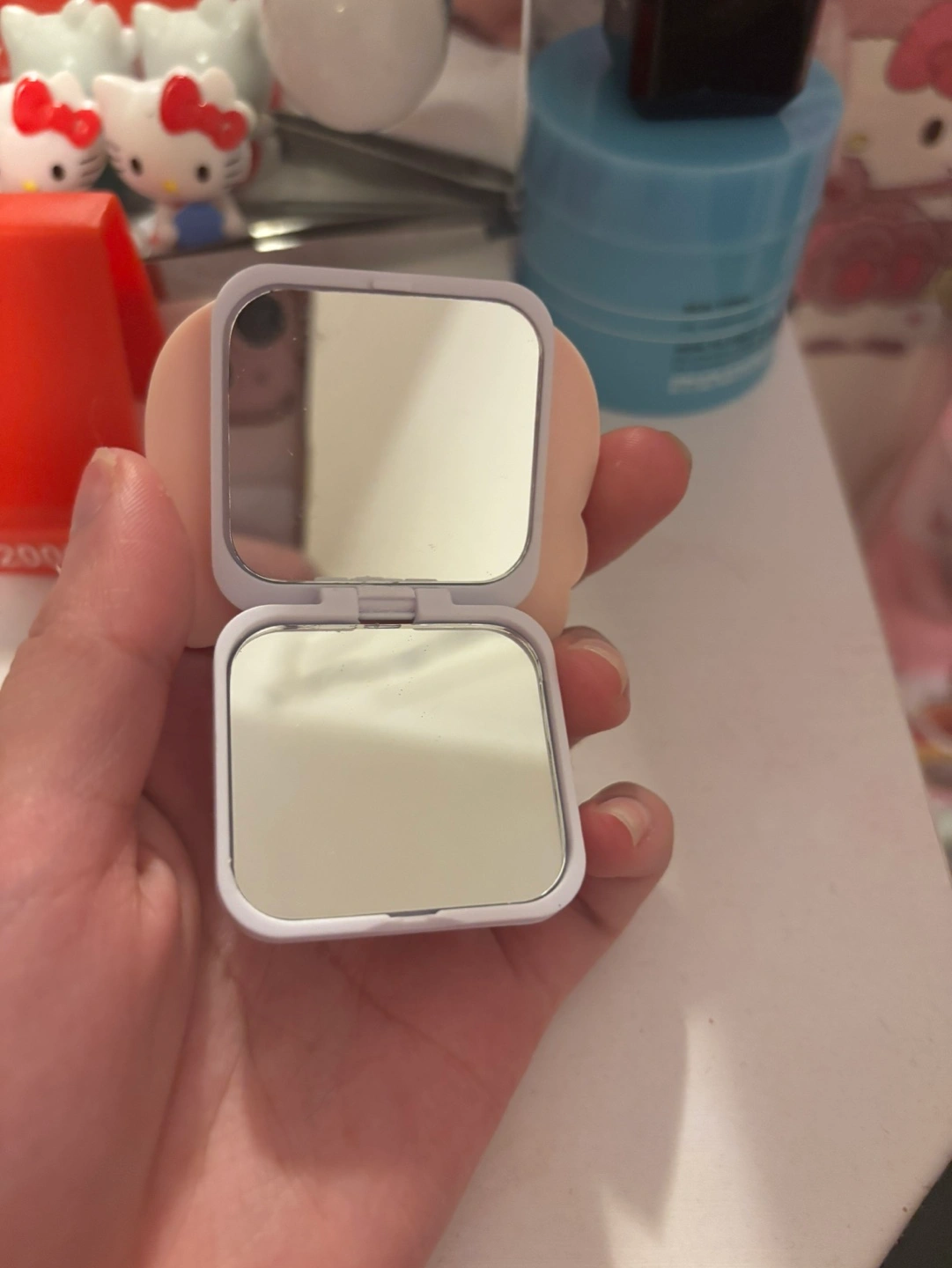 174Cute Hello Kitty compact mirror. Features a pink Hello Kitty design. Two-sided mirror. Small and portable. Can be used as a pop socket