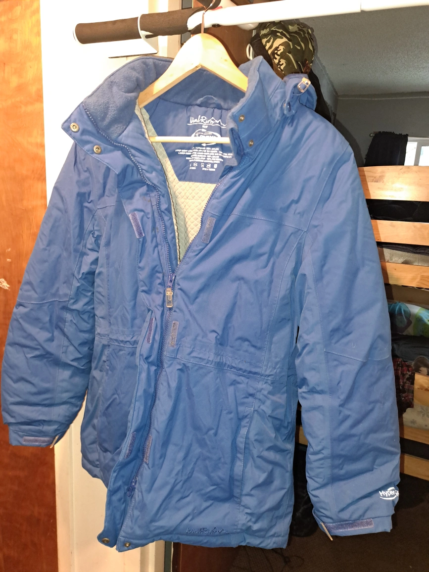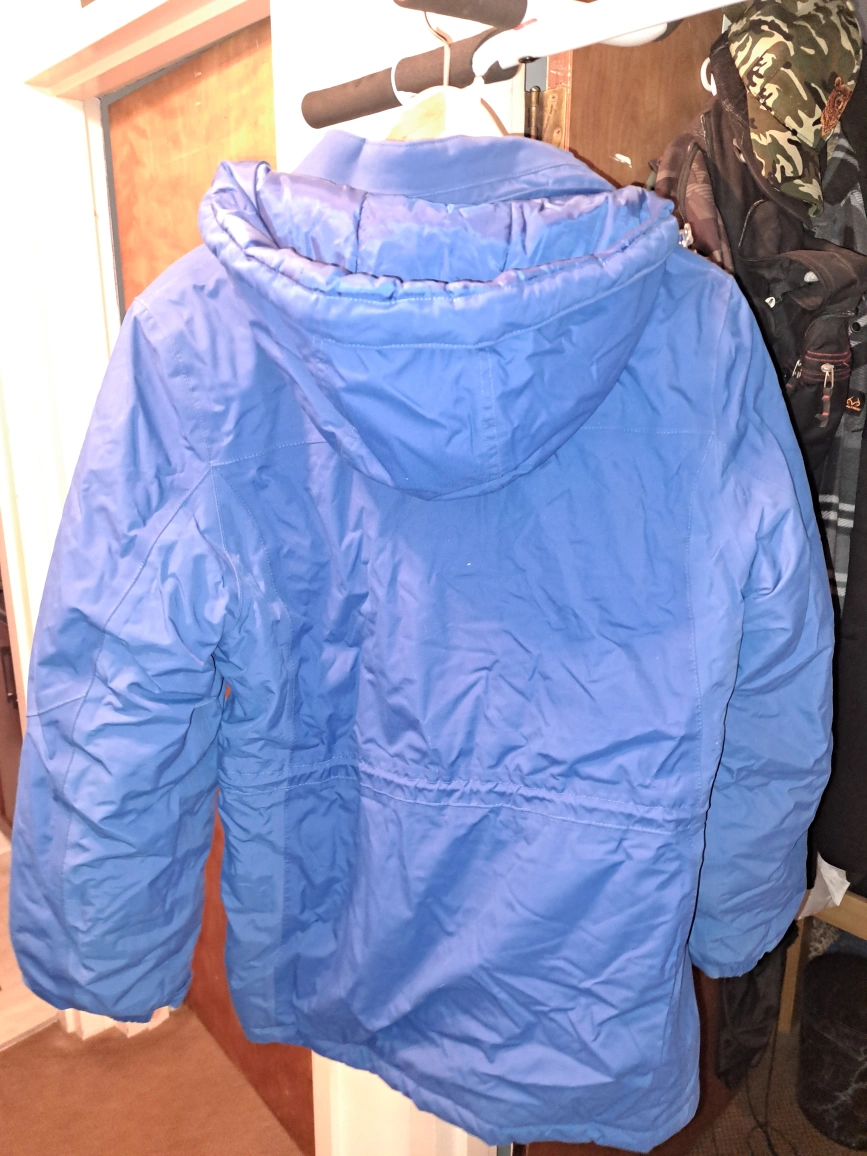 Women's size medium, blue winter coat with 2 outer pockets and 2 inner pockets.