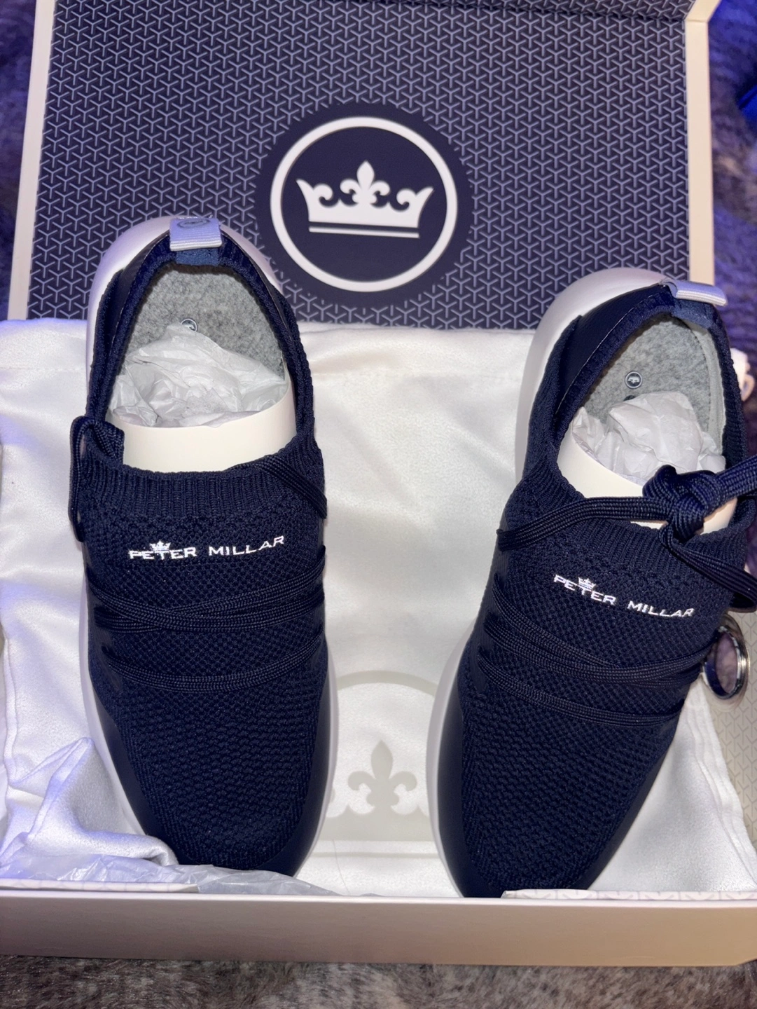 New Peter Millar women's sneakers, still in the box, never worn. Size 8.5 US. Navy blue knit upper, white sole. Slip-on style. Come in original box.