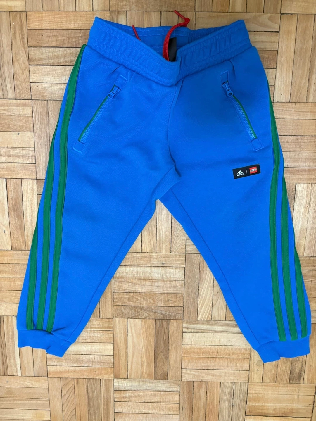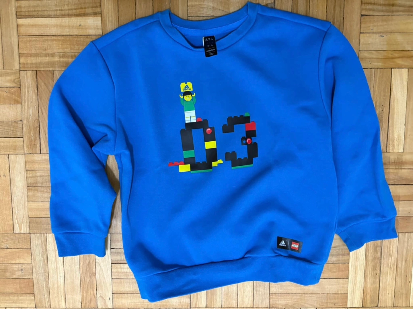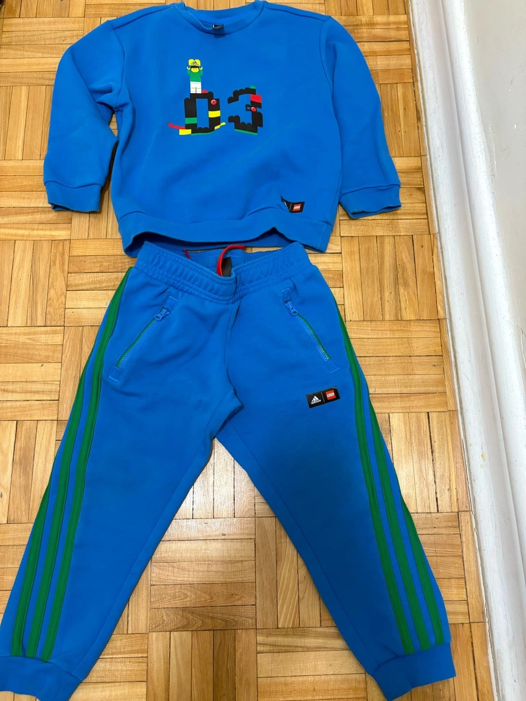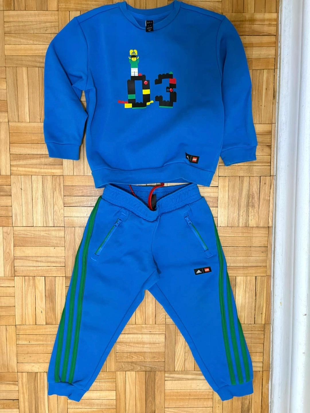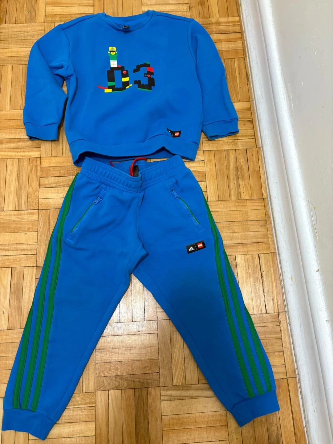 Adorable Adidas x LEGO collaboration tracksuit. Bright blue, features LEGO-inspired graphics. Size 4T. Includes sweatshirt and joggers. Green stripes on joggers. Zip pockets.