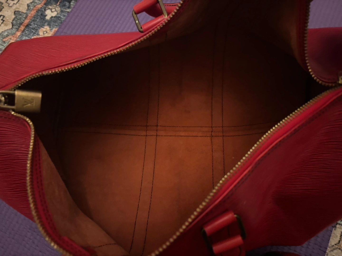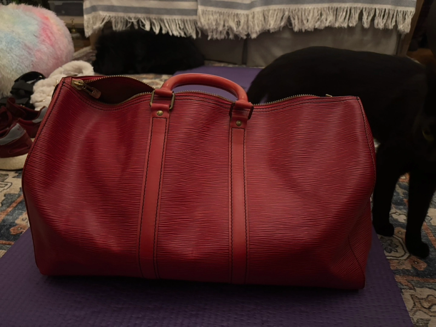 Pre-owned Louis Vuitton Epi Keepall Bandouliere 50. Red leather. Zipper closure. Gold-tone hardware. Interior lining. Slight wear. Authentic.