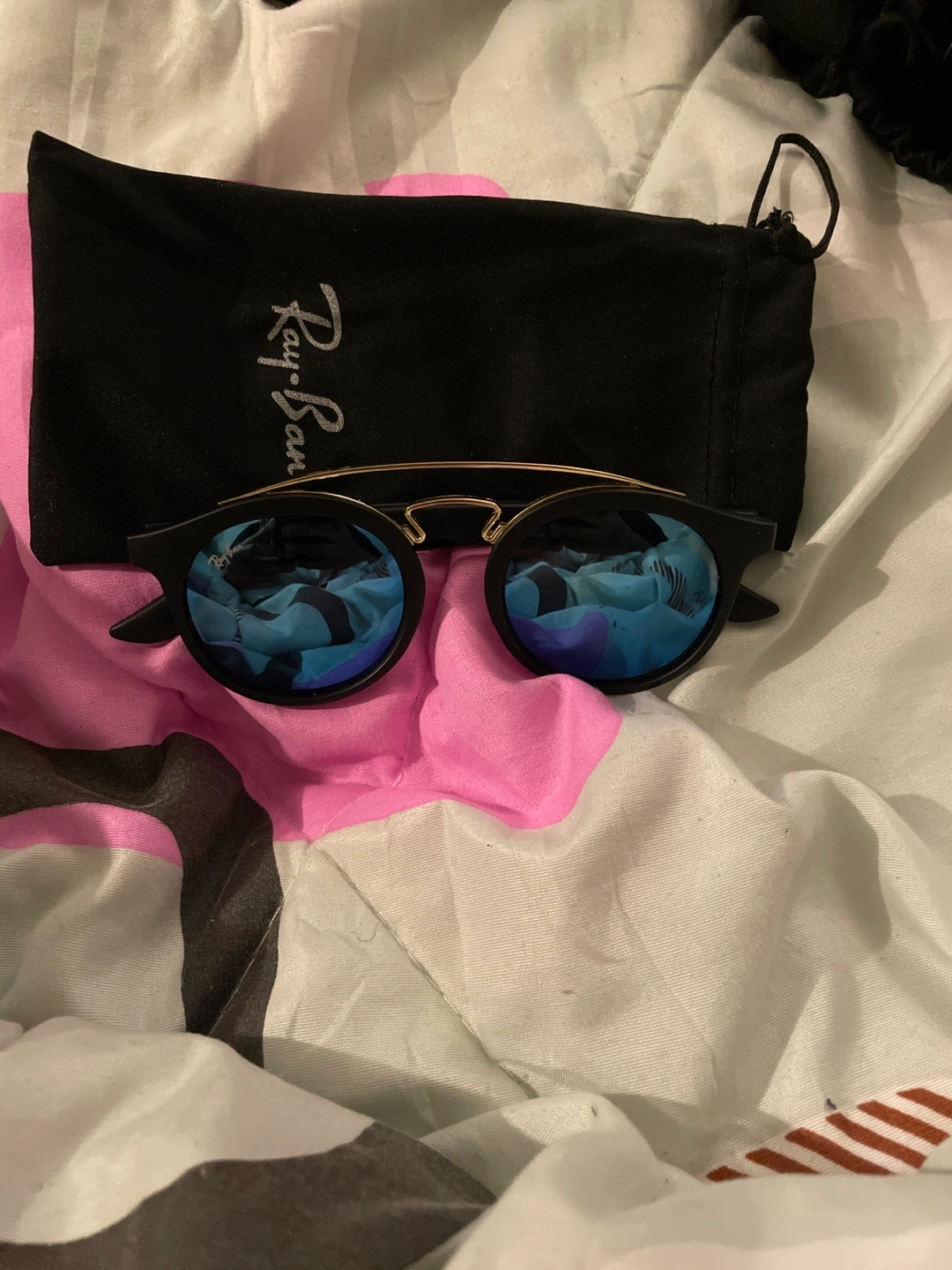 216Round blue mirrored lenses. Black frames. Gold accents. Includes soft case.