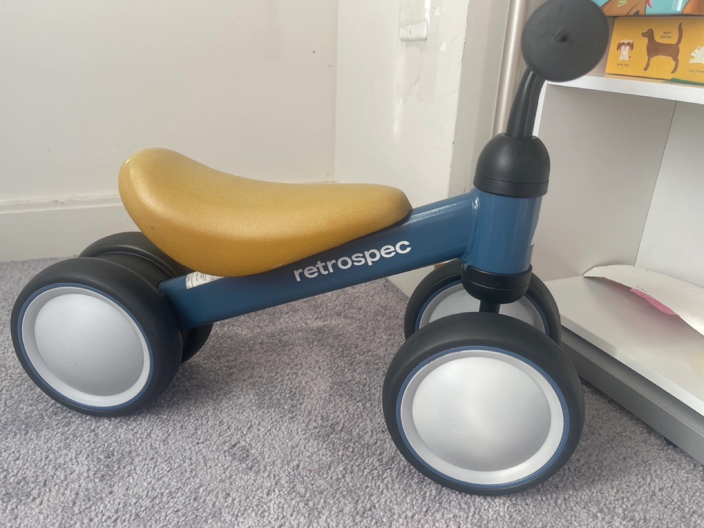 Used toddler balance bike. Durable steel frame. Four wide wheels. Easy to use. Great for developing balance and coordination. Pre owned Offers welcome