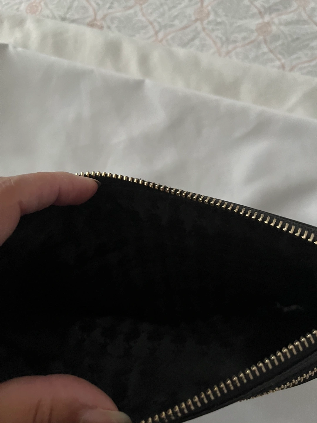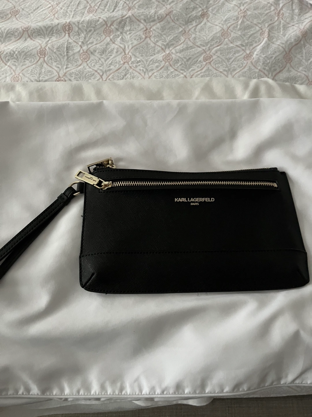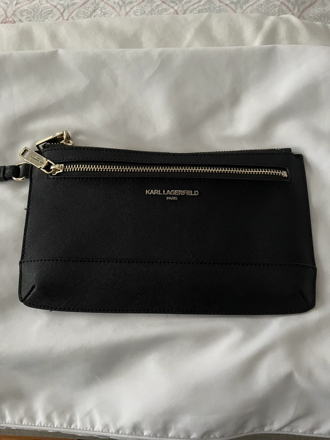 15Black leather clutch. Zip closure. Wristlet strap. Great for everyday use.
