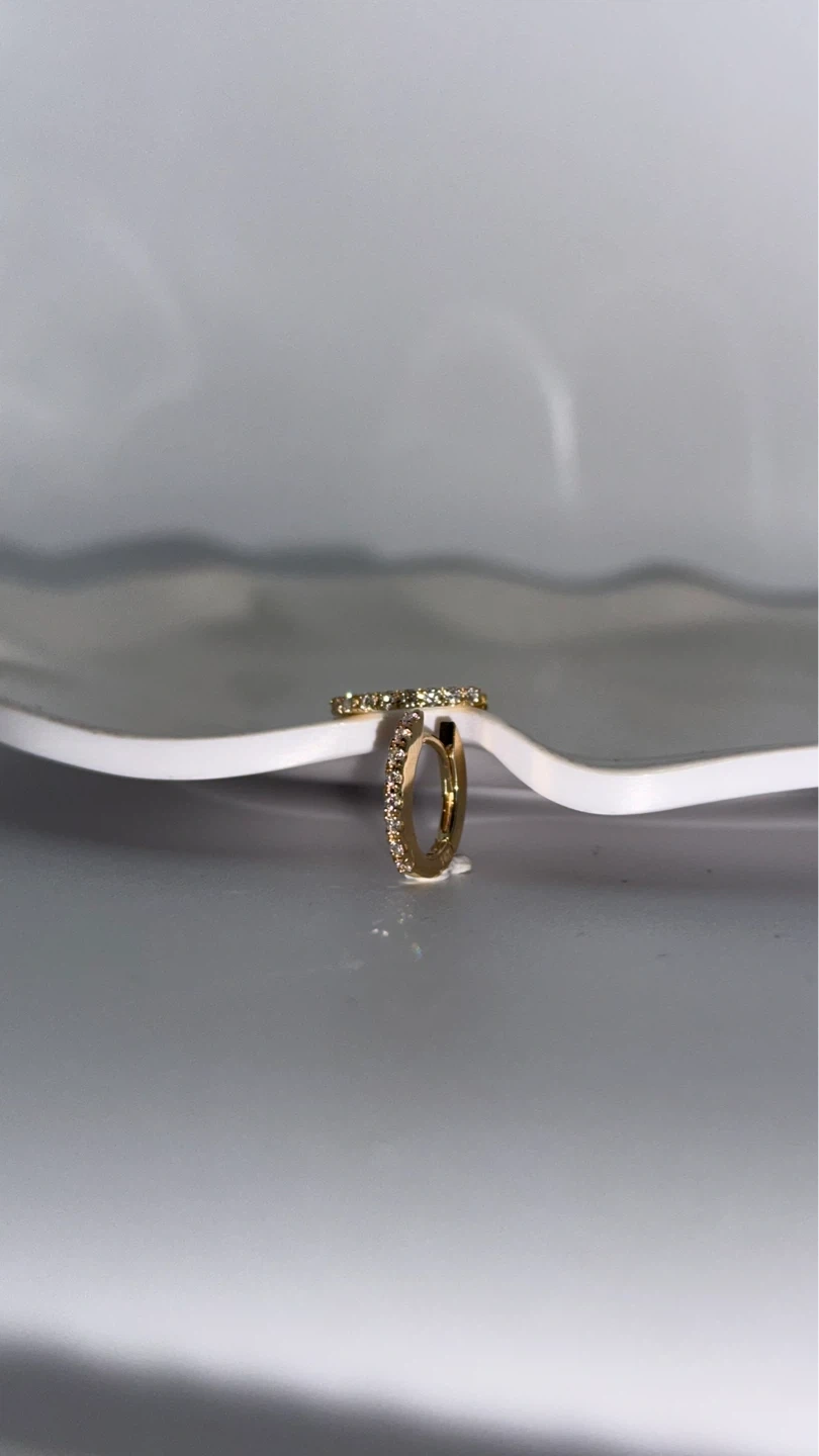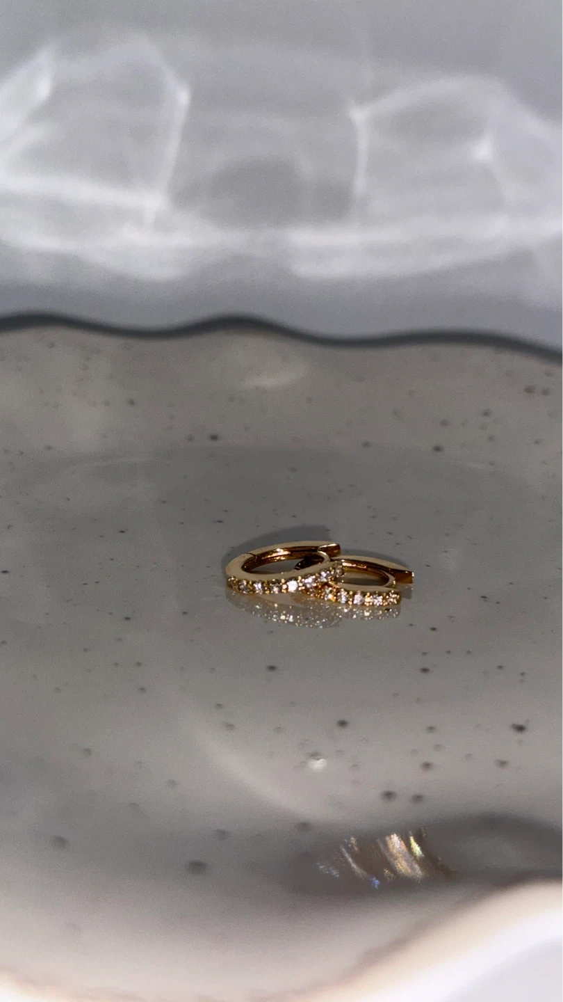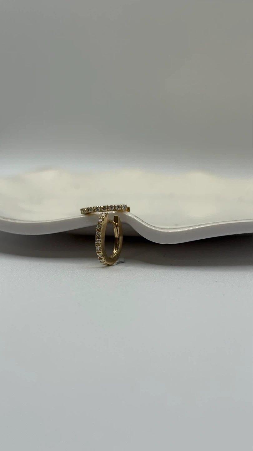 A pair of classic gold hoop earrings with small diamonds. These hoops are designed for everyday wear and add a touch of sparkle. They are made of gold and feature small, shimmering diamonds.