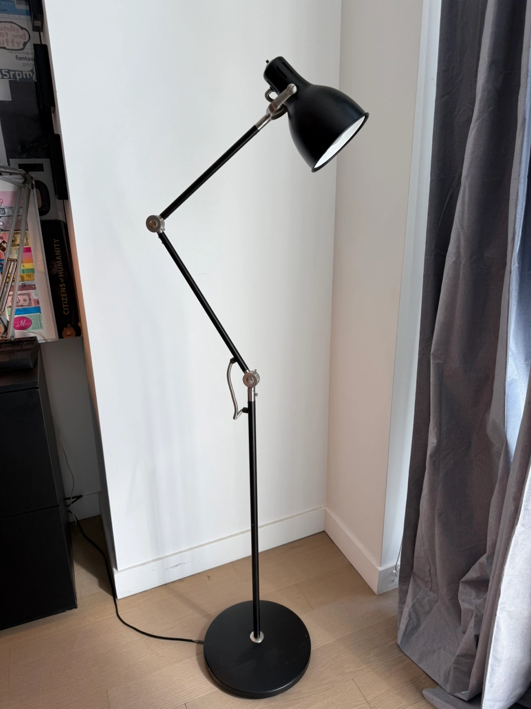 1000+Black Arod IKEA metal floor lamp. Adjustable arm and shade. Sleek modern design. Great for reading or task lighting. Great condition except the dent on floor platform (see picture) and a scratch on arm extension. 9 months old, barely used. https://www.ikea.com/au/en/p/aroed-floor-reading-lamp-anthracite-90389100/