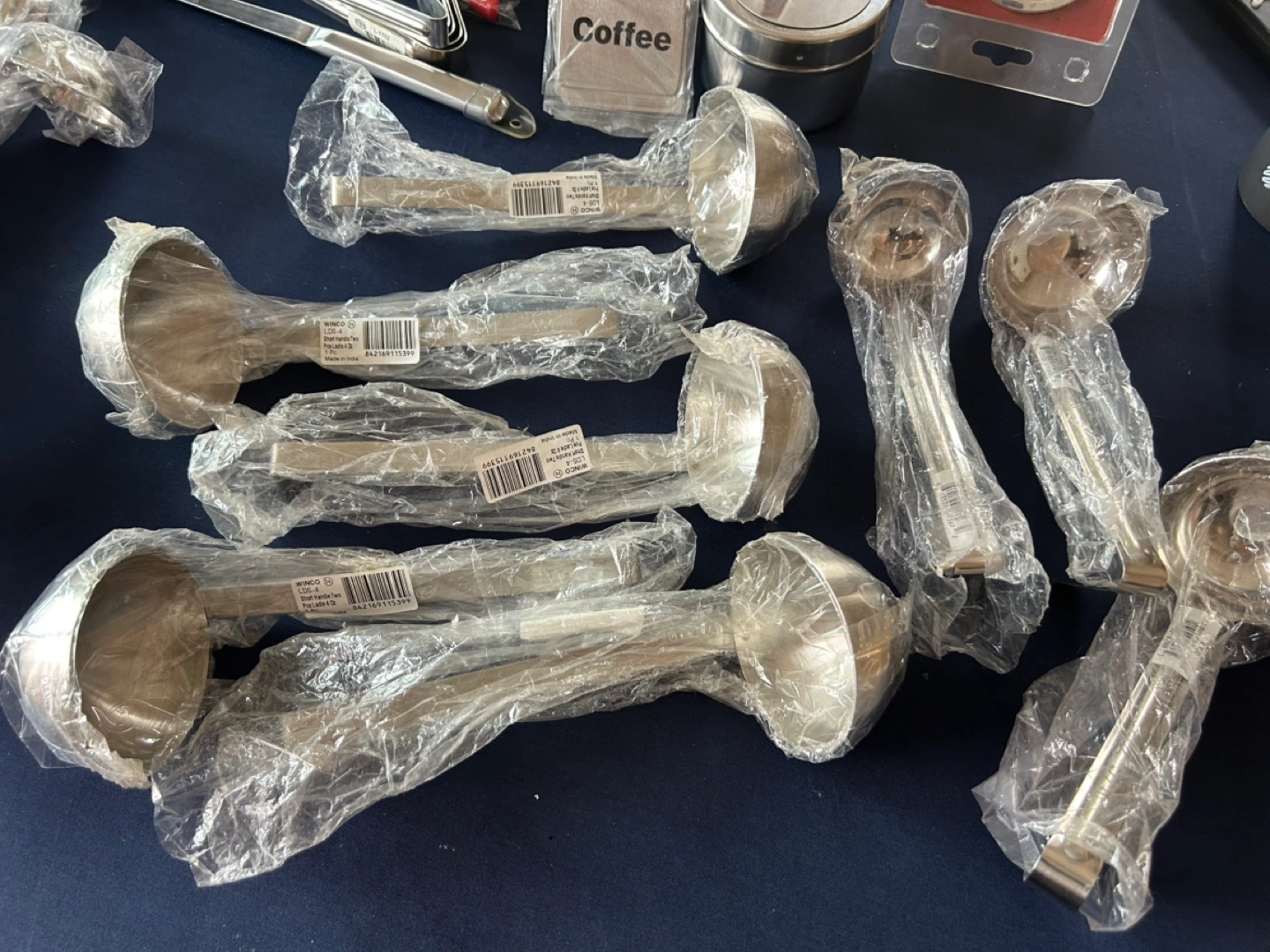 Bulk lot of variousNEW kitchen utensils and Vests. Includes ladles, whisks, tongs, spatula, measuring cup, and more. All new, still in packaging. Perfect for restaurants or catering hallsAlso includes bottles of Weiman Granite & Stone Disinfectant.