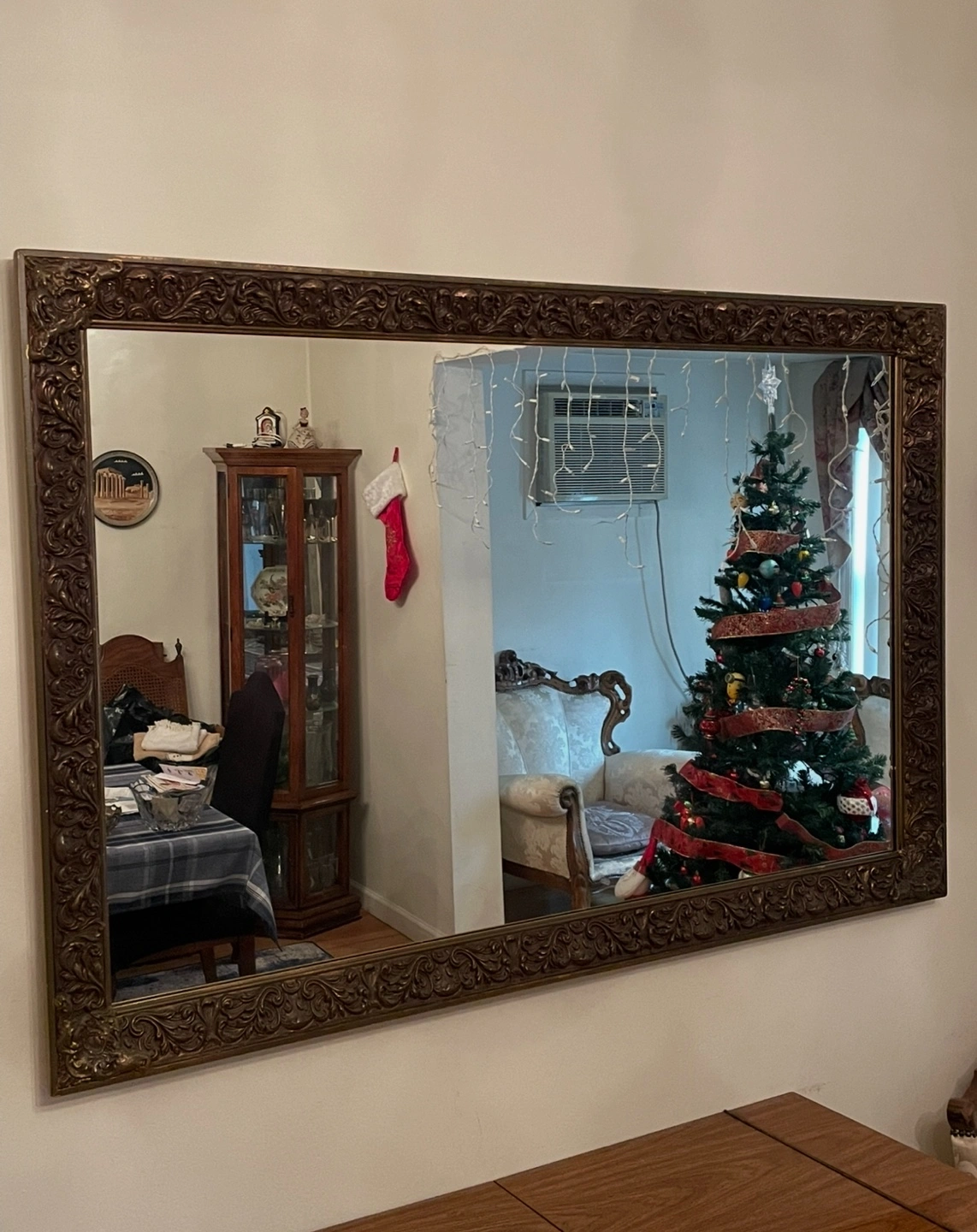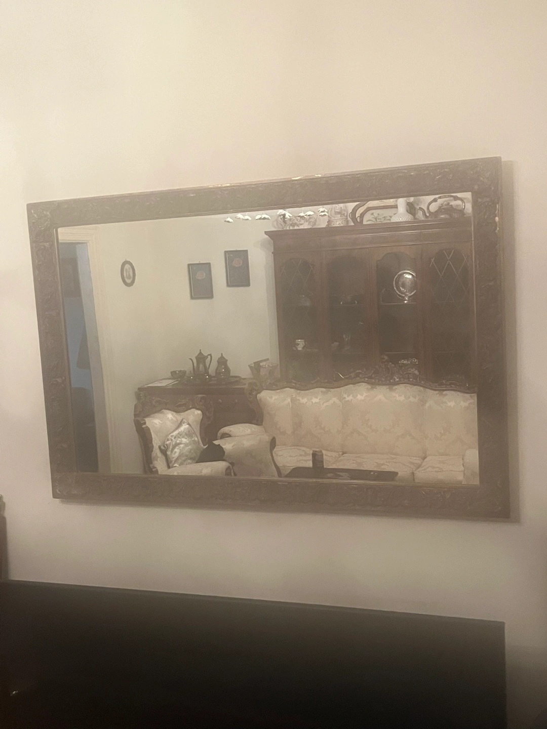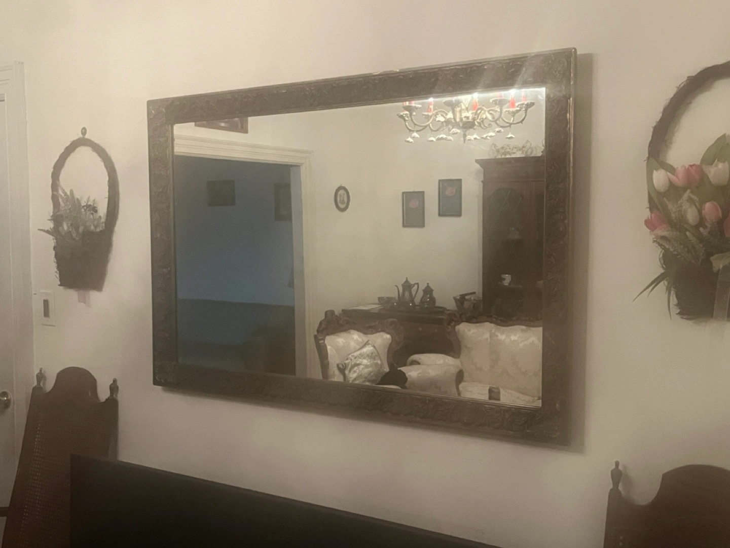 Large rectangle mirror. Ornate brown frame. Great for a living room or entryway. Adds a touch of elegance to any space. Good condition. Dimensions are approximately 54" x 36”.