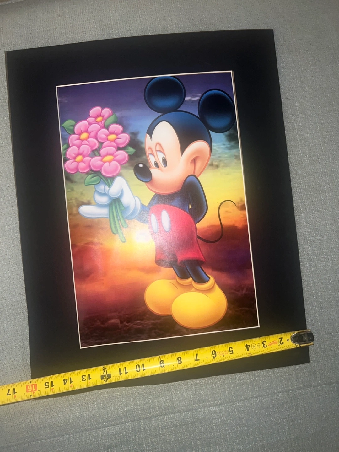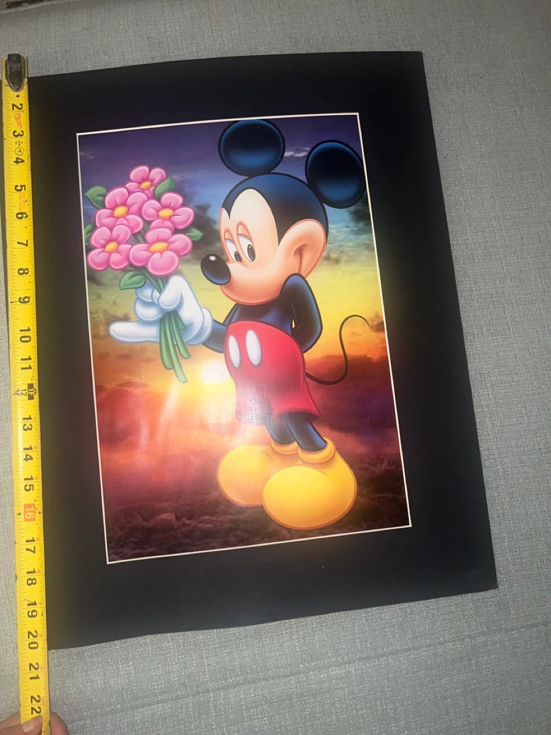 Framed Mickey Mouse print. Features Mickey holding flowers at sunset. Matted print, approximately 11x14 inches. No visible artist information.