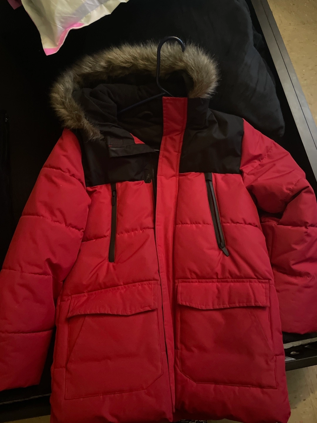 216Warm winter coat. Red and black color block design. Features a faux fur trimmed hood and zipper closure. Multiple pockets.
