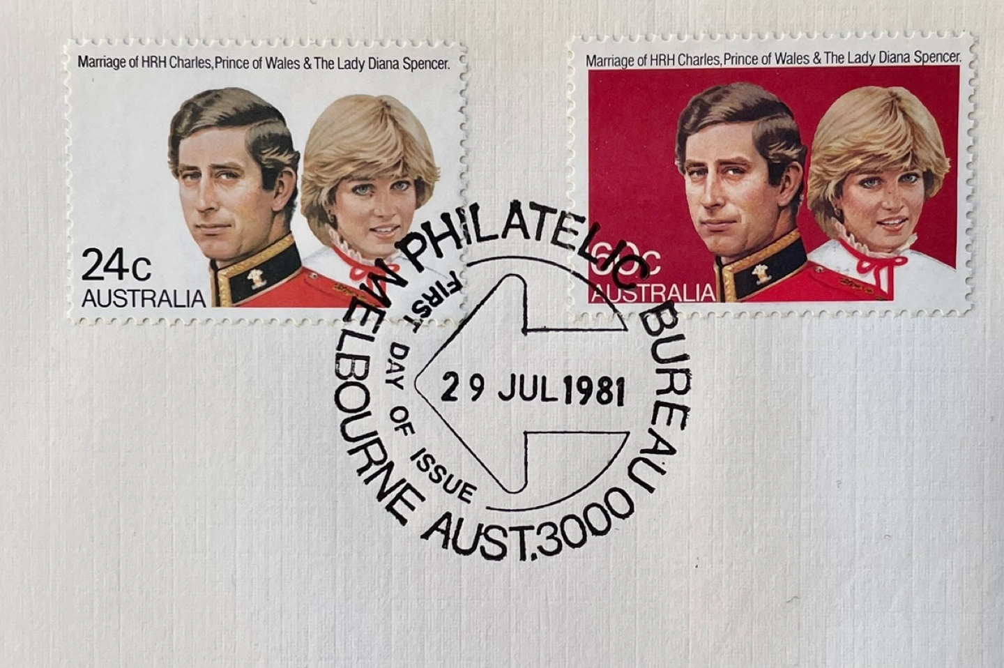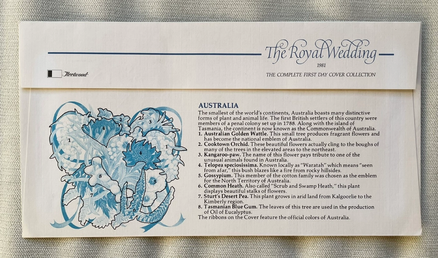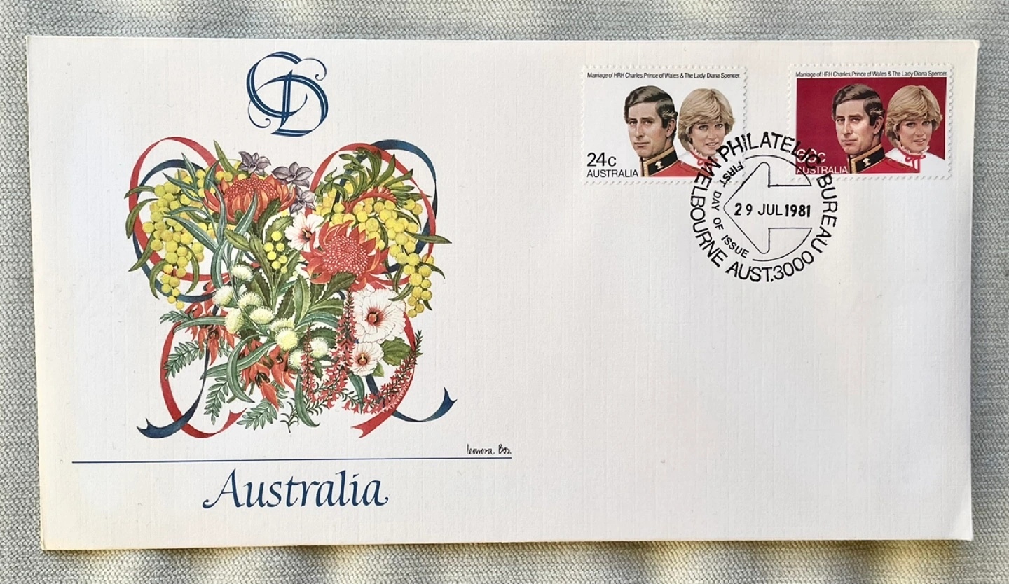 130PRINCESS DIANA PRINCE CHARLES 1981 ROYAL WEDDING AUSTRALIA FDC FIRST DAY COVER A first day cover issued by Australia for the 1981 Royal Wedding of Princess Diana and Prince Charles. Featuring two stamps celebrating the marriage of Diana and Prince Charles. - First day of issue: July 29, 1981 - Has two stamps with the engagement photos of Lady Diana Spencer and Prince Charles - Excellent Condition - 24 Cent white background stamp featuring Diana and Charles from their engagement photo - 60 Cent red background stamp featuring Diana and Charles from their engagement photo - Cachet design by artist Leonora Box with a description on the reverse about the unique flowers pictured. Please check out my other Royal Wedding and royal family items!!