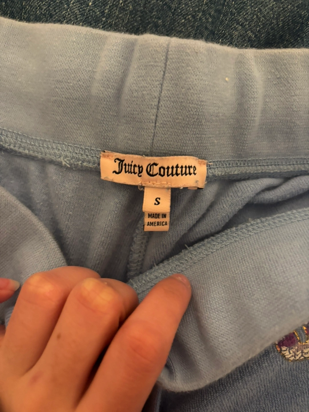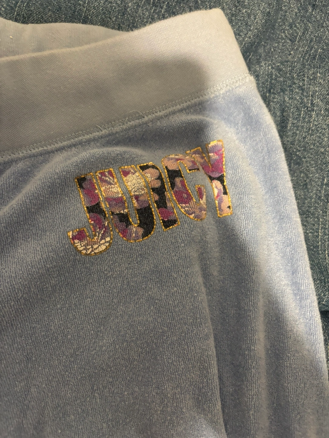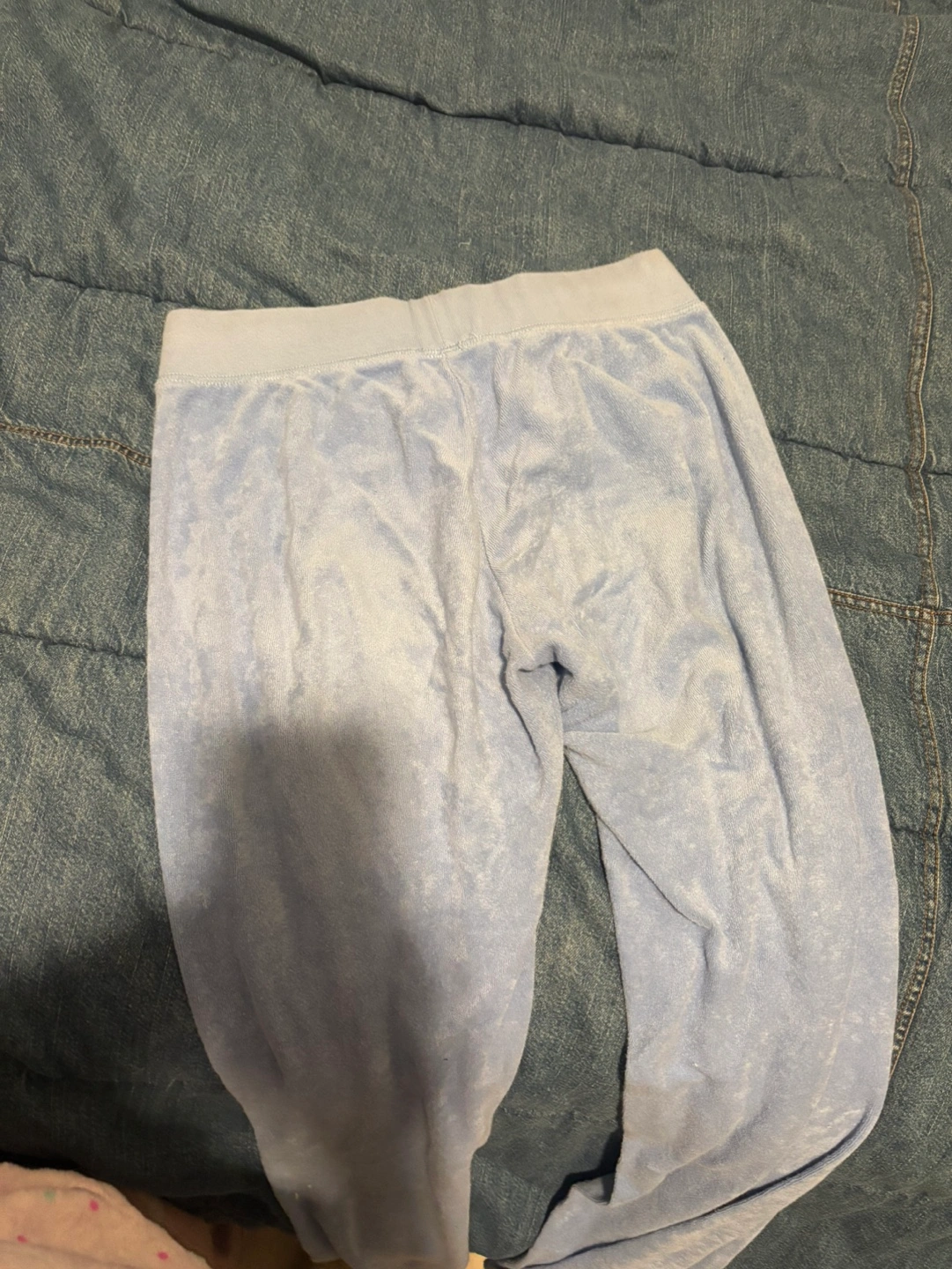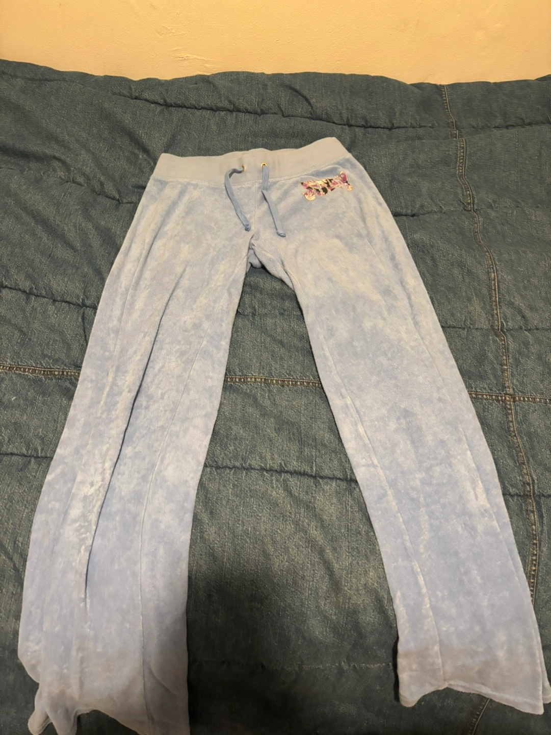 174Light blue velour track pants. Size small. Made in America. Floral Juicy Couture logo on back. Drawstring waist.