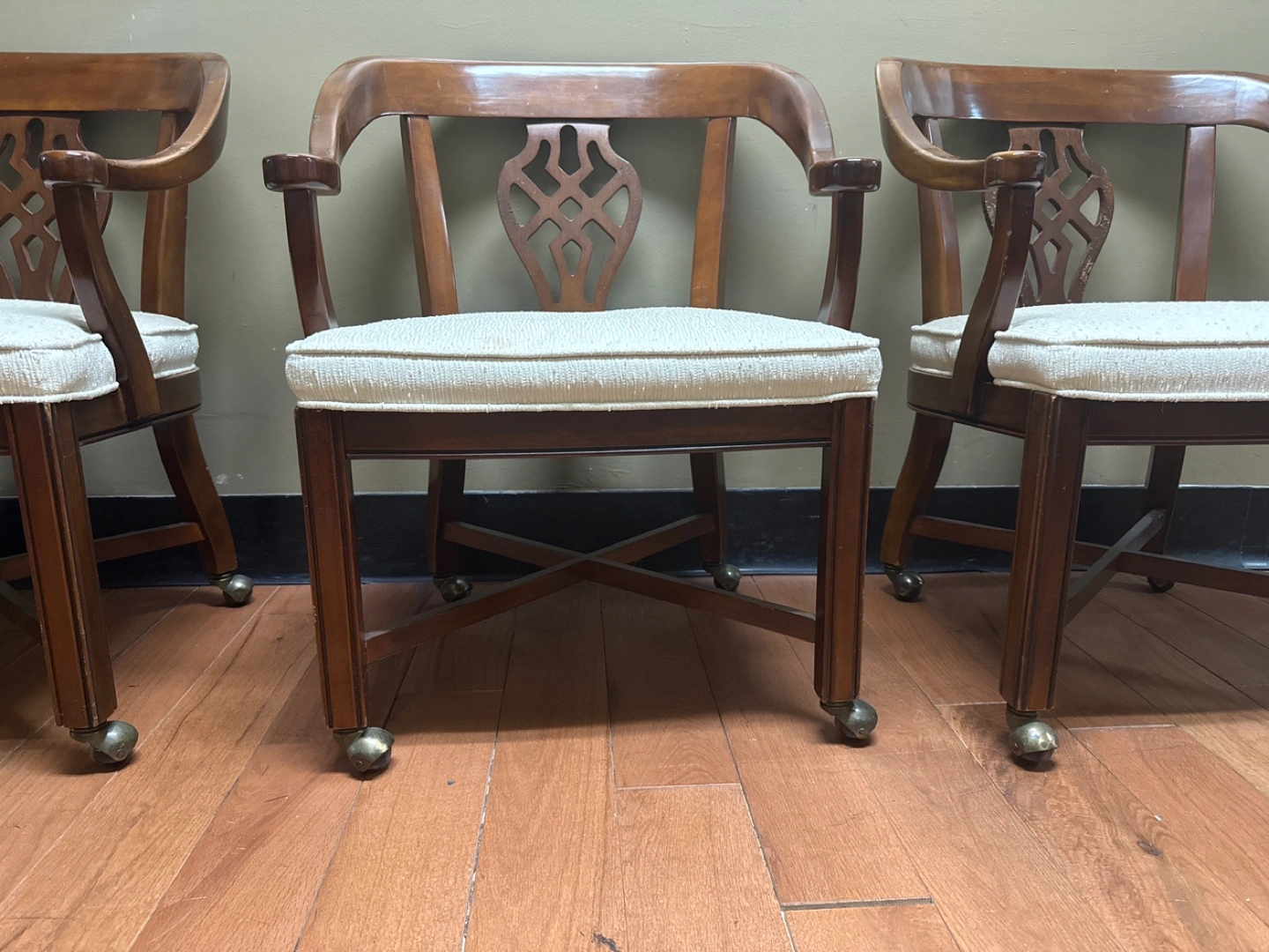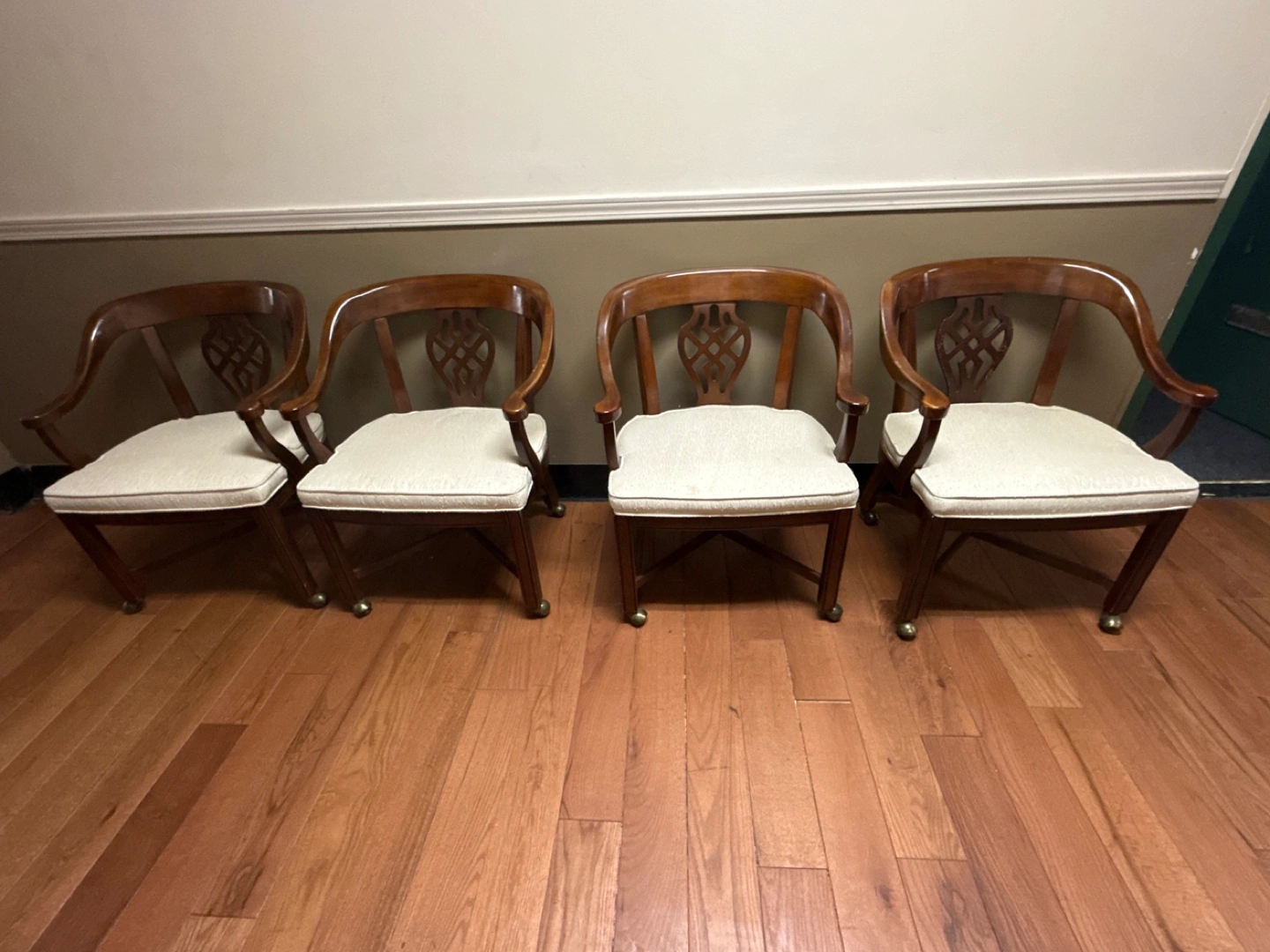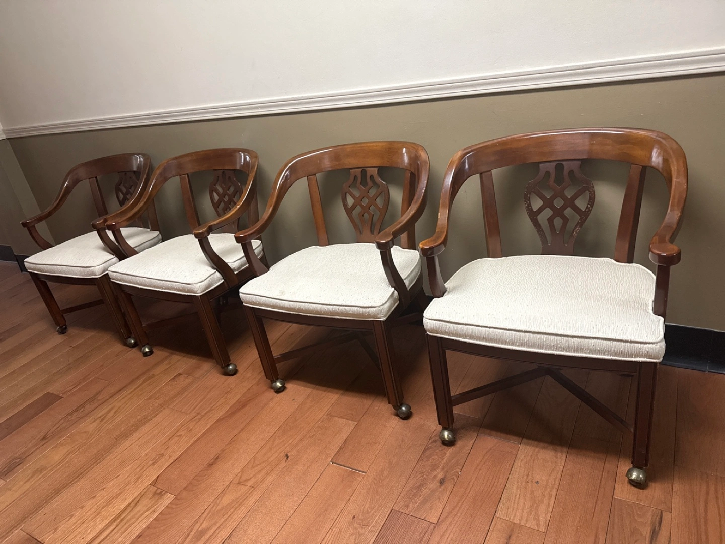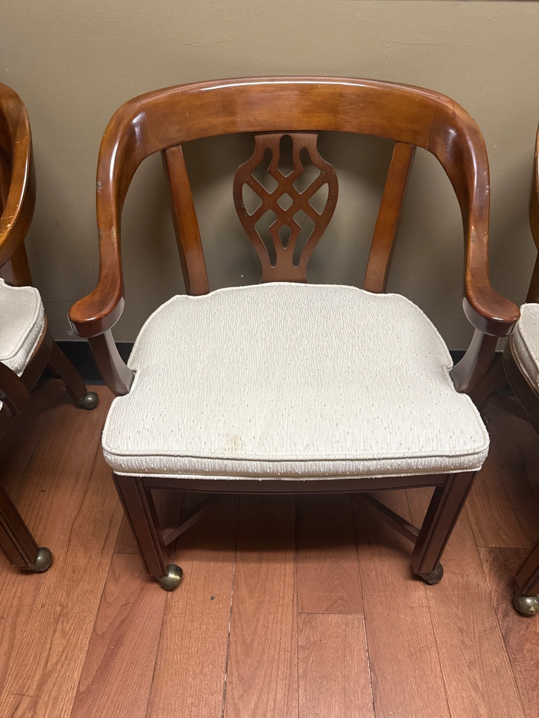 Four wooden armchairs, off-white cushioned seats, dark brown wood. Classic design, elegant style. Caster wheels for easy mobility. Solid wood construction. Great for dining room or office.