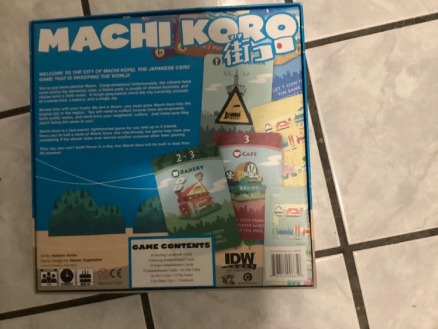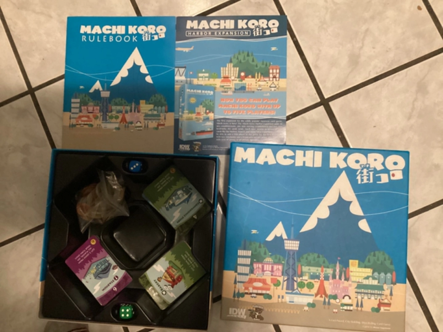 Complete Machi Koro board game. Includes rulebooks, game board, cards, and dice. Fun for 2-3 players. Great condition.