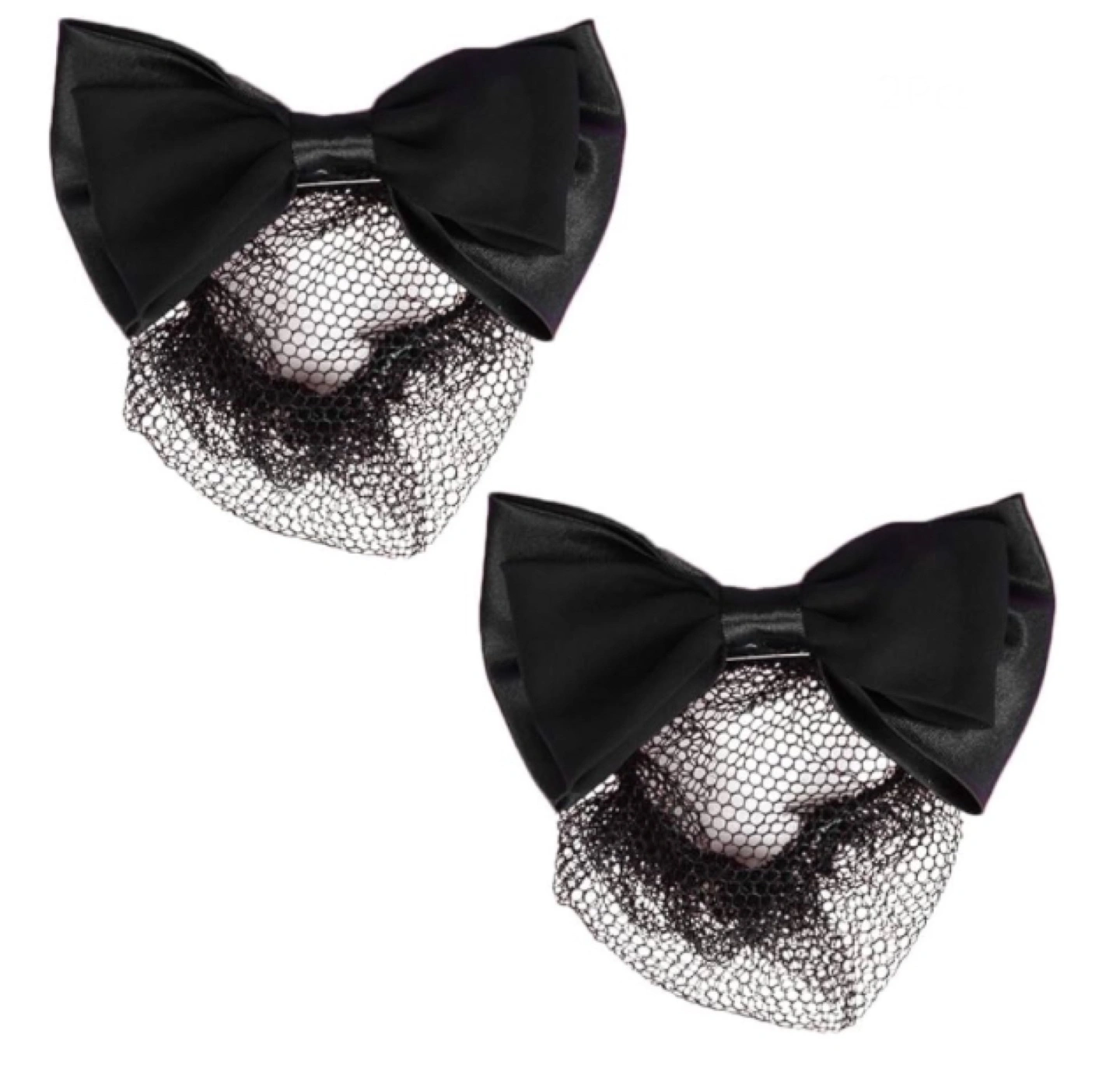 Pair of black hair nets. Each features a large black satin bow and clip. Perfect for updos and buns. New