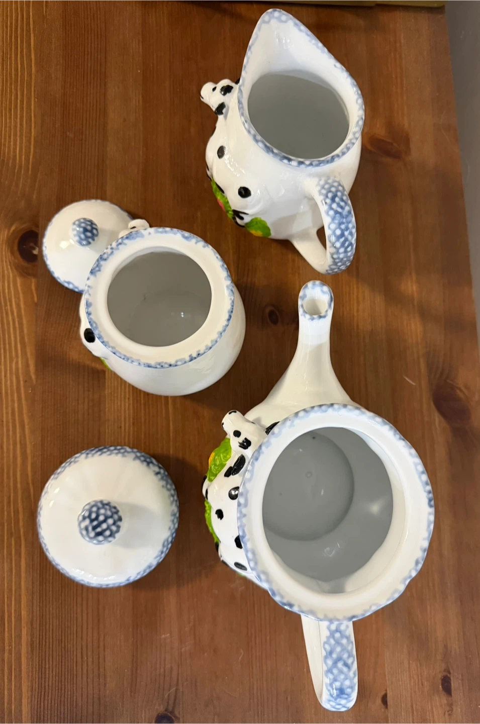 This is a cute set of a cow-themed creamer, sugar bowl, and teapot. The set is white with black cow spots and a blue floral trim.
