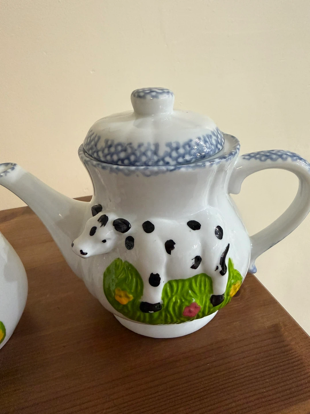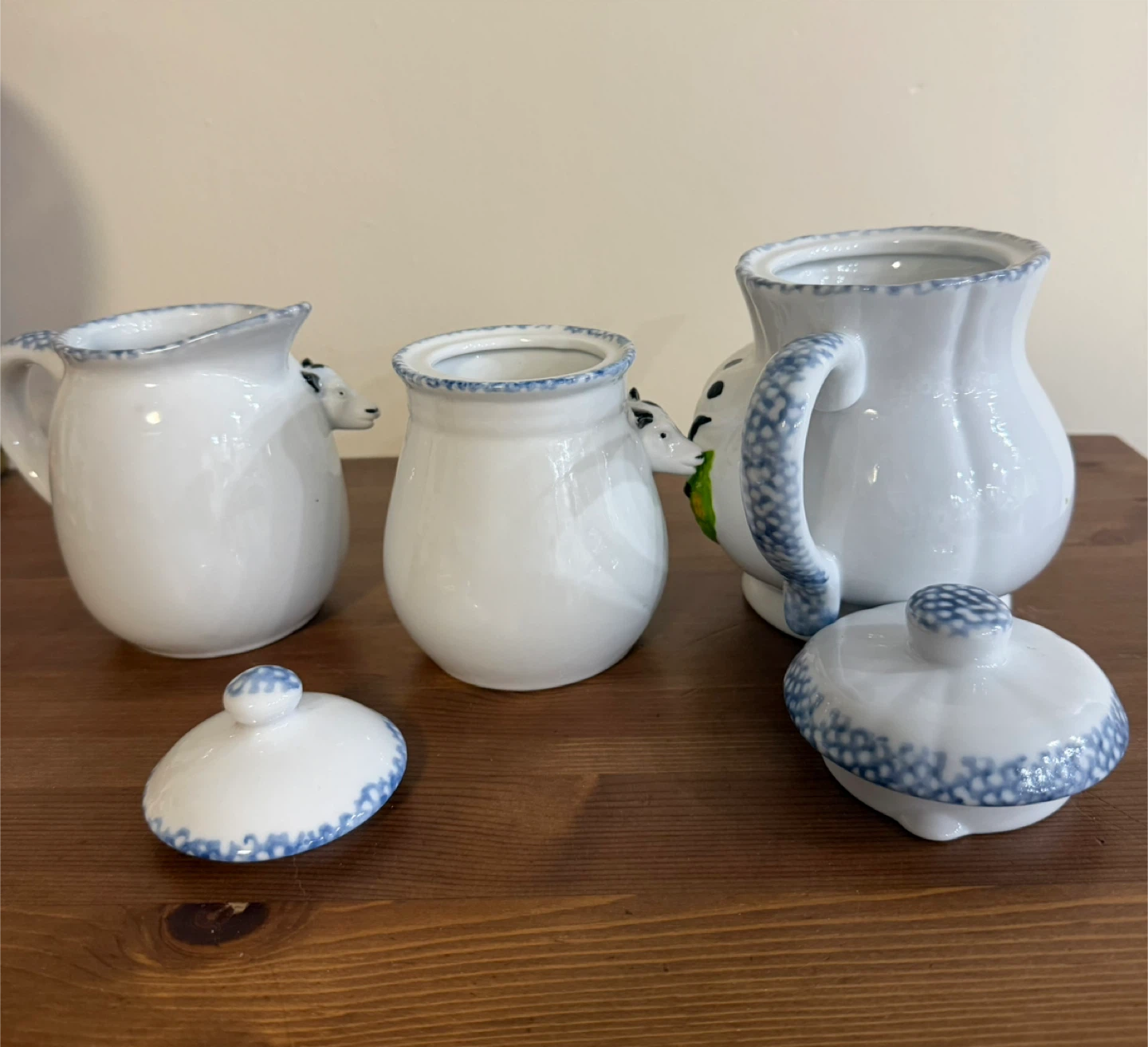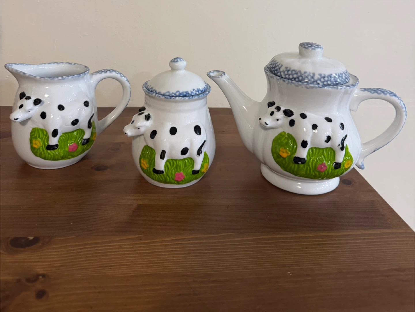 This is a cute set of a cow-themed creamer, sugar bowl, and teapot. The set is white with black cow spots and a blue floral trim.
