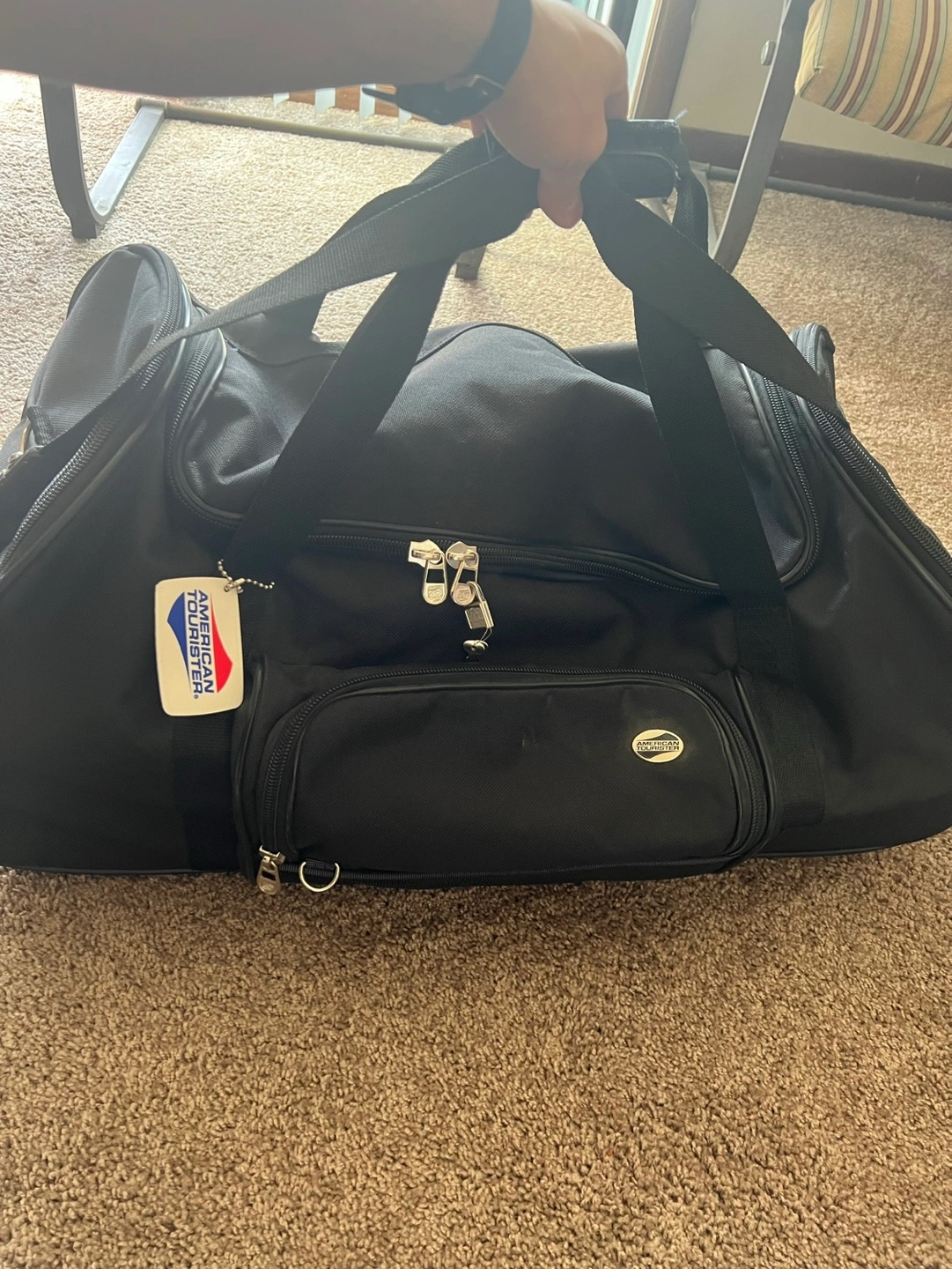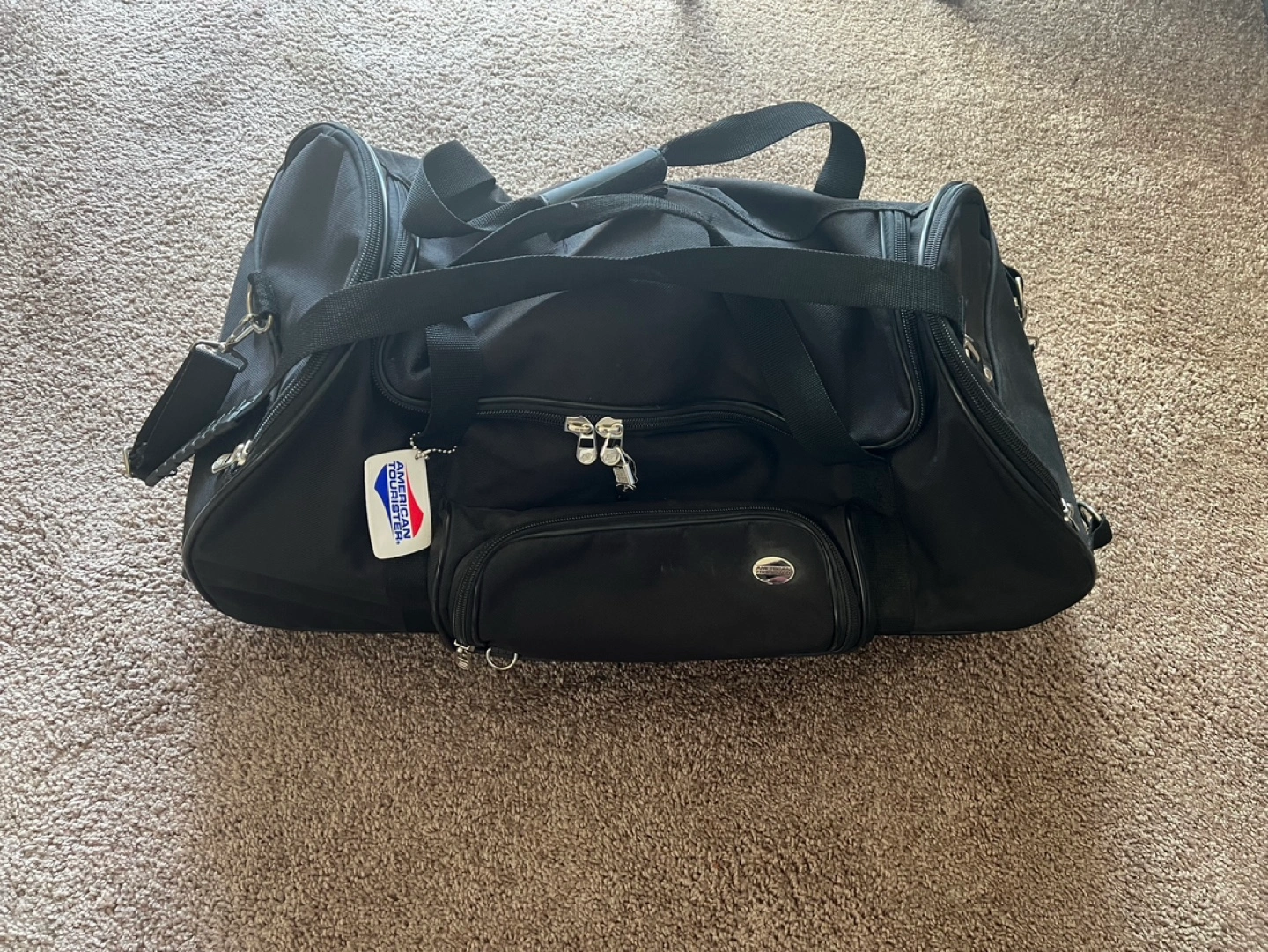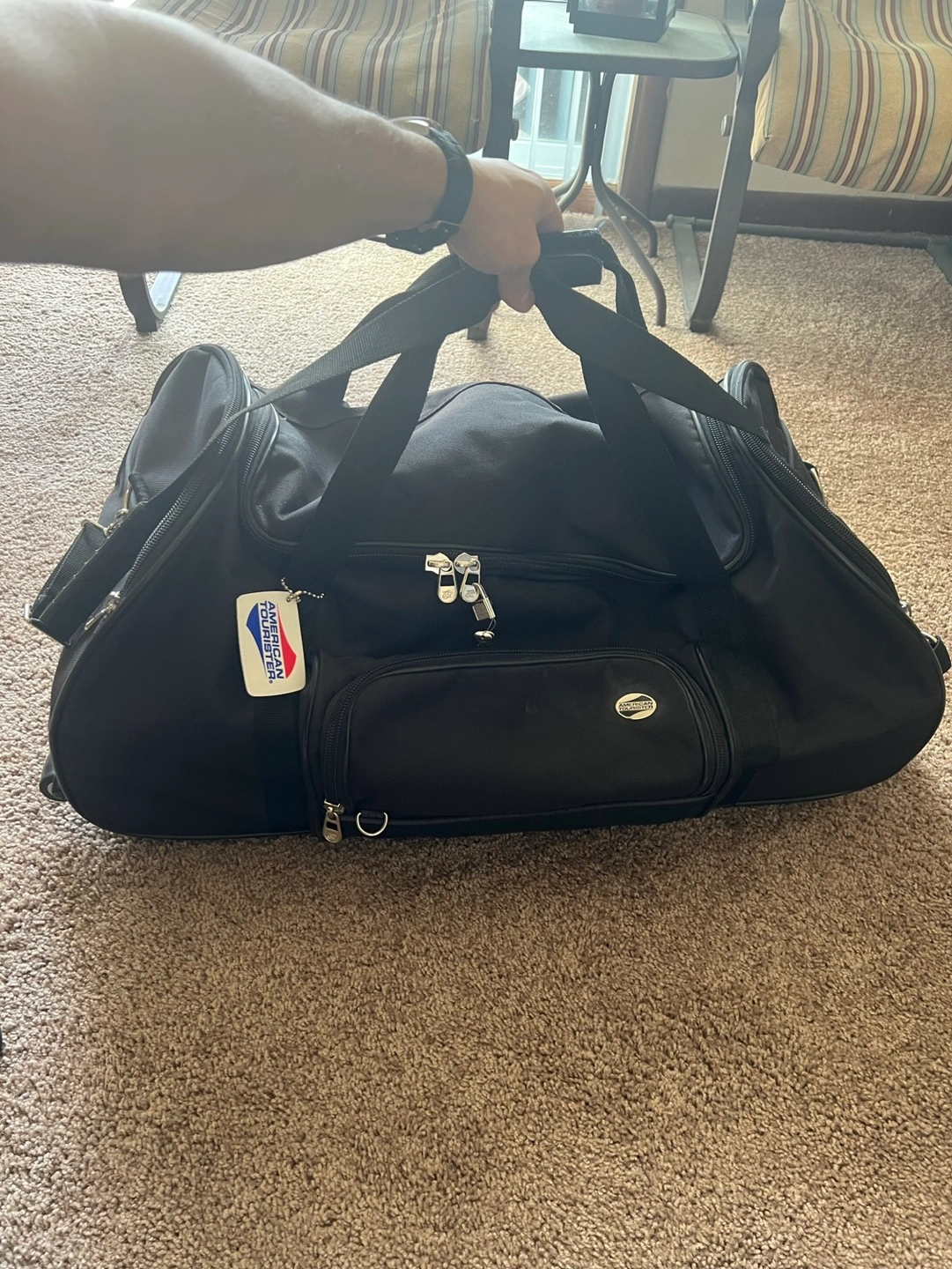 Large black duffle bag. Multiple compartments. Zipper closure. Durable material. Great for travel or storage. With wheels make offer.