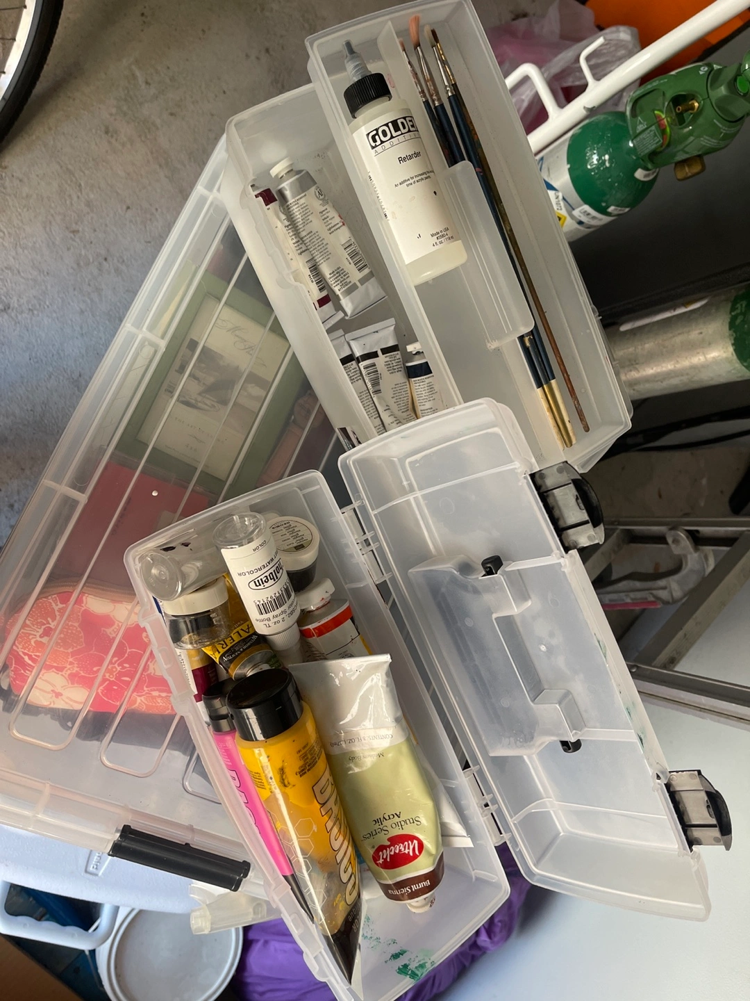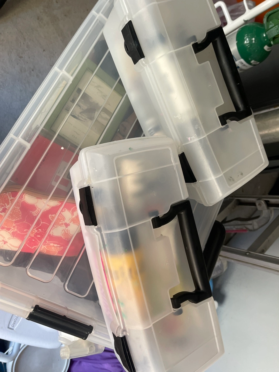 352Set of two clear plastic storage containers. Black latches and handles. Contains various art supplies including paints, brushes, and other small items. Great for organizing and storing crafting materials.