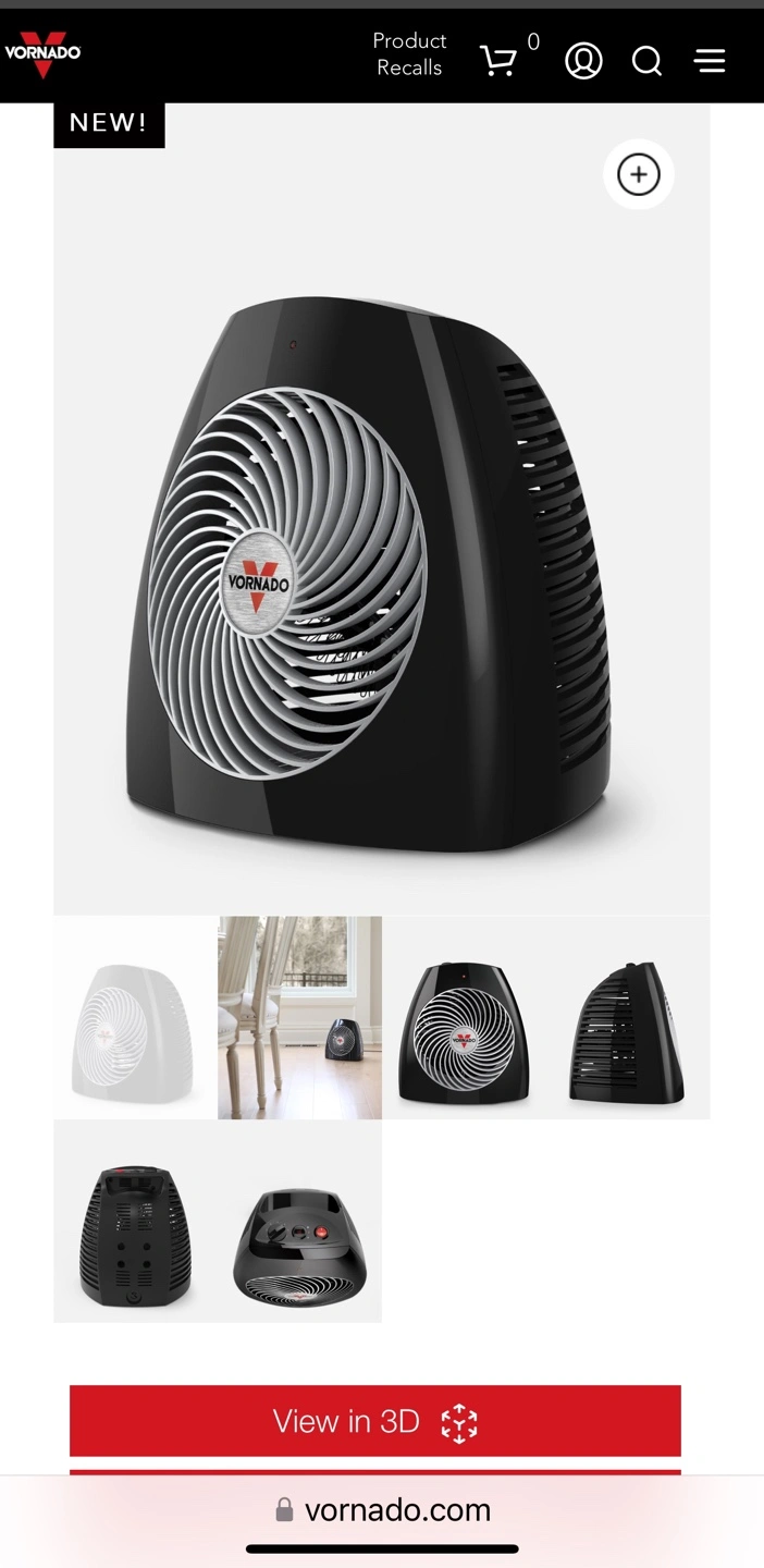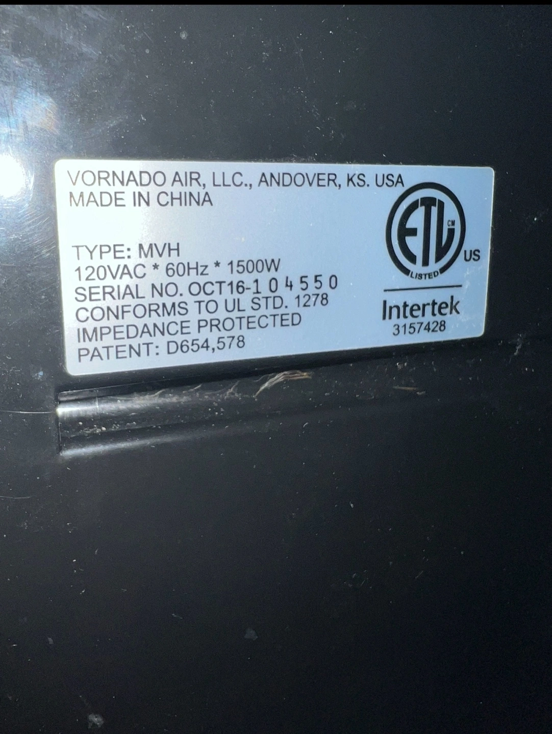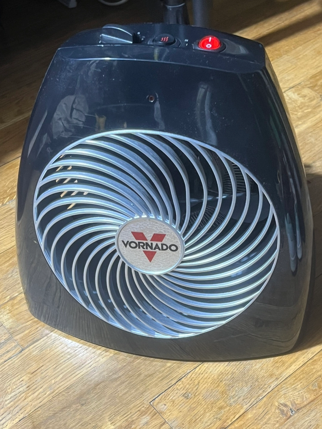 Black Vornado compact heater. Three heat settings plus fan only. Good for small spaces. Includes power cord.