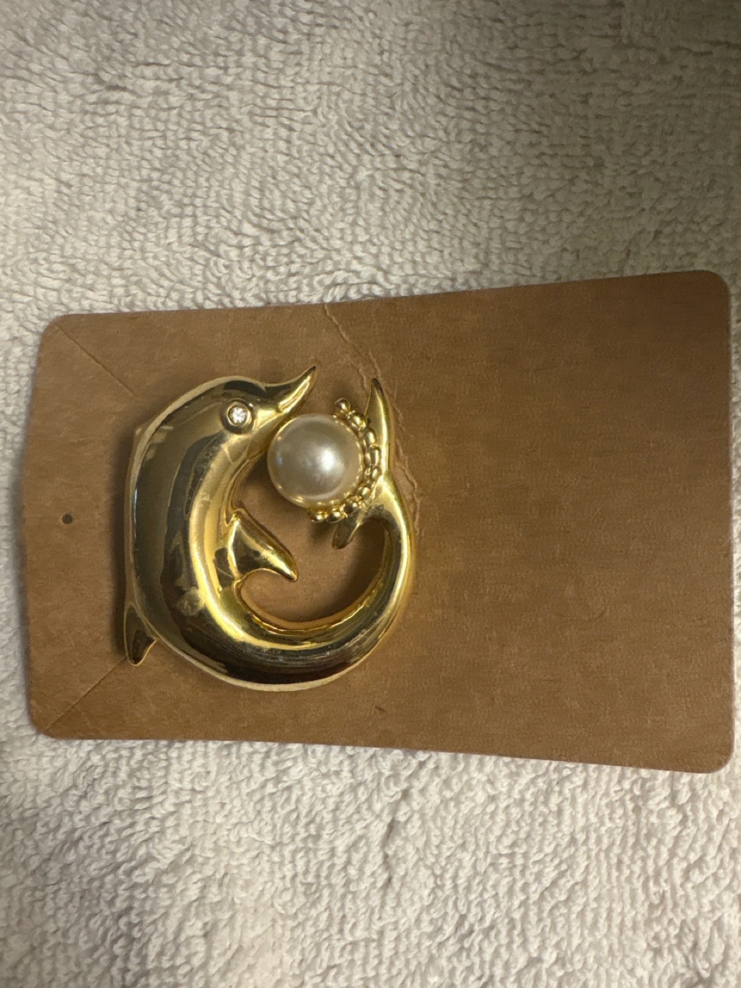 Beautiful gold-tone dolphin brooch. Features a faux pearl. Looks great on a jacket or dress.