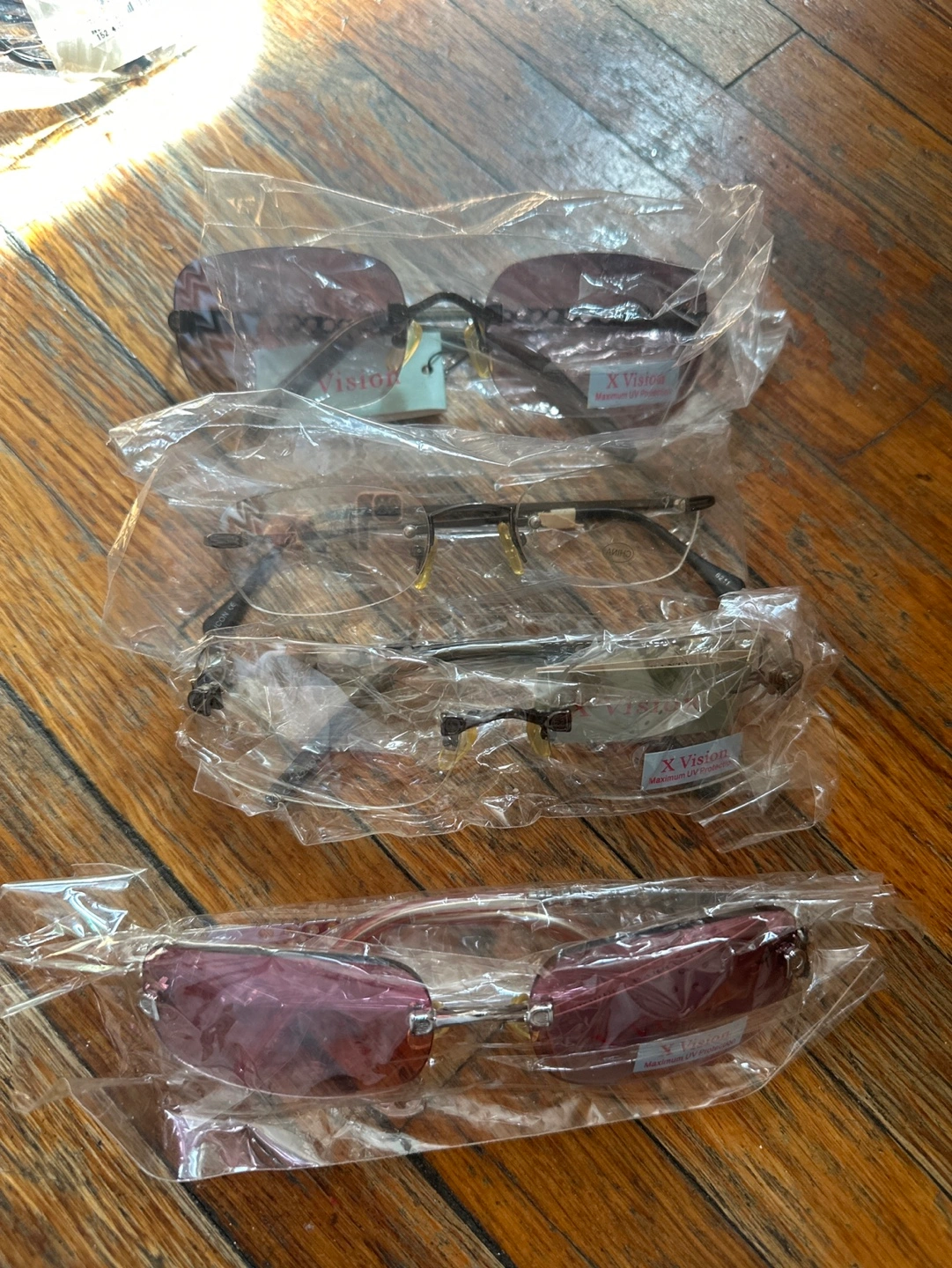 106Three pairs of new X Vision sunglasses. Two pairs have brown lenses, one pair has pink lenses. All are rimless. Packaged individually.