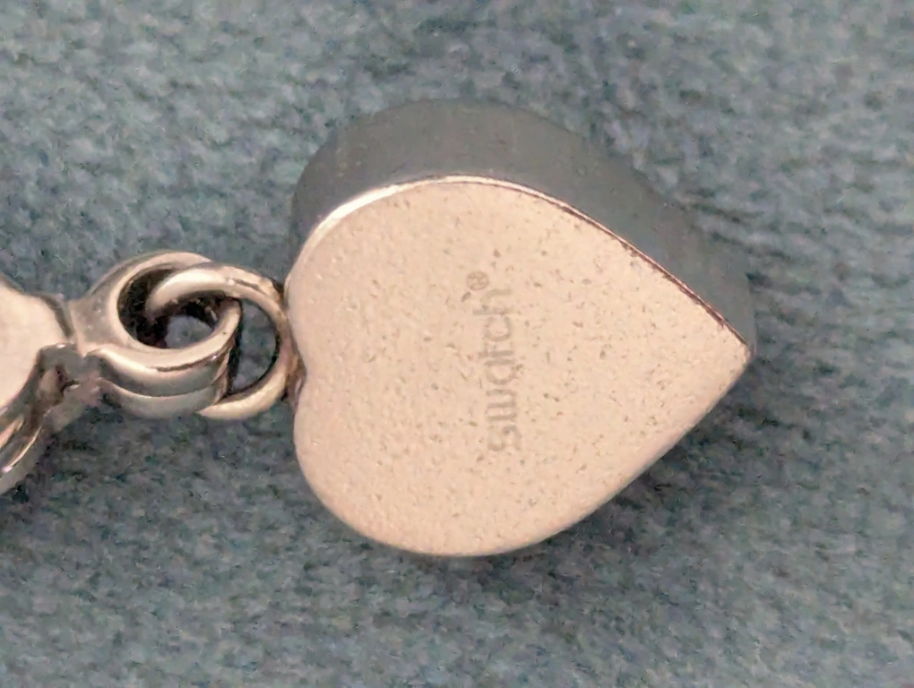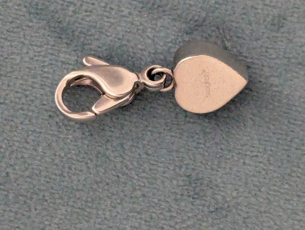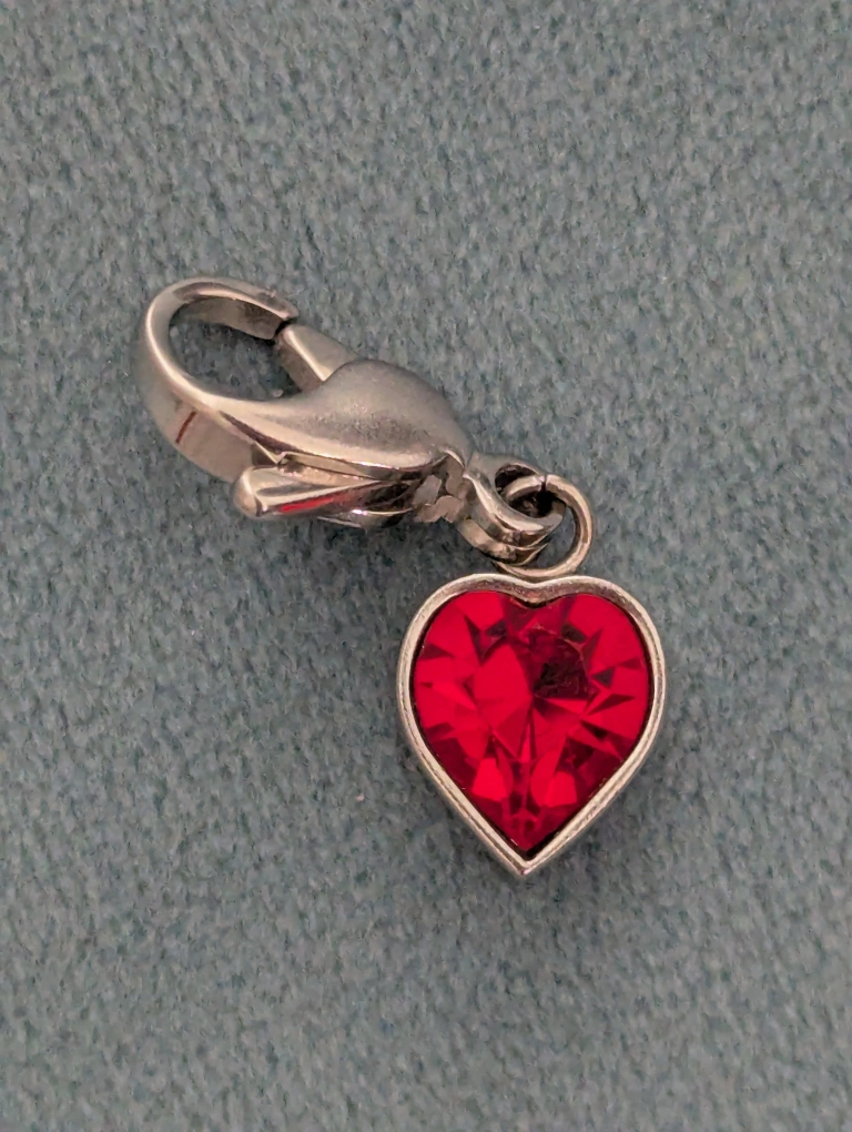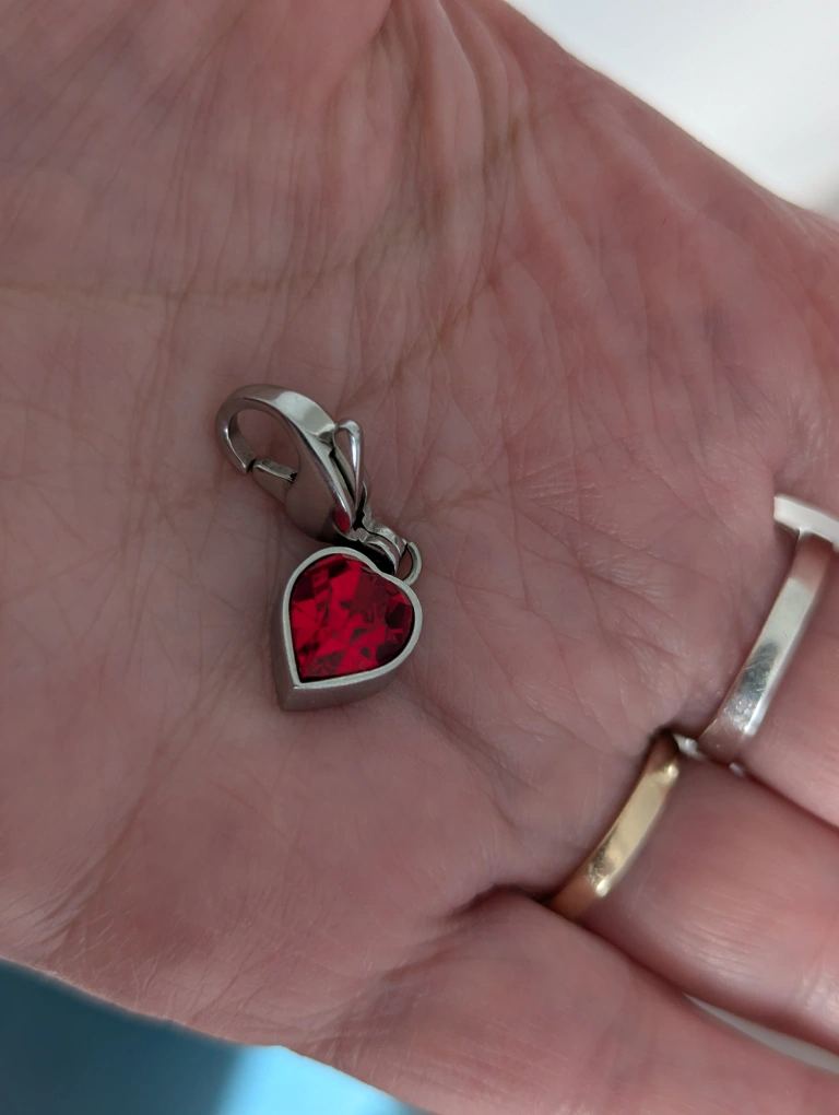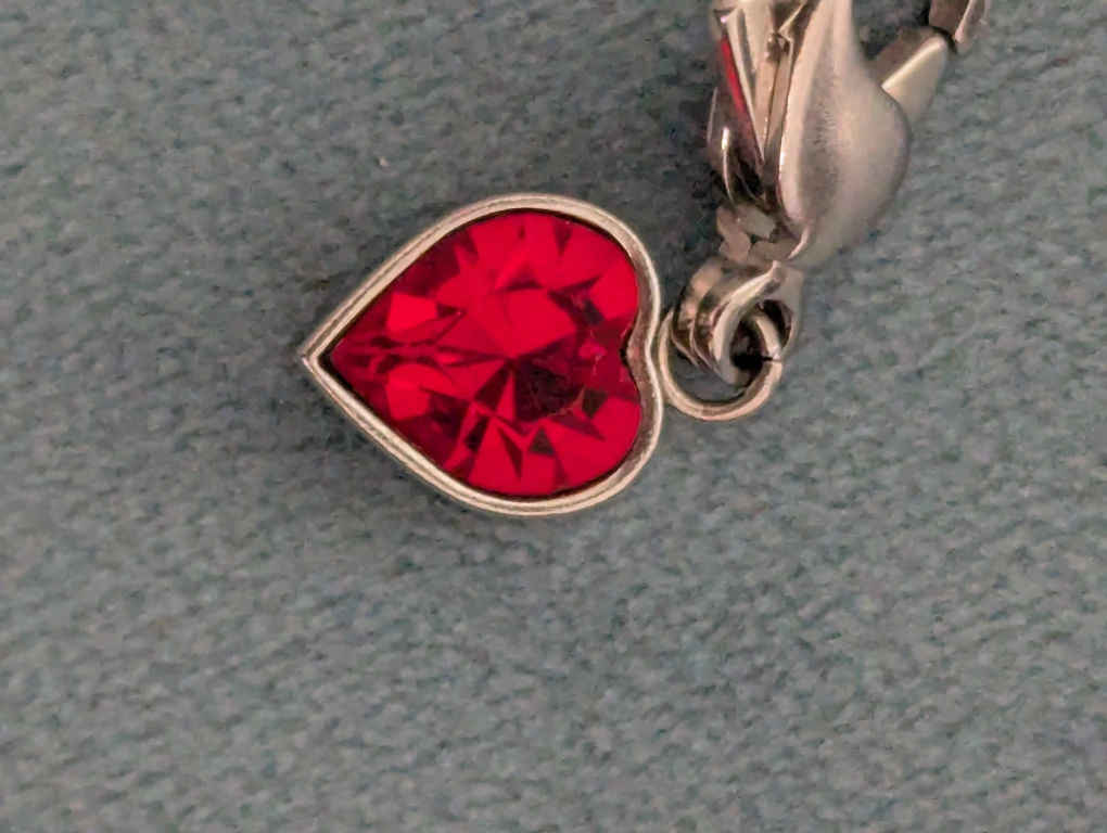 Silver-toned metal heart charm. Features a red crystal. Lobster clasp. Perfect for adding to a bracelet or necklace.