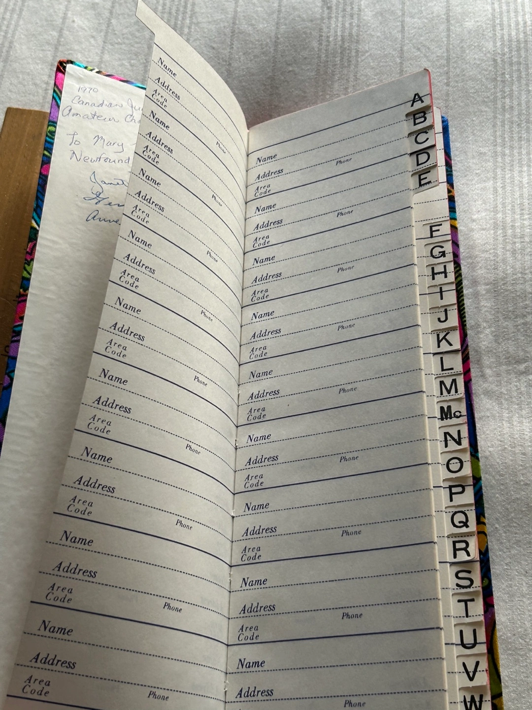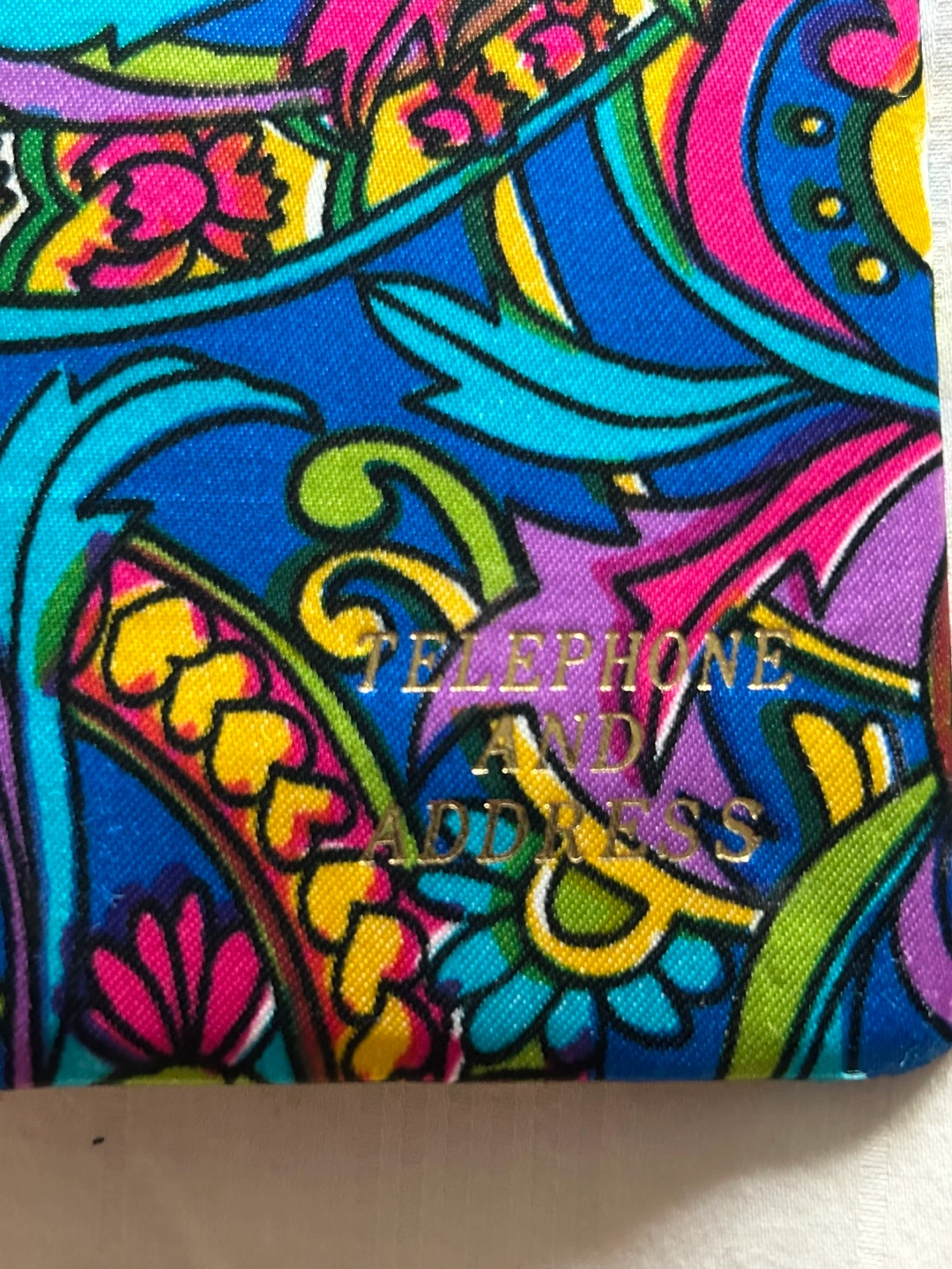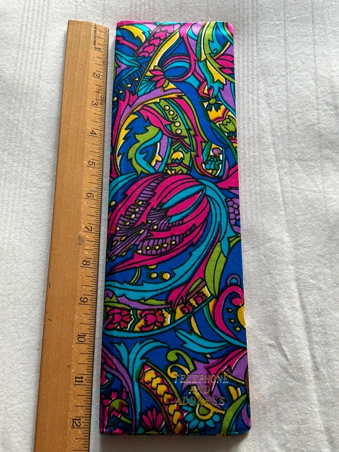 1000+12" tall Vintage Retro Psychedelic Fabric phone book address mint 1970s Floral Cover Funky Decor MCM 12 inches high 3.5 inches high Fantastic hippy silk psychedelic address and telephone phone book Amazing condition Not written in Does have 1970 dedication inscription that is very cool too The NFLD amateur golf team 12.00 Flexible re pickup Elmsdale Road M4J 3M3 Donlands O'Connor East York Don Mills south exit off DVP