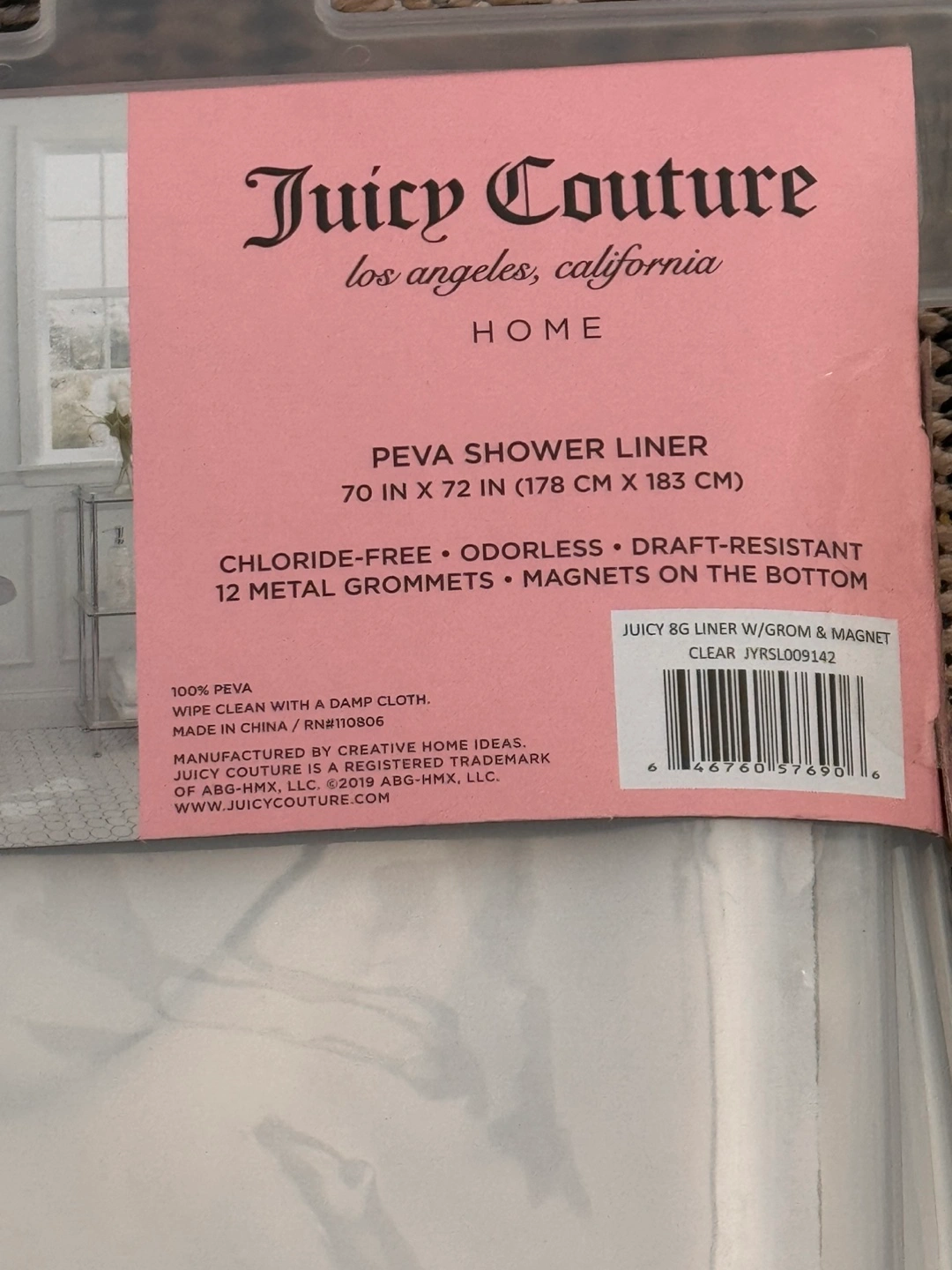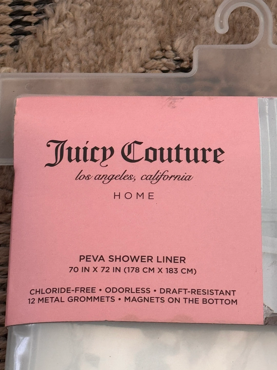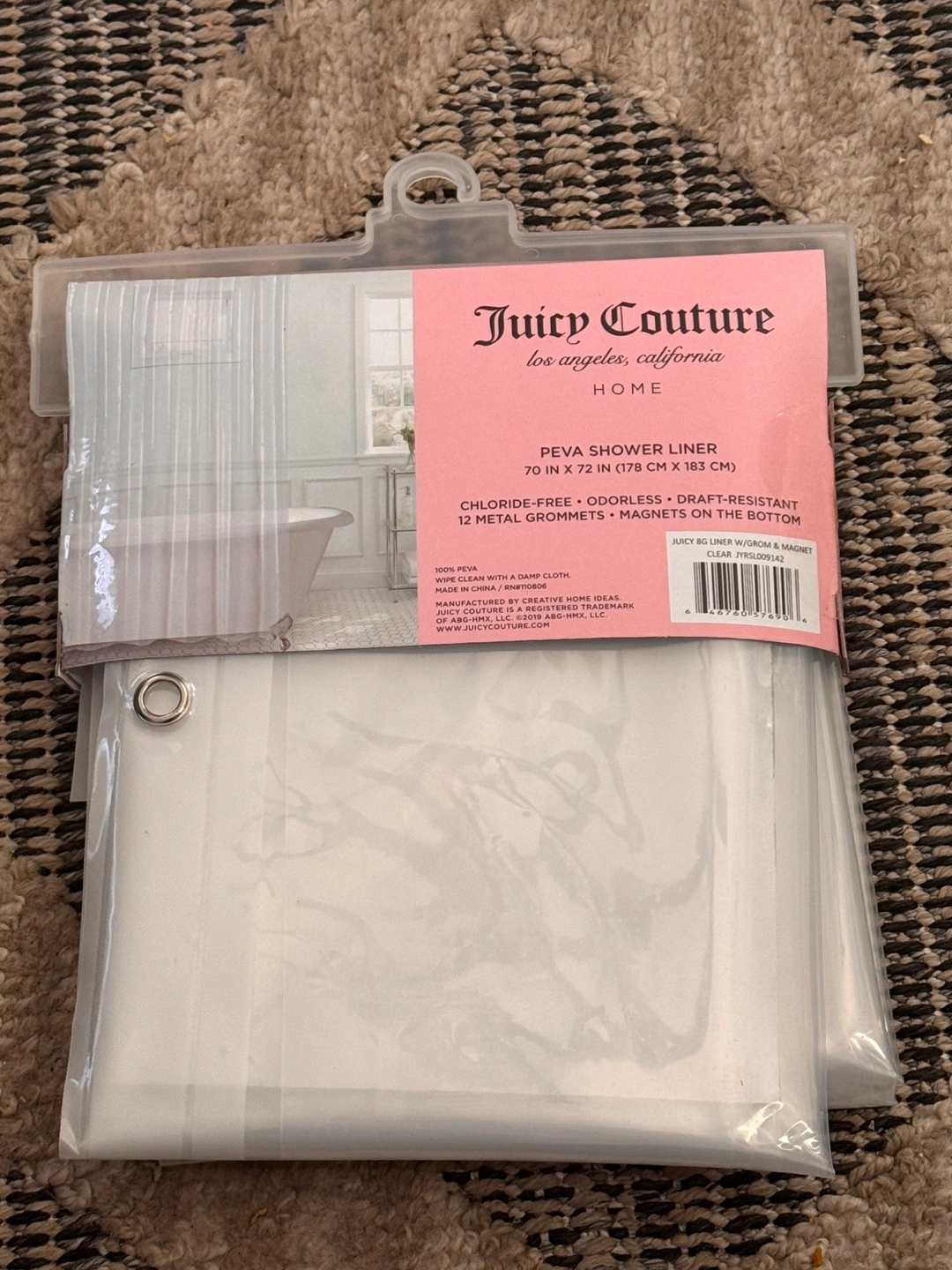 103New Juicy Couture shower liner. Clear. PEVA material. 70" x 72". 12 metal grommets. Magnets on the bottom. Draft-resistant. Odorless. Chloride-free. Available for local pickup by Schaumburg and Barrington Road in Schaumburg IL 60194 or shipping to your doorstep for one low price with tracking included for free. Comes from a virus free, smoke free and pet free home.