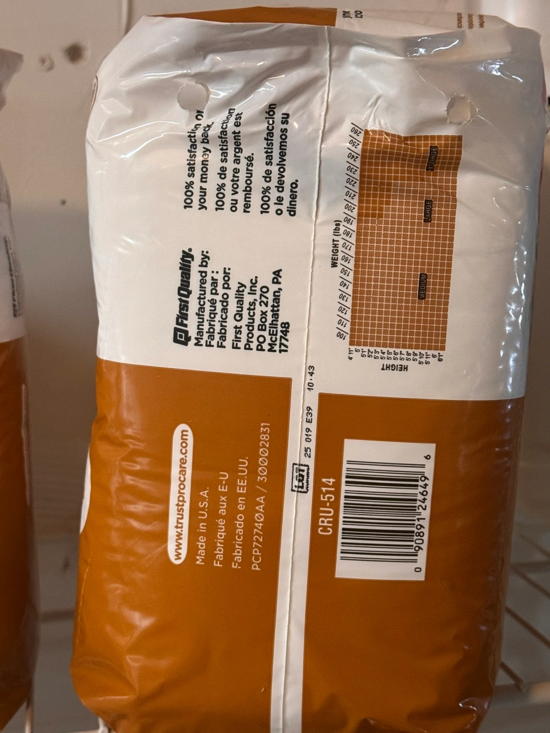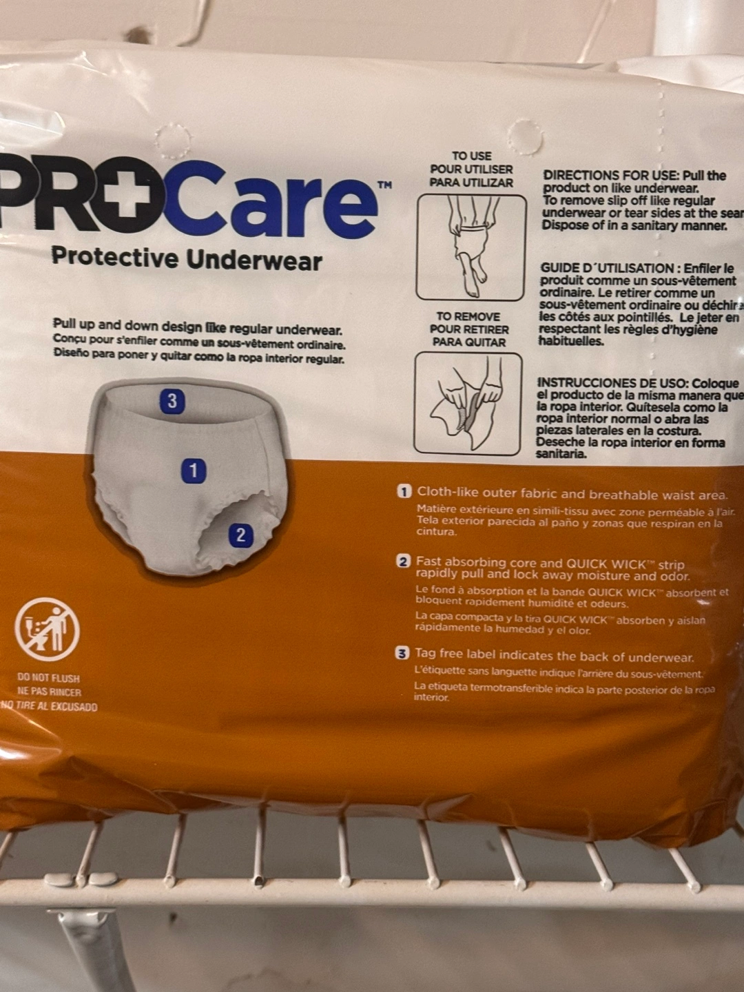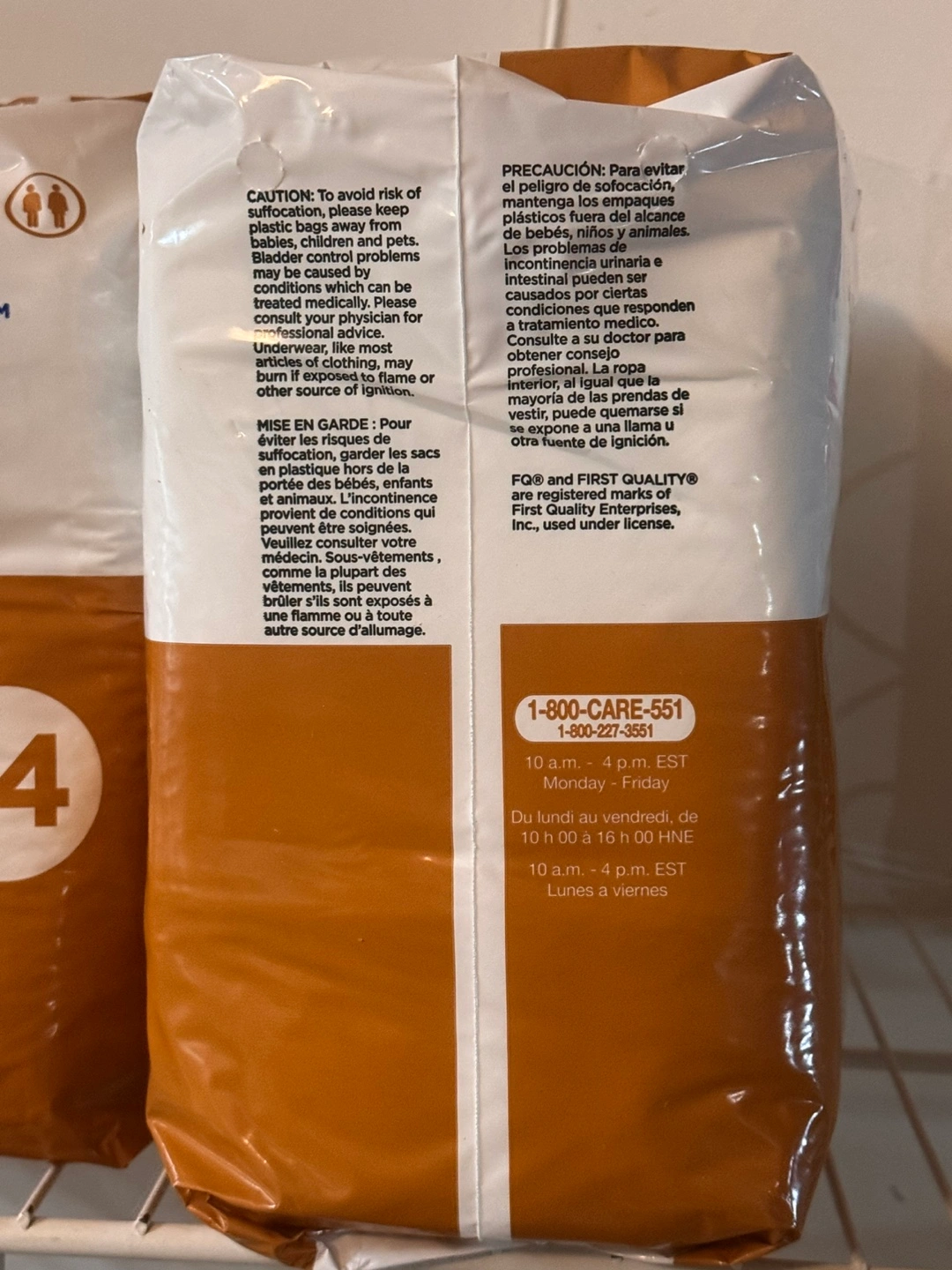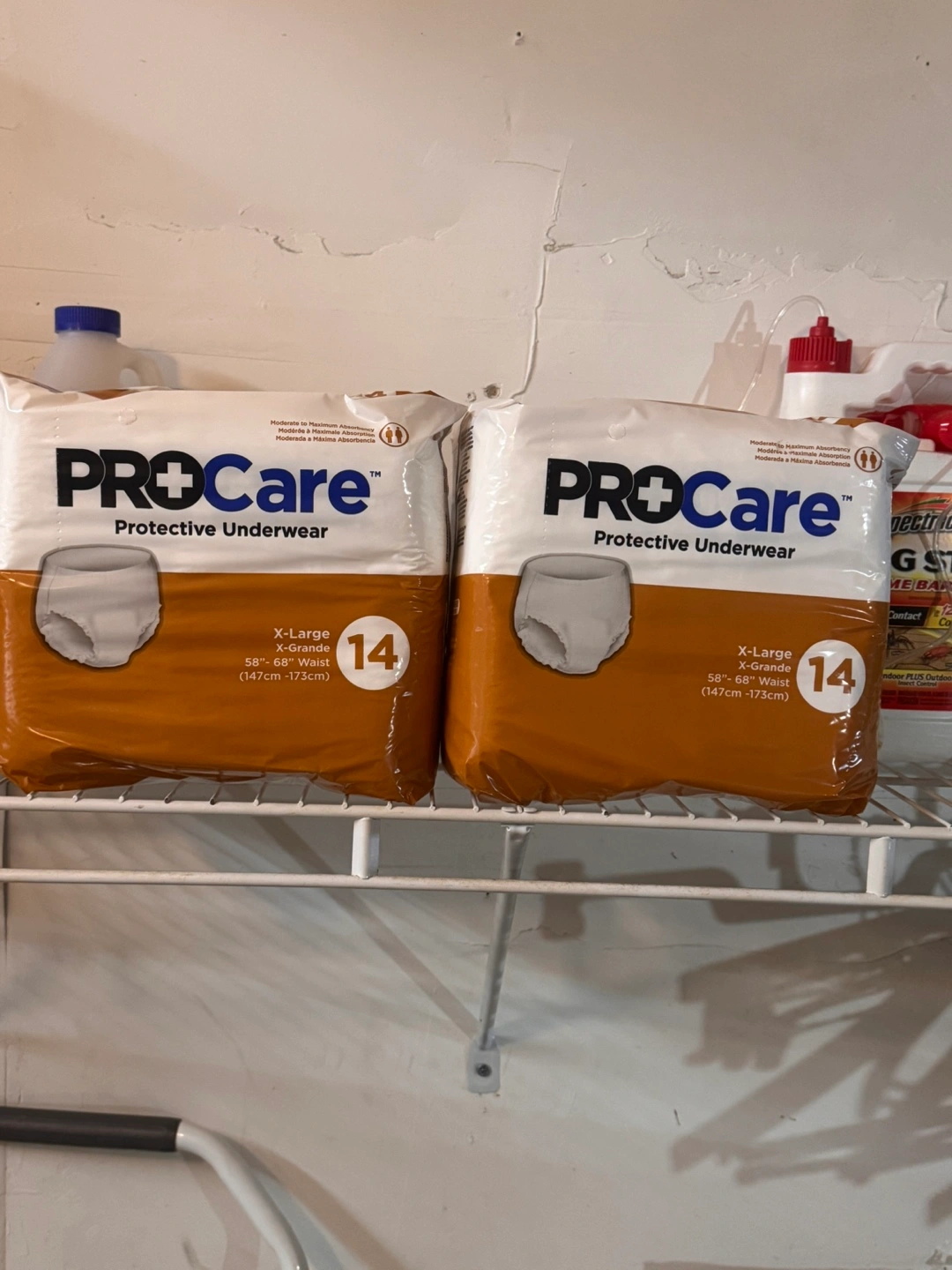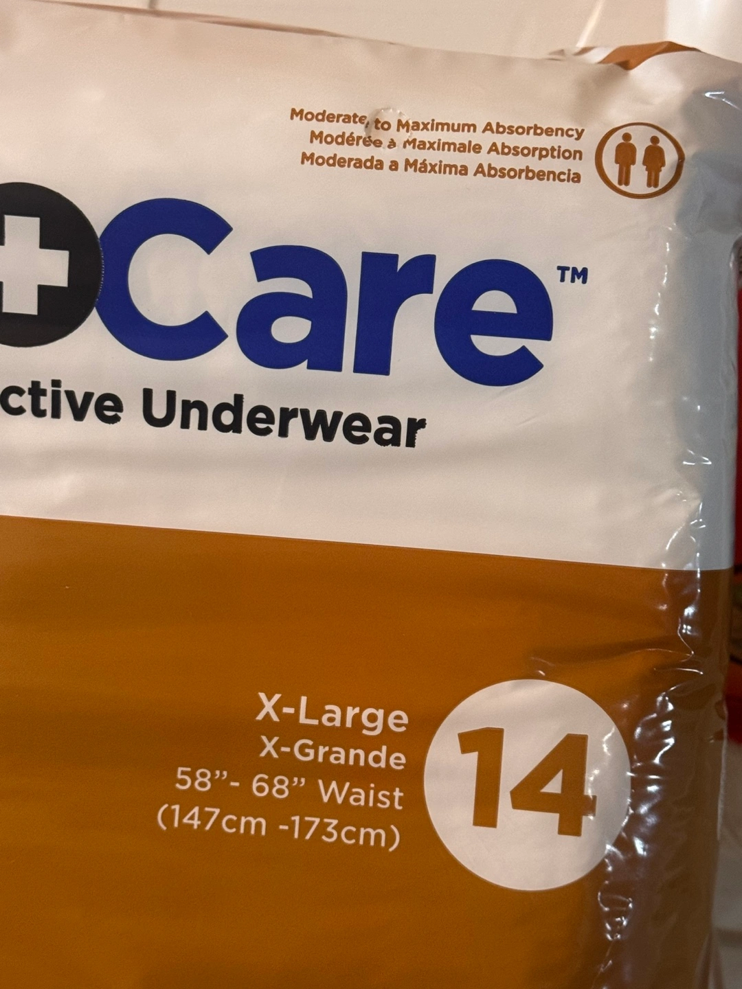 103One pack of 14 count adult protective underwear. X-Large size. Moderate to maximum absorbency. Available for local pickup by Schaumburg and Barrington Road in Schaumburg IL 60194 or shipping to your doorstep for one low price with tracking included for free. Comes from a virus free, smoke free and pet free home.